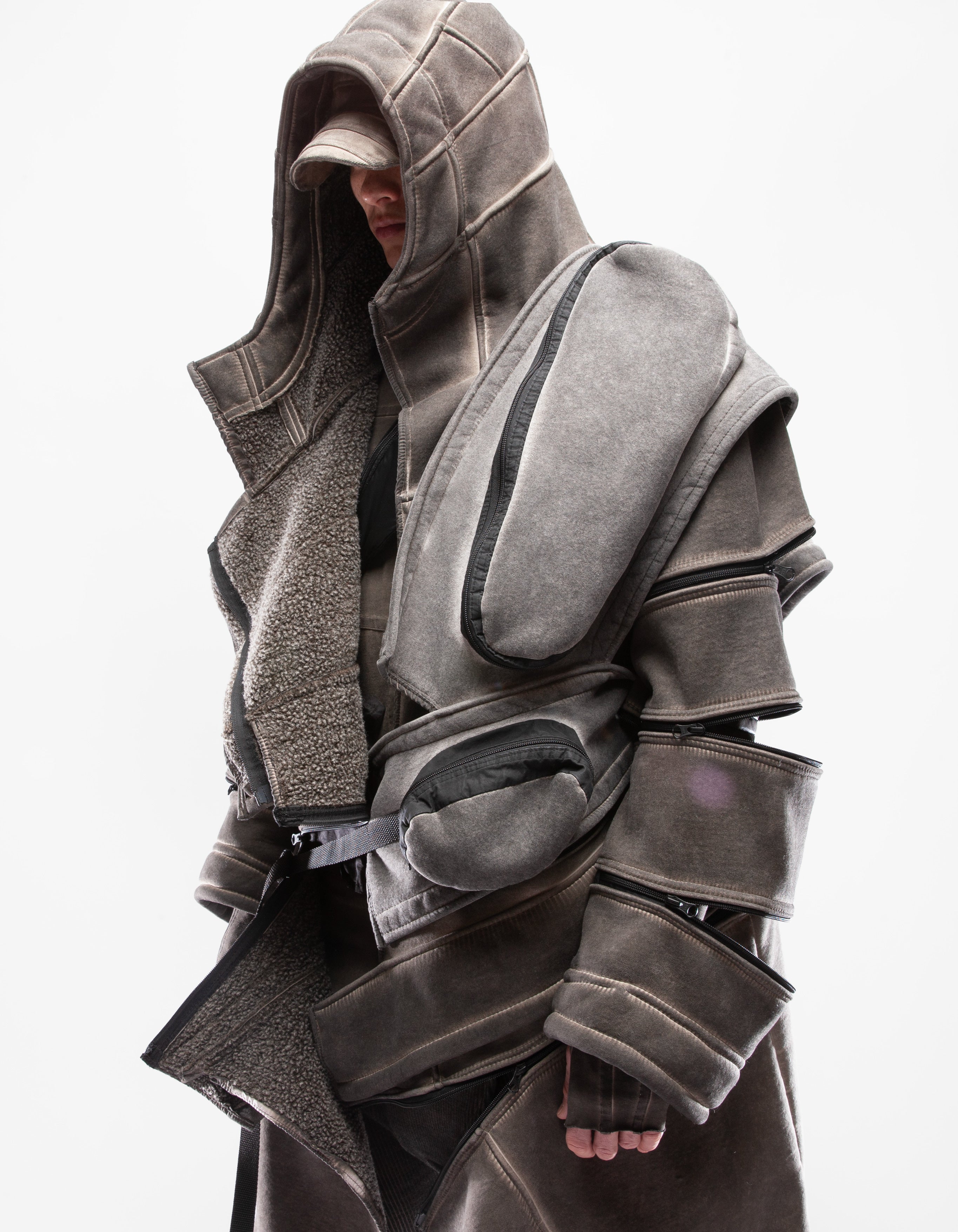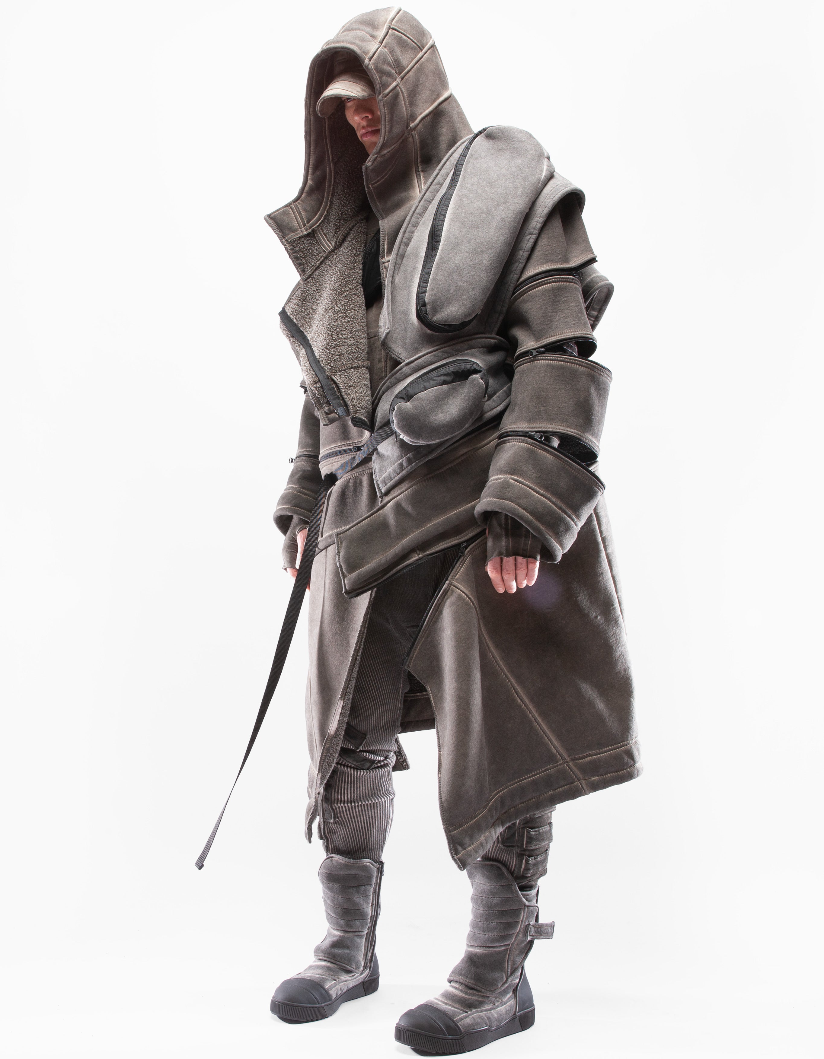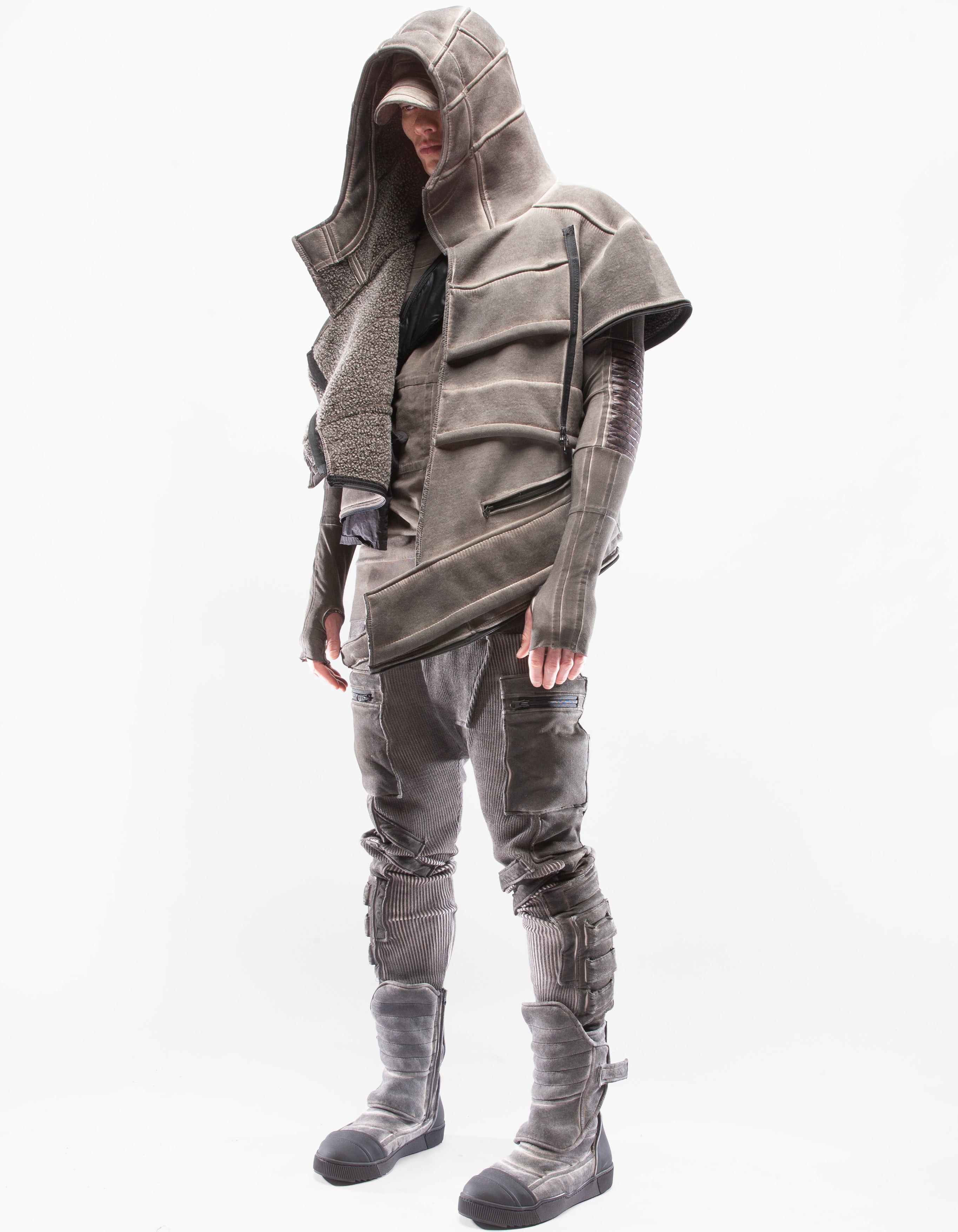 معطف بغطاء للرأس من الجلد البيئي غير المتماثل مفصل وقابل لإعادة التشكيل