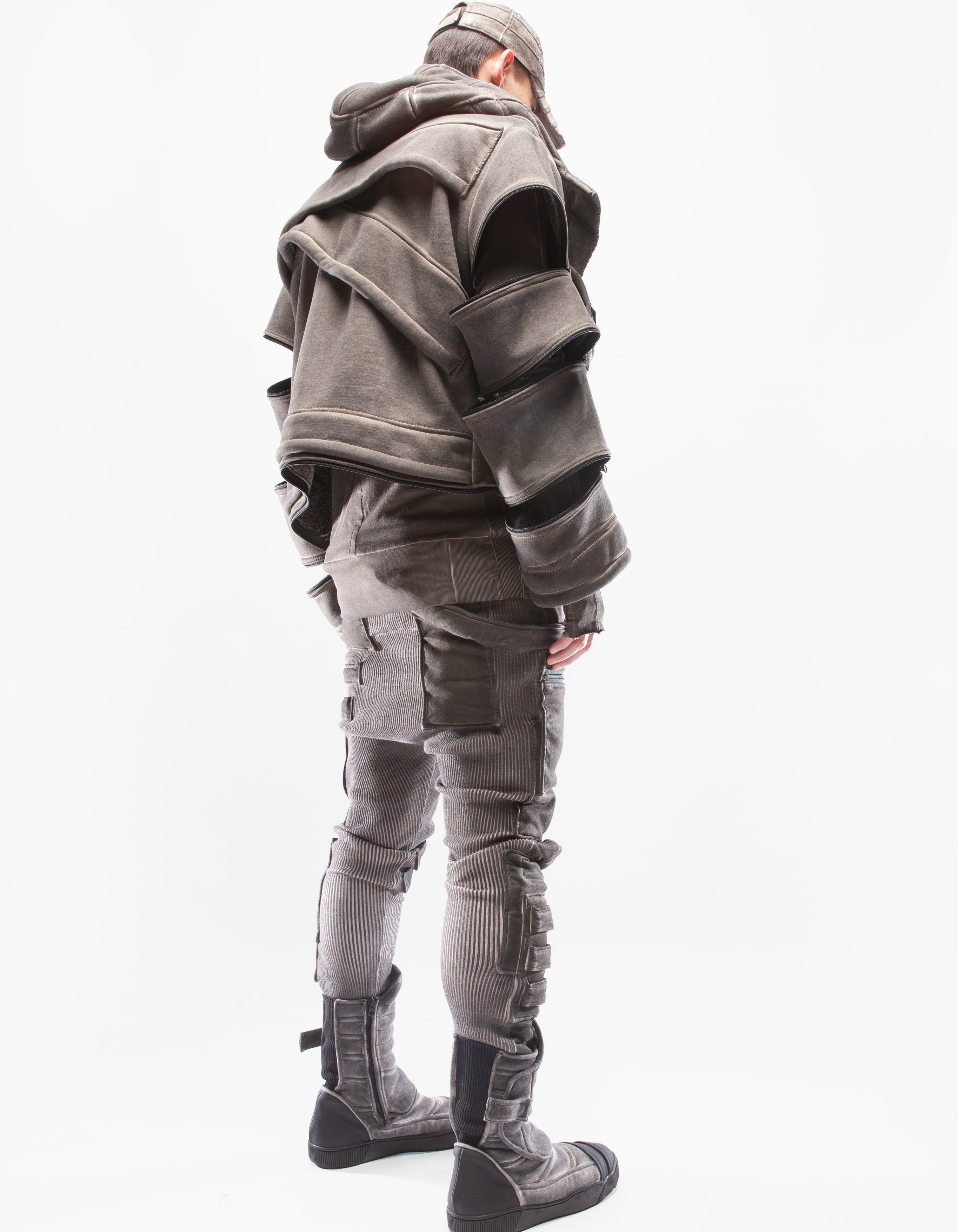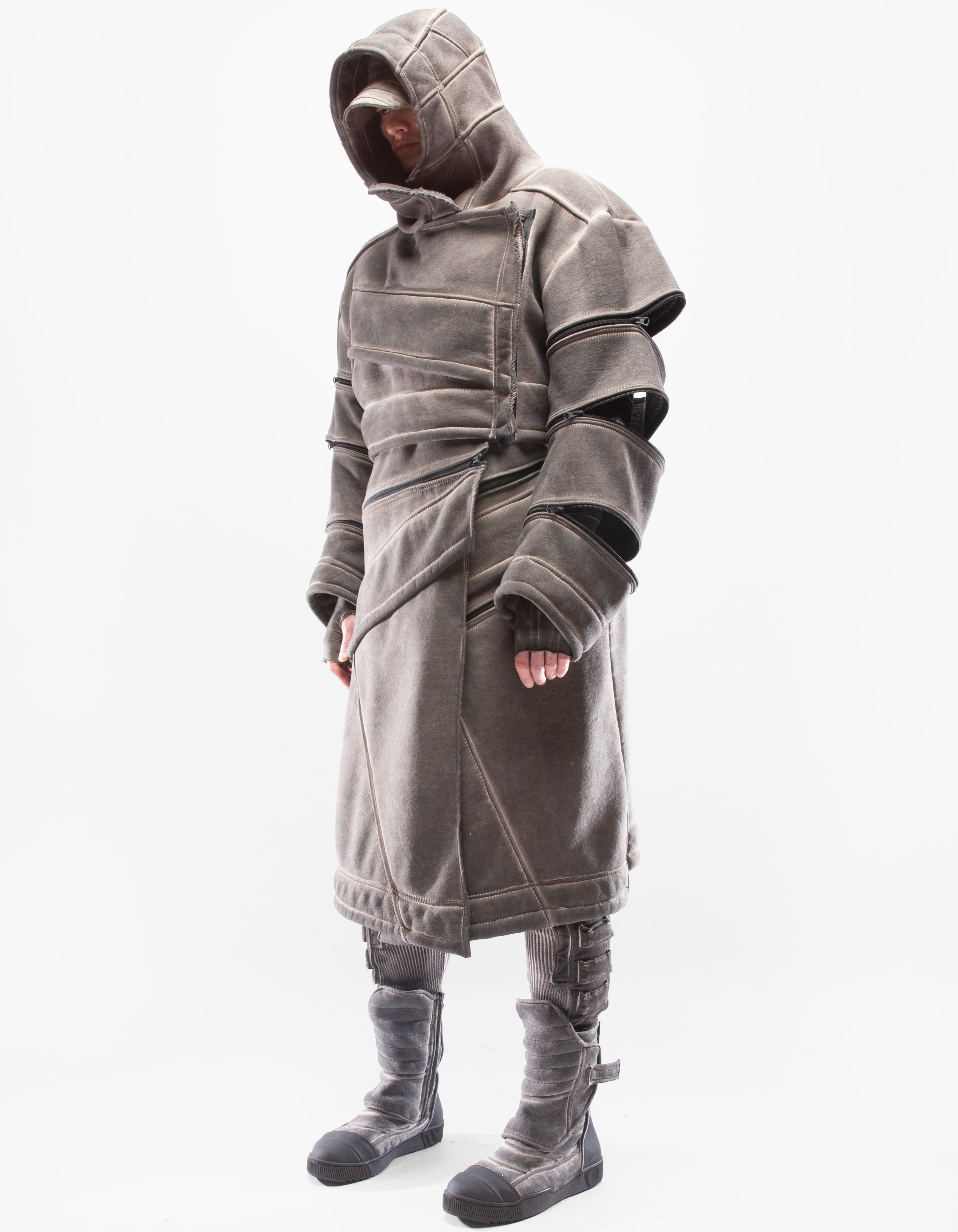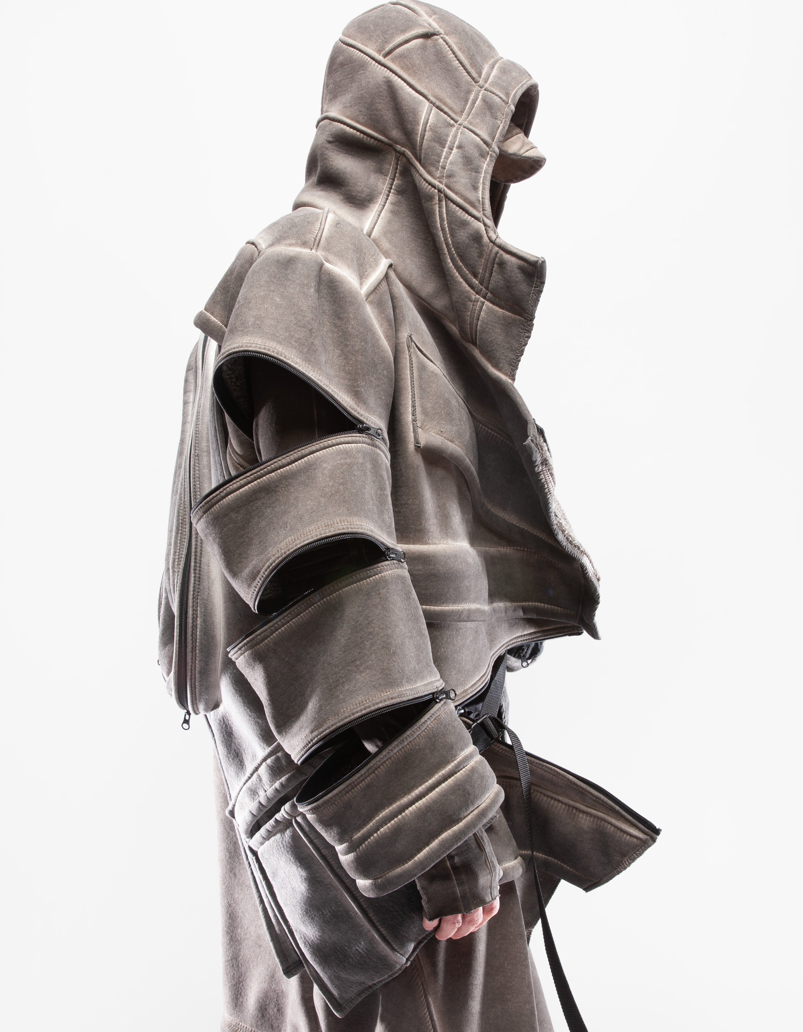 معطف بغطاء للرأس من الجلد البيئي غير المتماثل مفصل وقابل لإعادة التشكيل