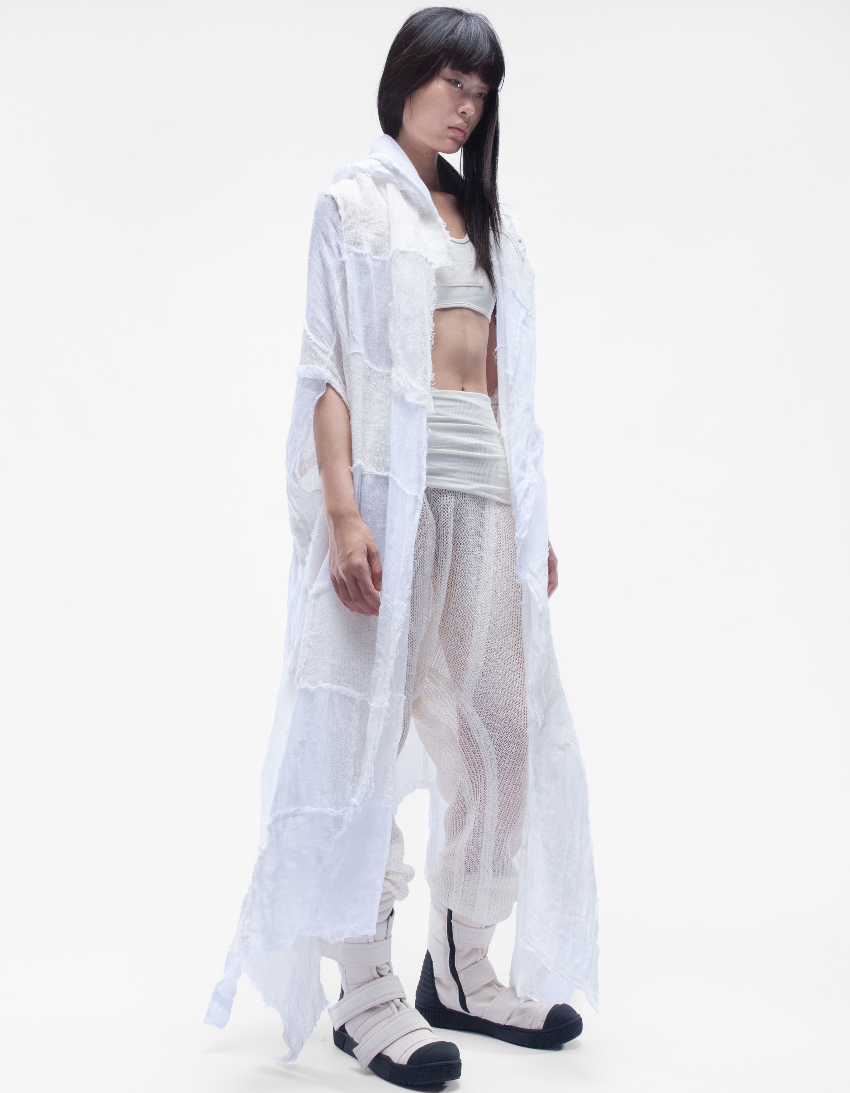 كارديغان طويل بغطاء رأس غير متماثل مصنوع من الكتان الطبيعي بتفاصيل دقيقة وبدون أكمام