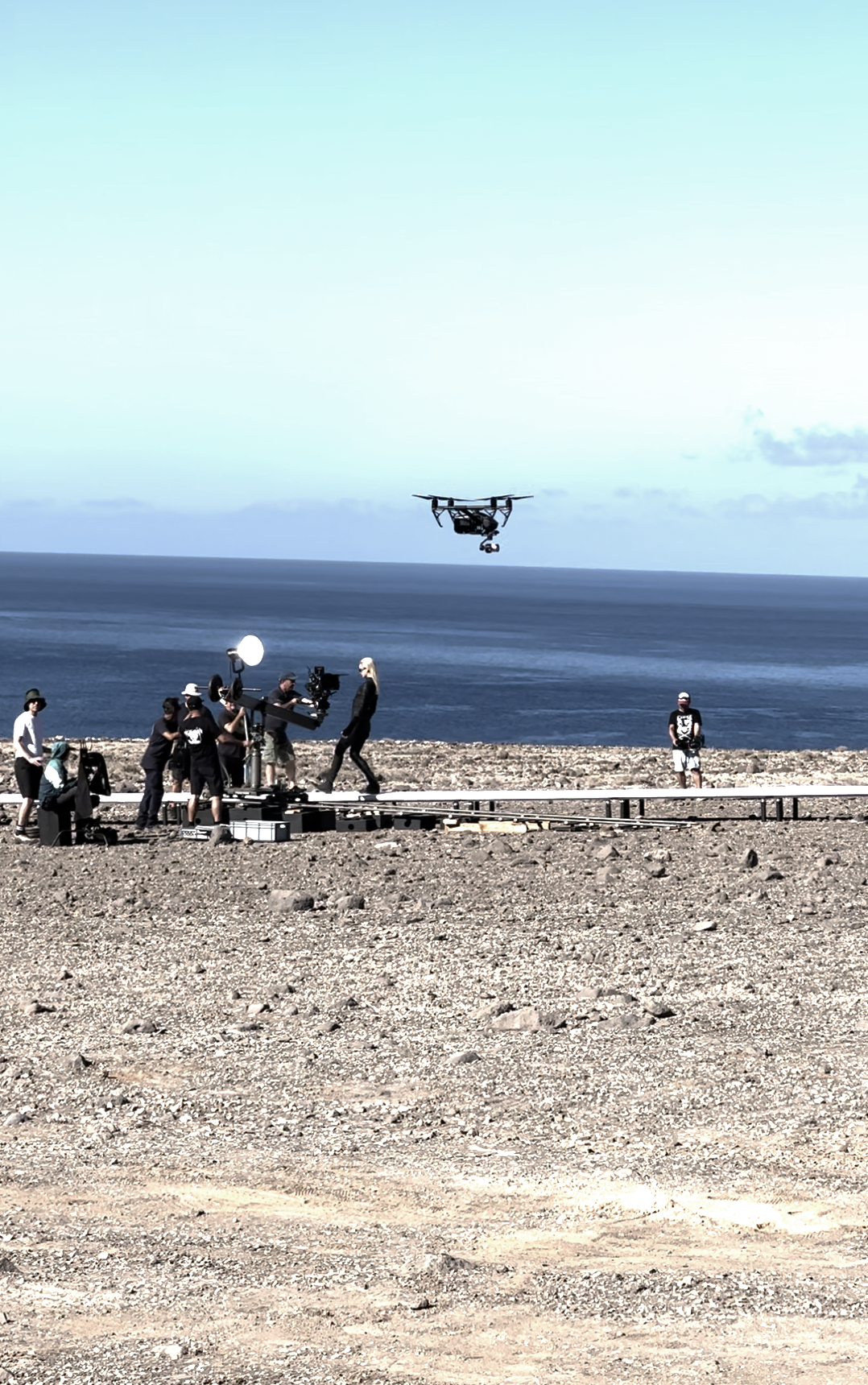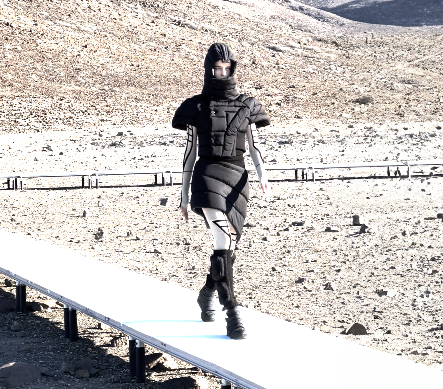 The founders of DEMOBAZA became fascinated with the location after seeing techno DJ Monika Kruse performing on the island and were quick to hop on a plane from their home base in Ibiza and do a shoot on the rocky slopes of Fuerteventura. A year later, DEMOBAZA and a local production team constructed the angular runway as a shape from above and transformed the surroundings as a sparse, desert and rocky terrain for the formal collection.
