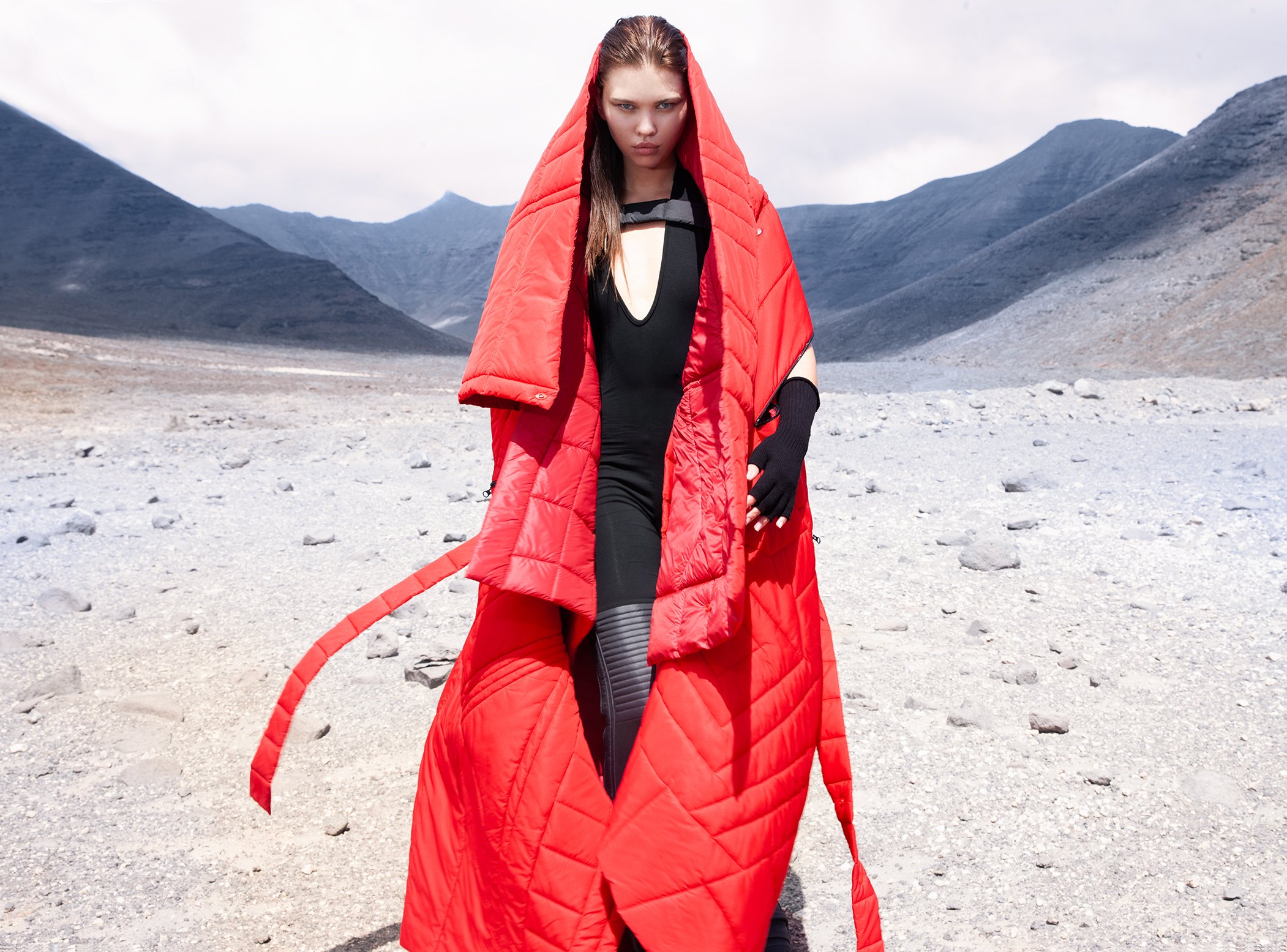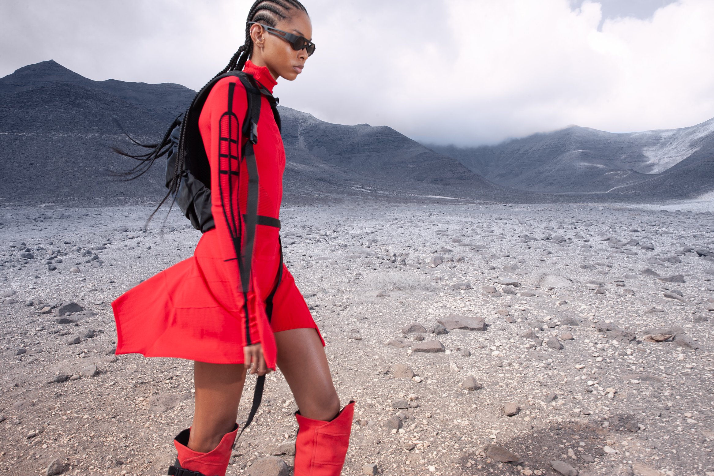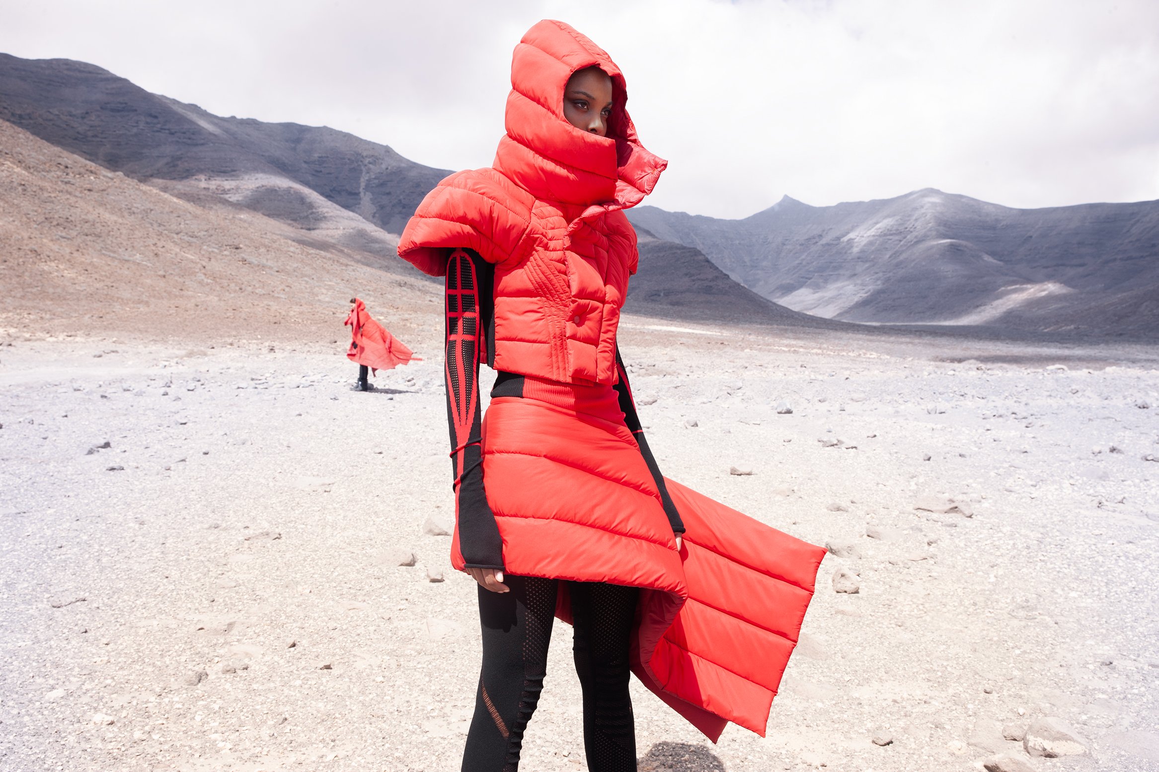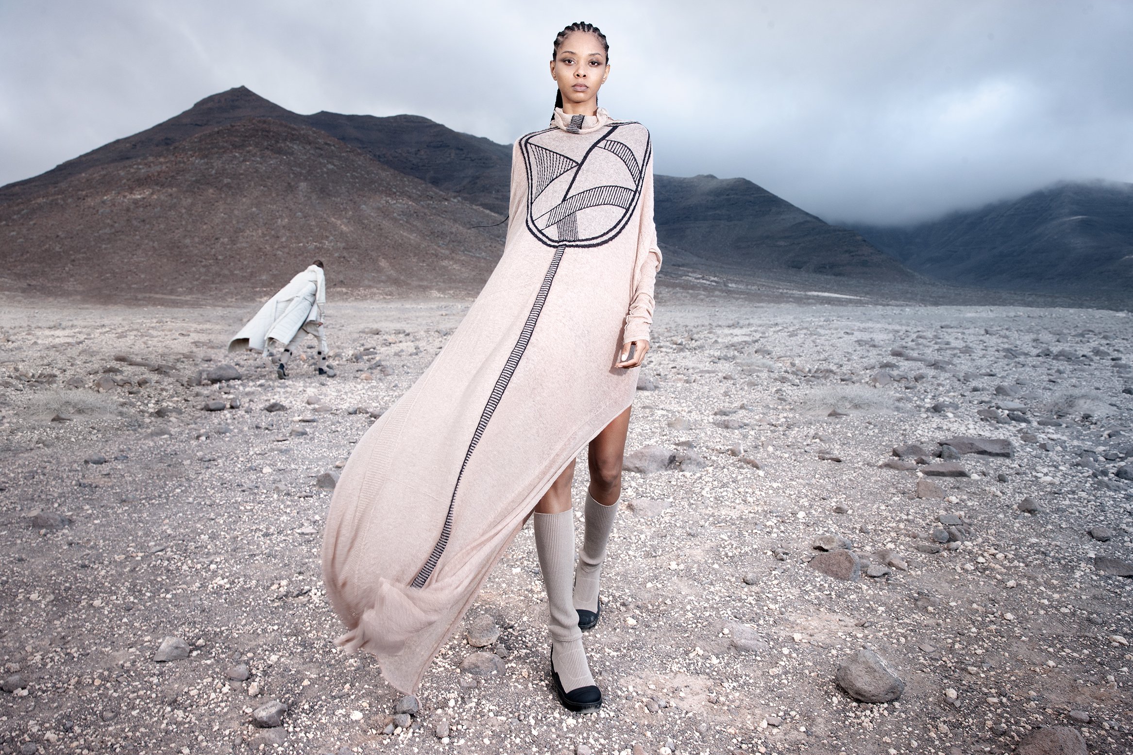 Within the collection, quilted jackets, made from plush velvet and cotton, feature hand-quilted futuristic patterns, adding to their inner strength and power. These jackets sport a vibrant futuristic appearance reminiscent of space suits from the future. Complemented by delicate and ethereal knits adorned with symbols woven from an endless transparent ether, such as chiffon and wax-coated denim for jumpsuits and pants, these pieces complete the strong and compelling look. Elastic knits with graphic and minimalist contrasting graphics correspond and enhance the overall impact.