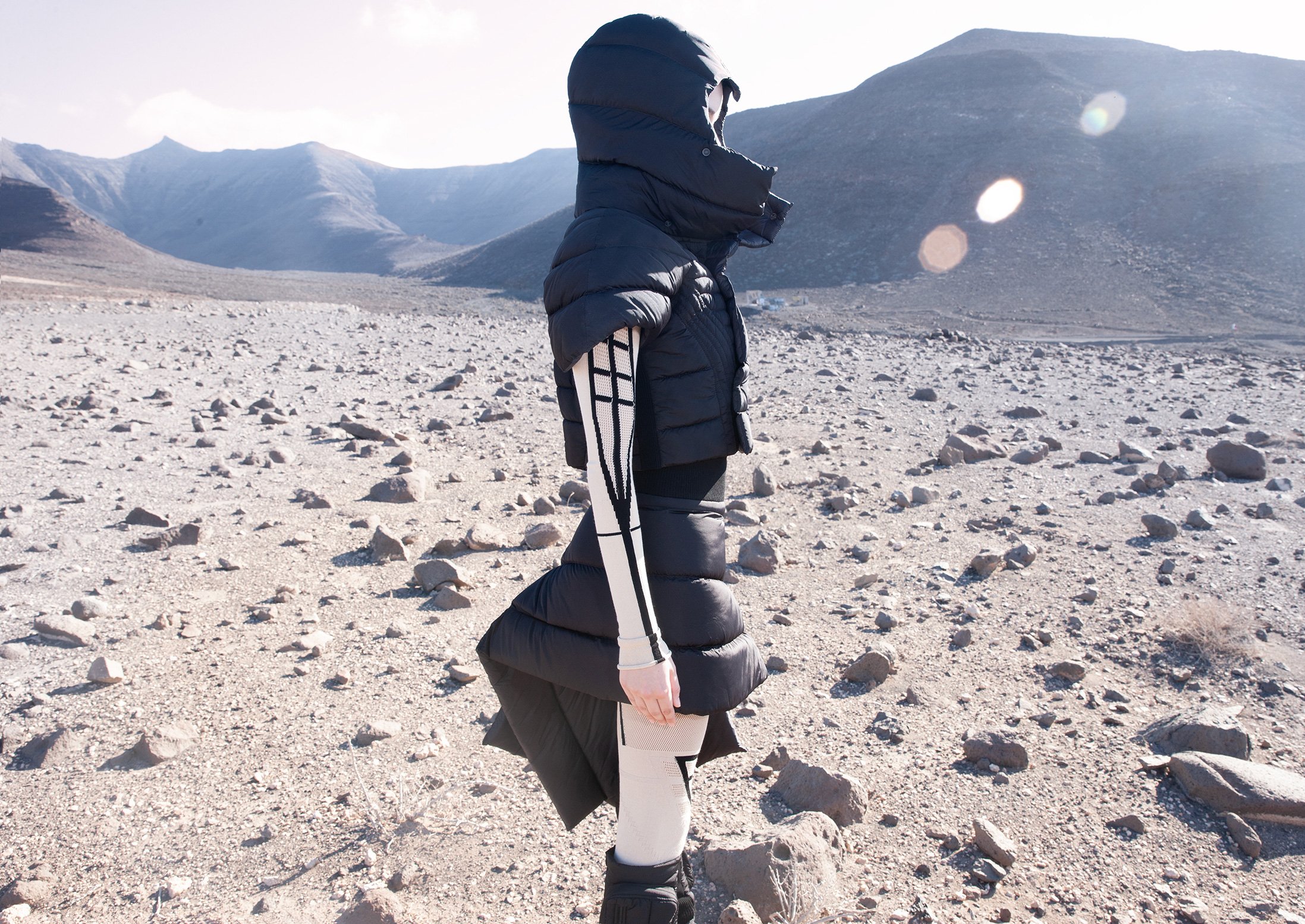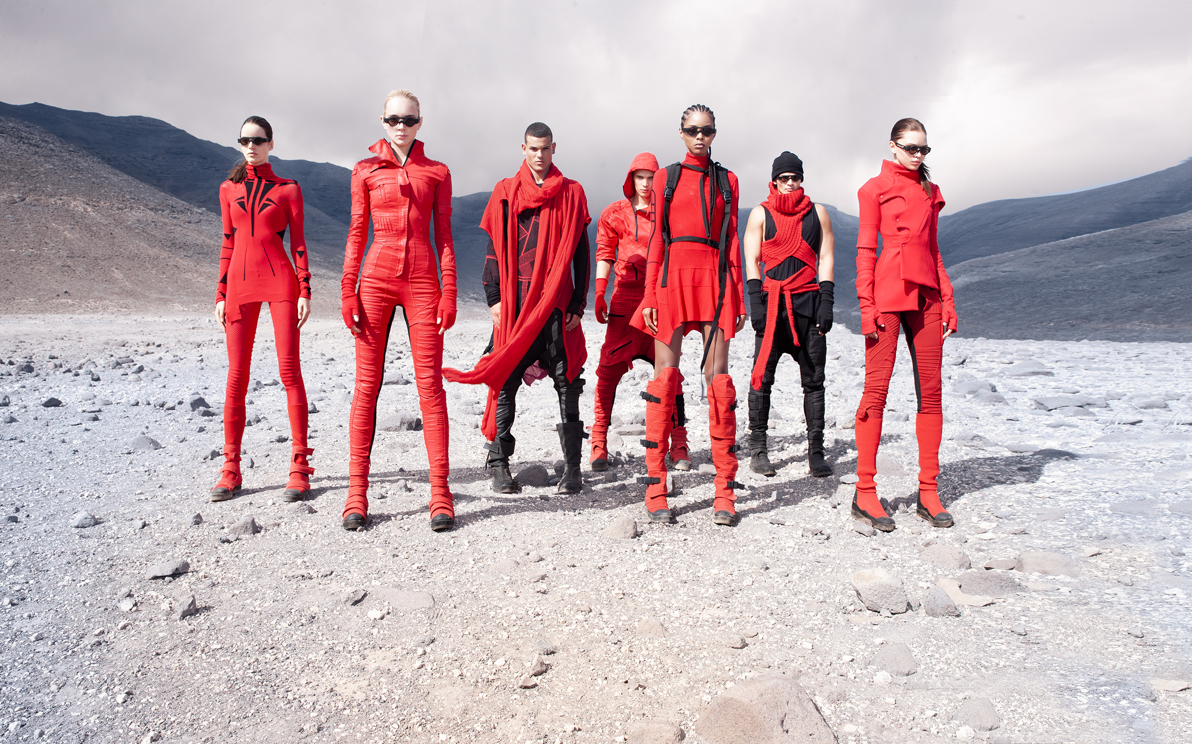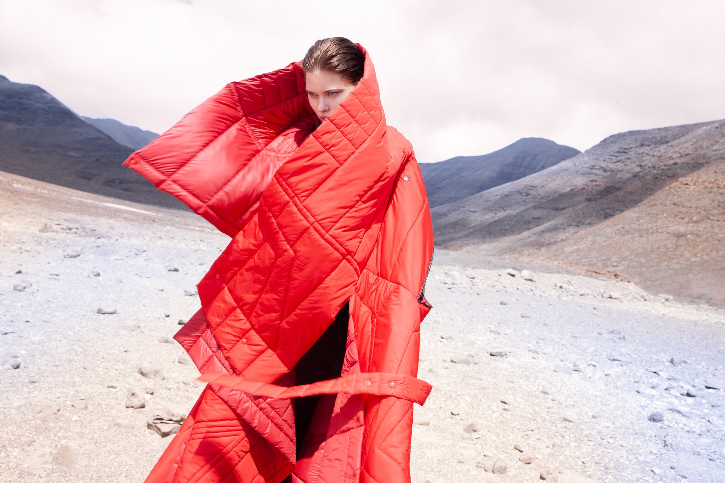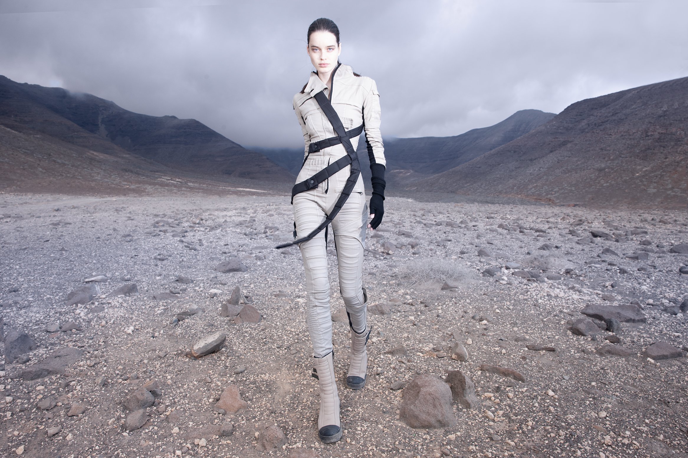 Within the collection, quilted jackets, made from plush velvet and cotton, feature hand-quilted futuristic patterns, adding to their inner strength and power. These jackets sport a vibrant futuristic appearance reminiscent of space suits from the future. Complemented by delicate and ethereal knits adorned with symbols woven from an endless transparent ether, such as chiffon and wax-coated denim for jumpsuits and pants, these pieces complete the strong and compelling look. Elastic knits with graphic and minimalist contrasting graphics correspond and enhance the overall impact.