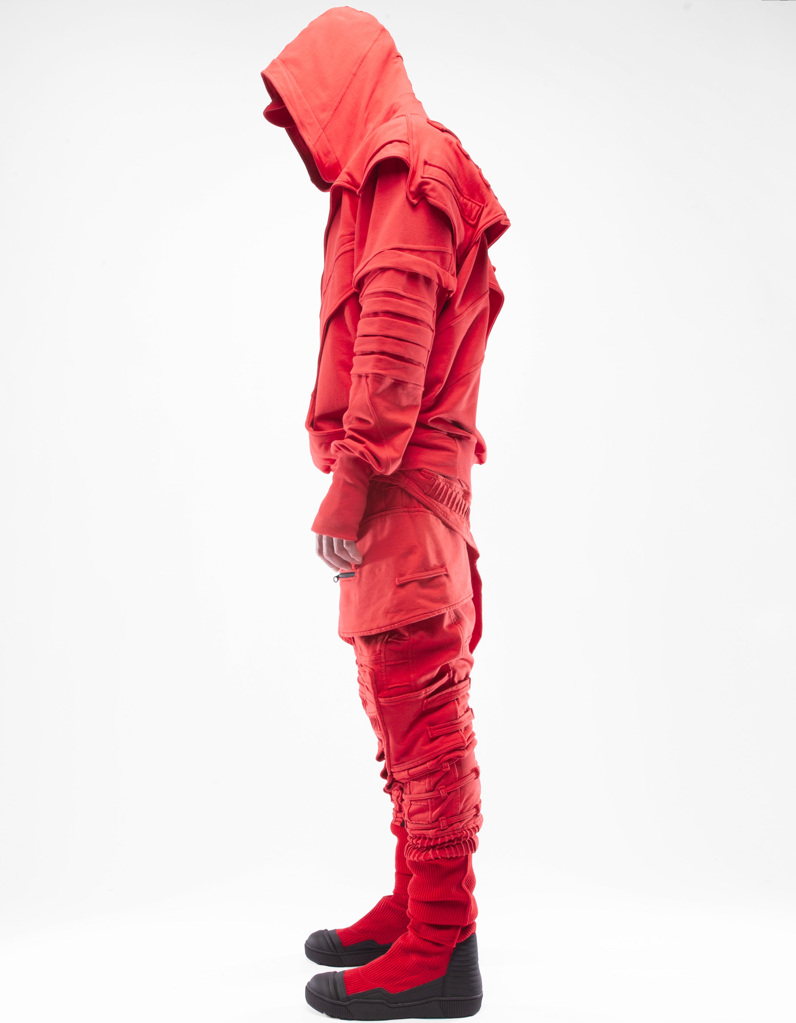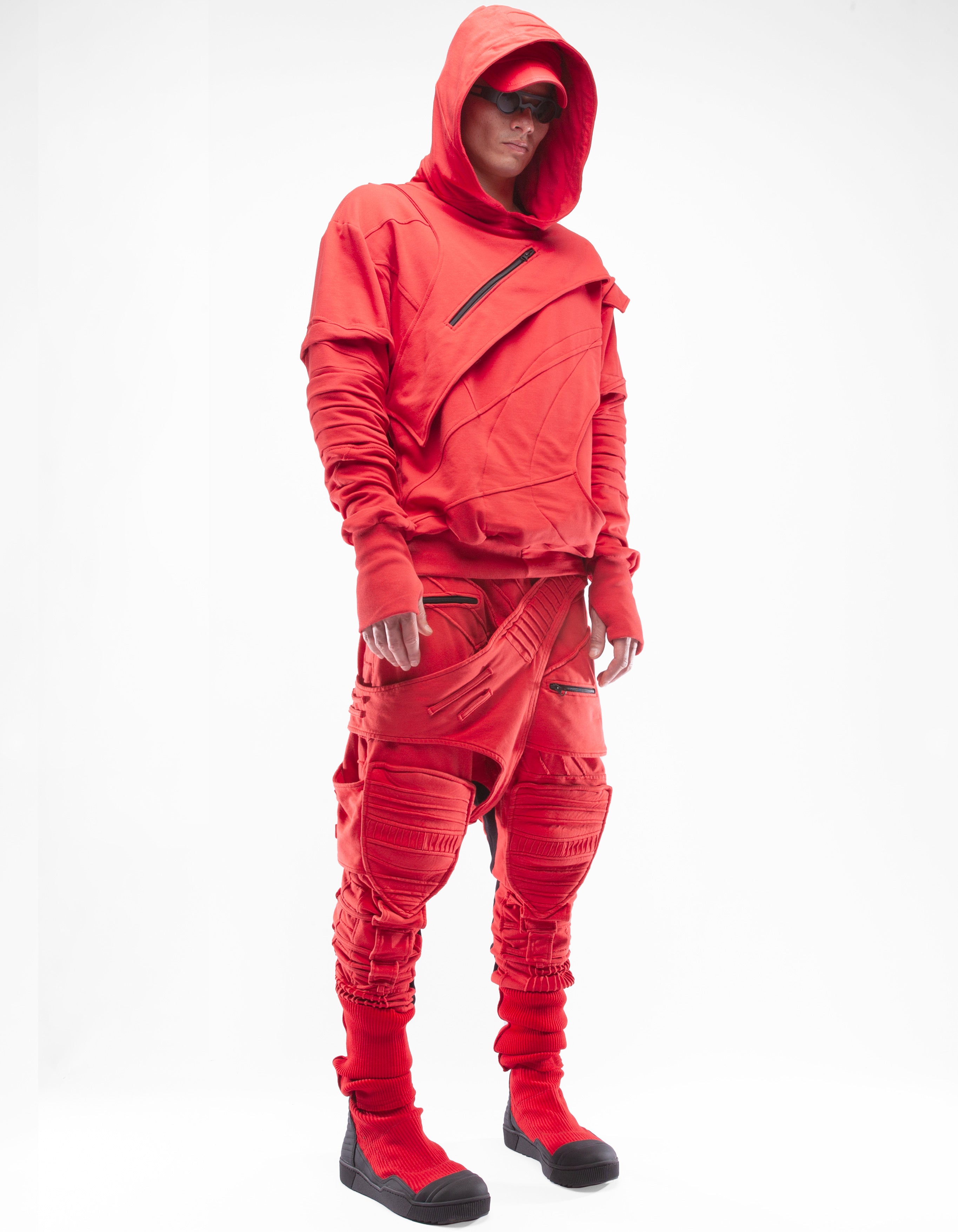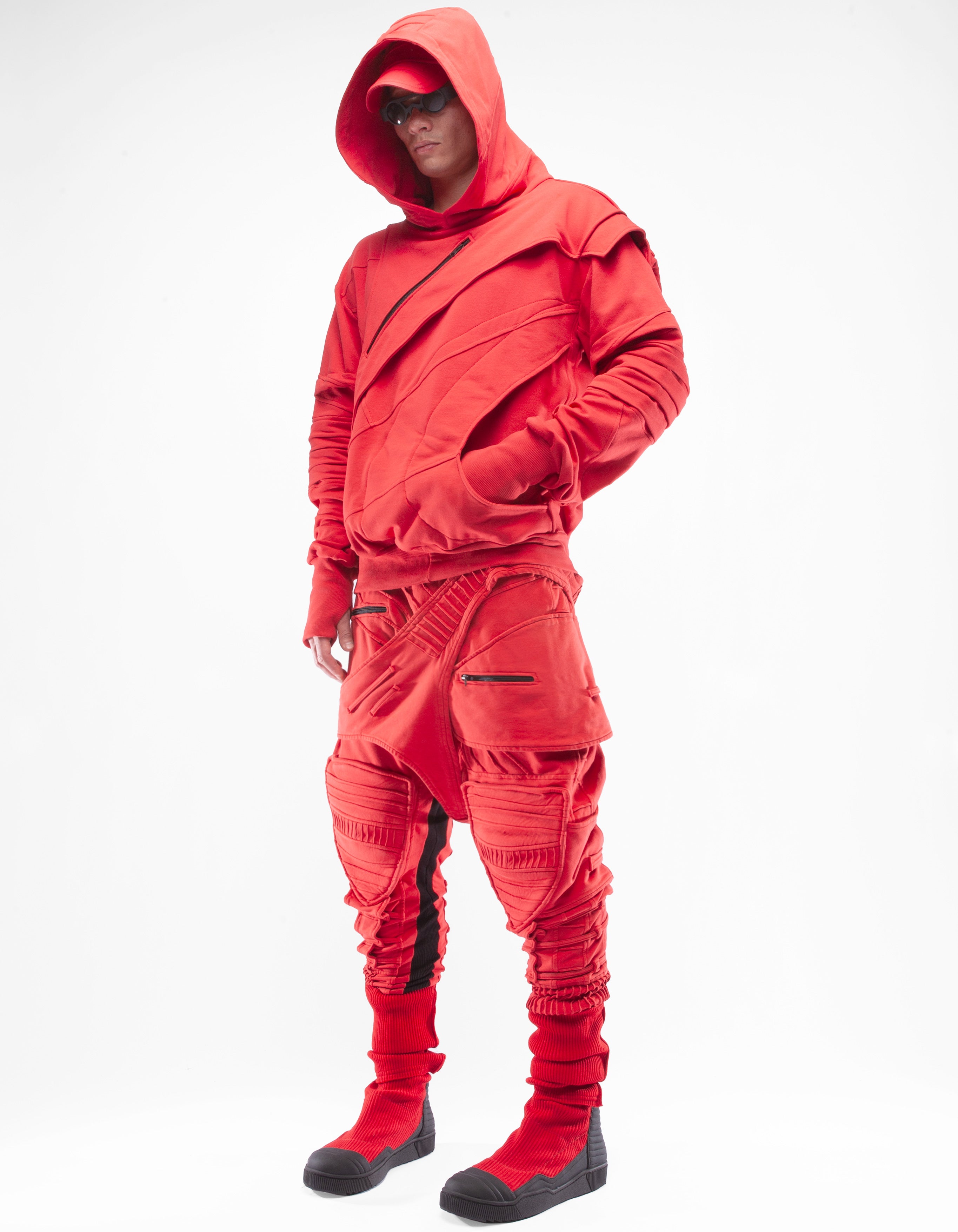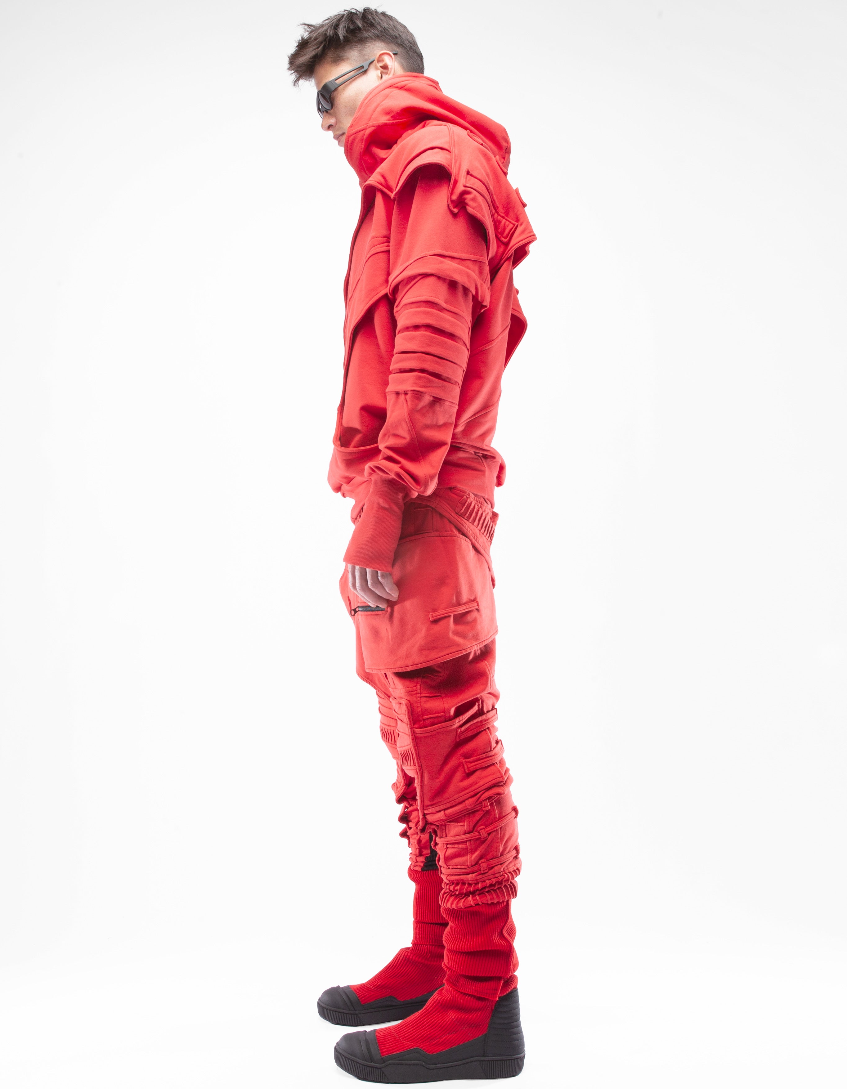 Detaillierte mehrlagige Fleece-Kapuzenjacke mit Fingerripp-Ärmeln und Reißverschlusstasche vorne