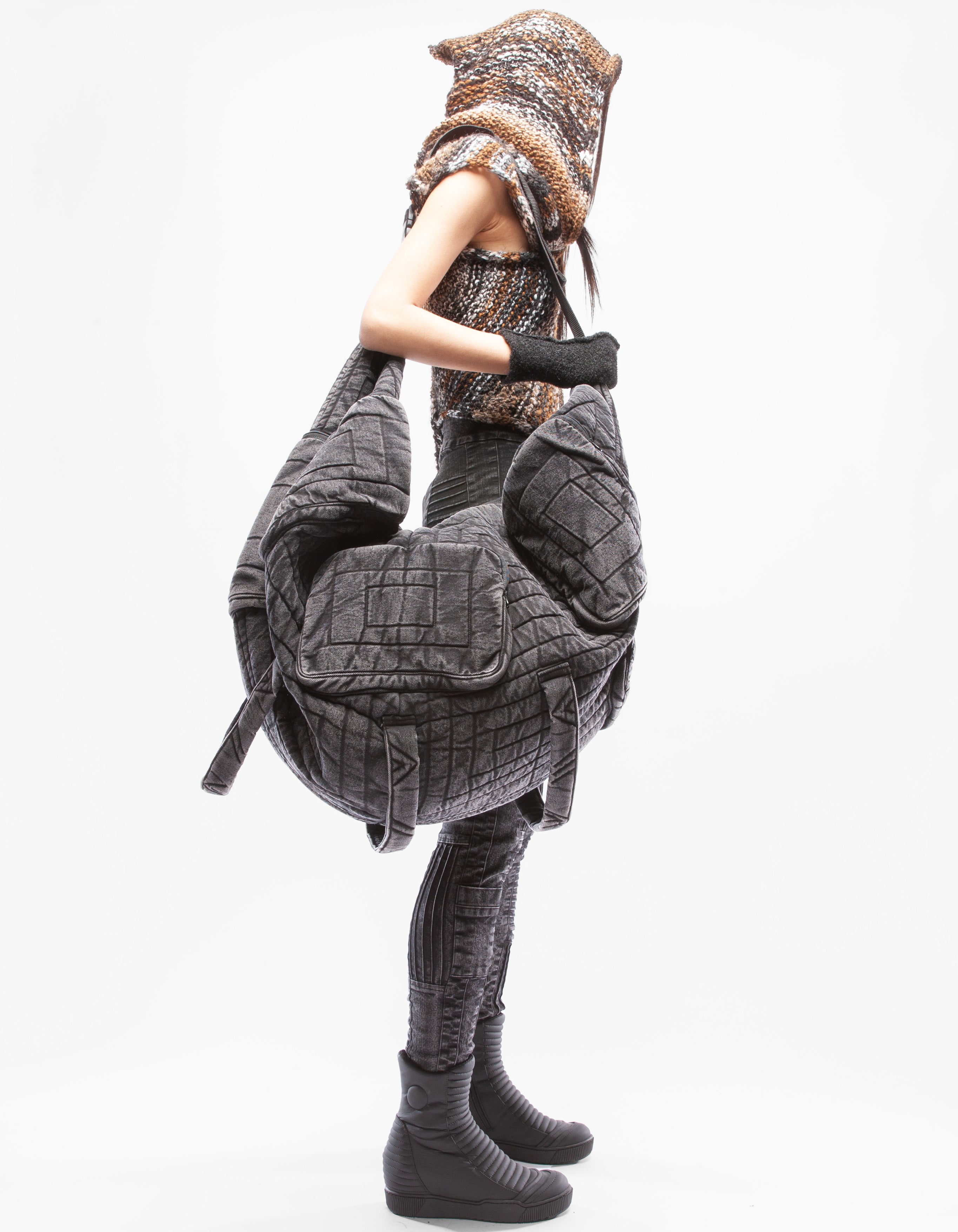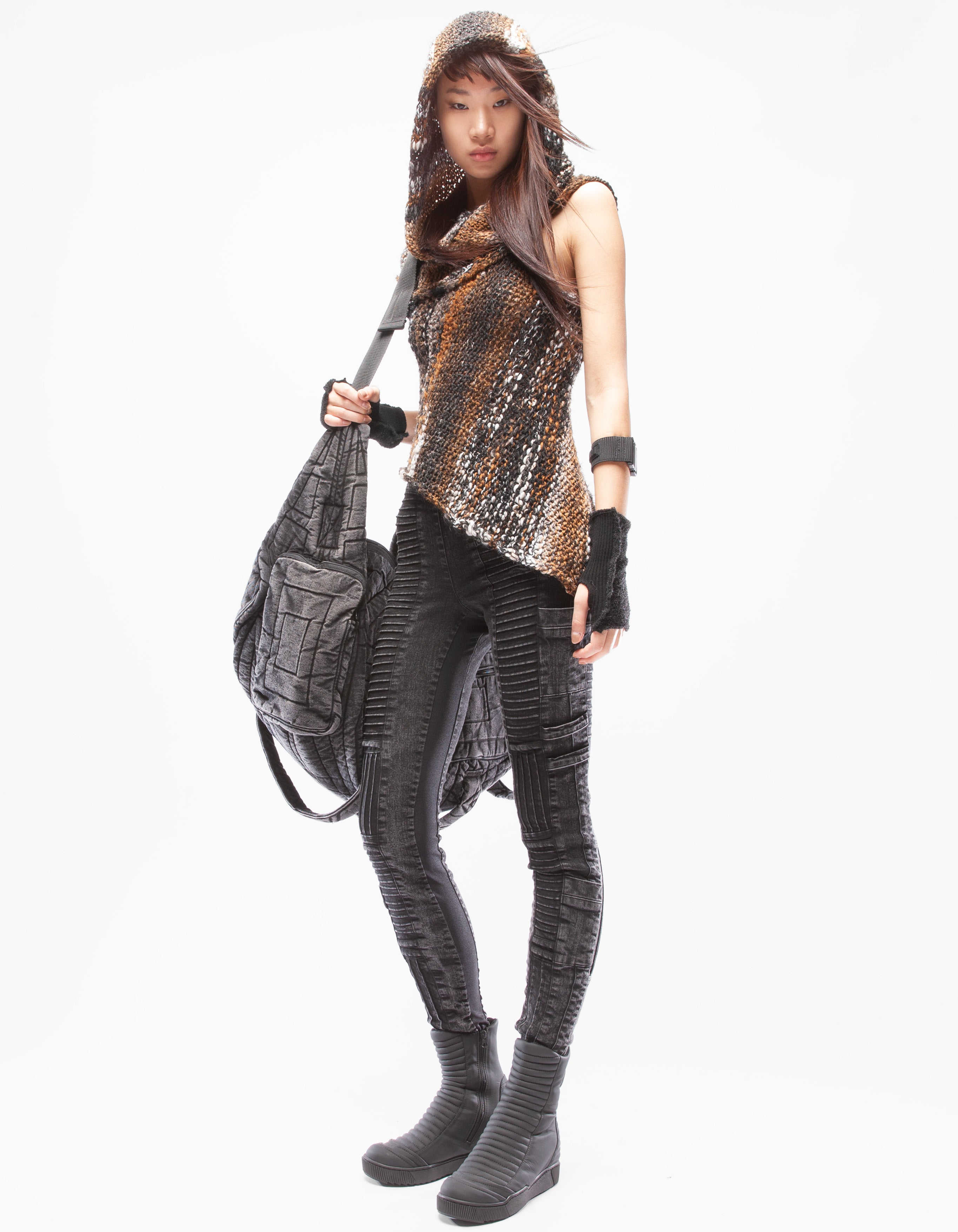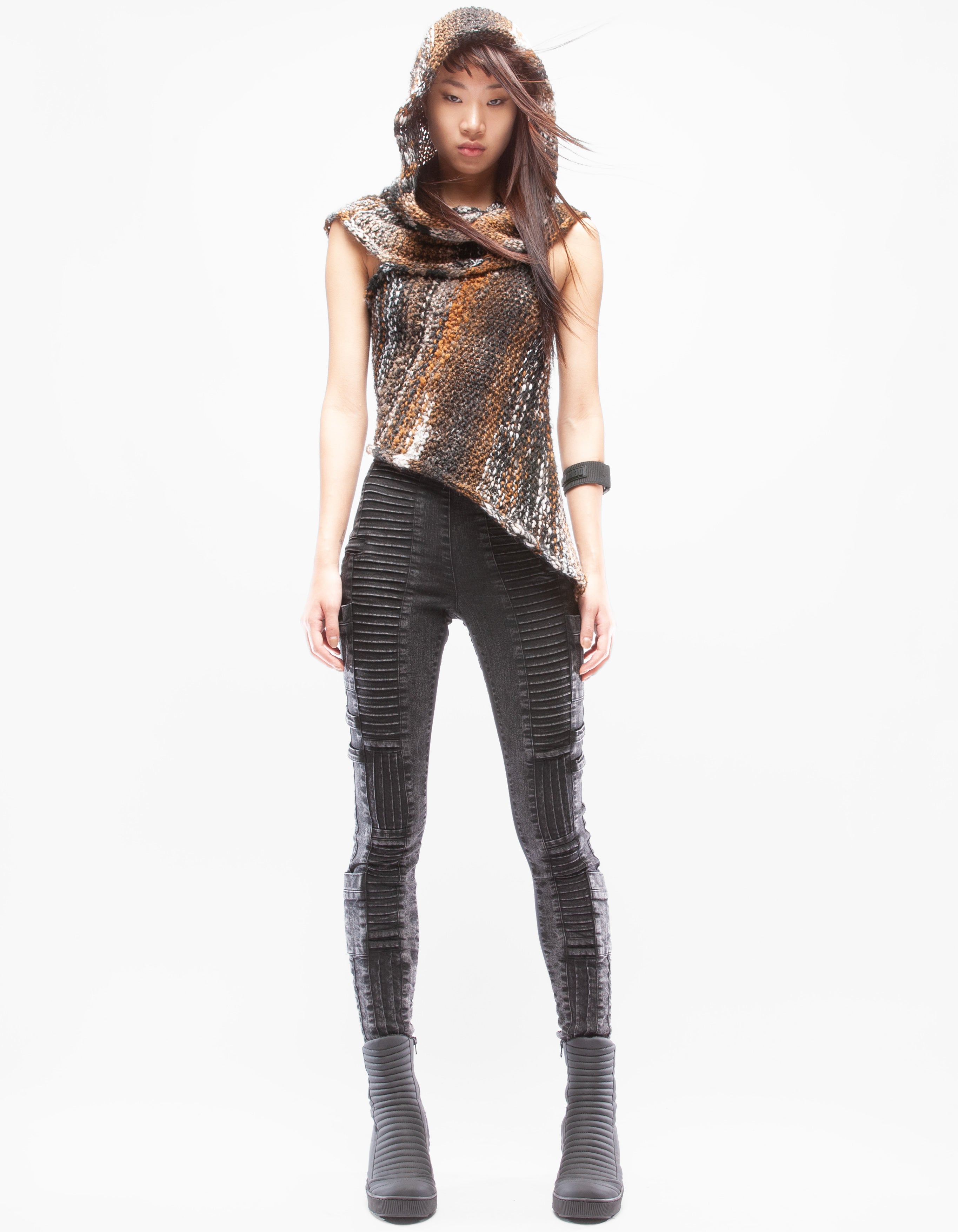 detaillierter, dick gestrickter, ärmelloser, asymmetrischer Pullover mit Kapuze