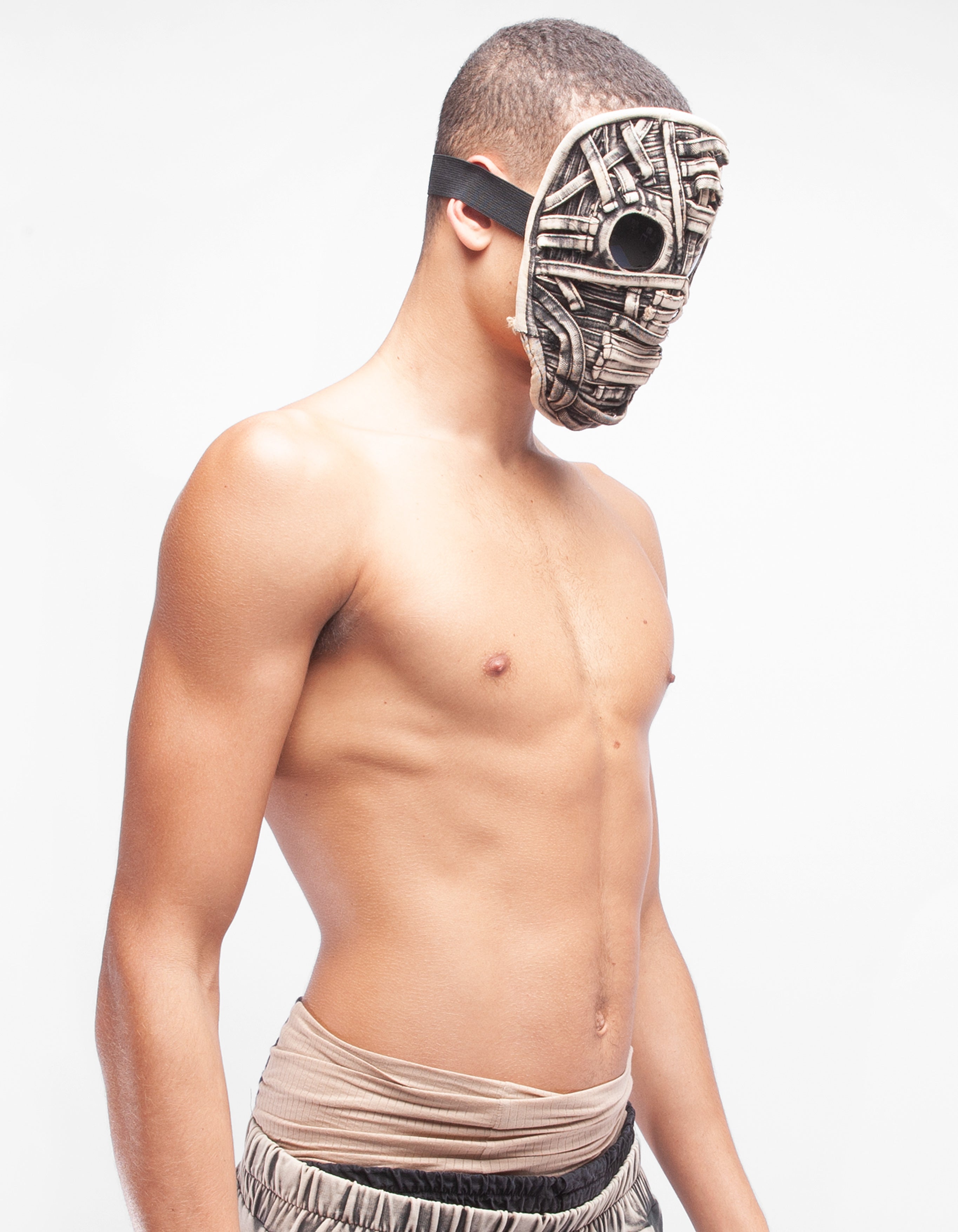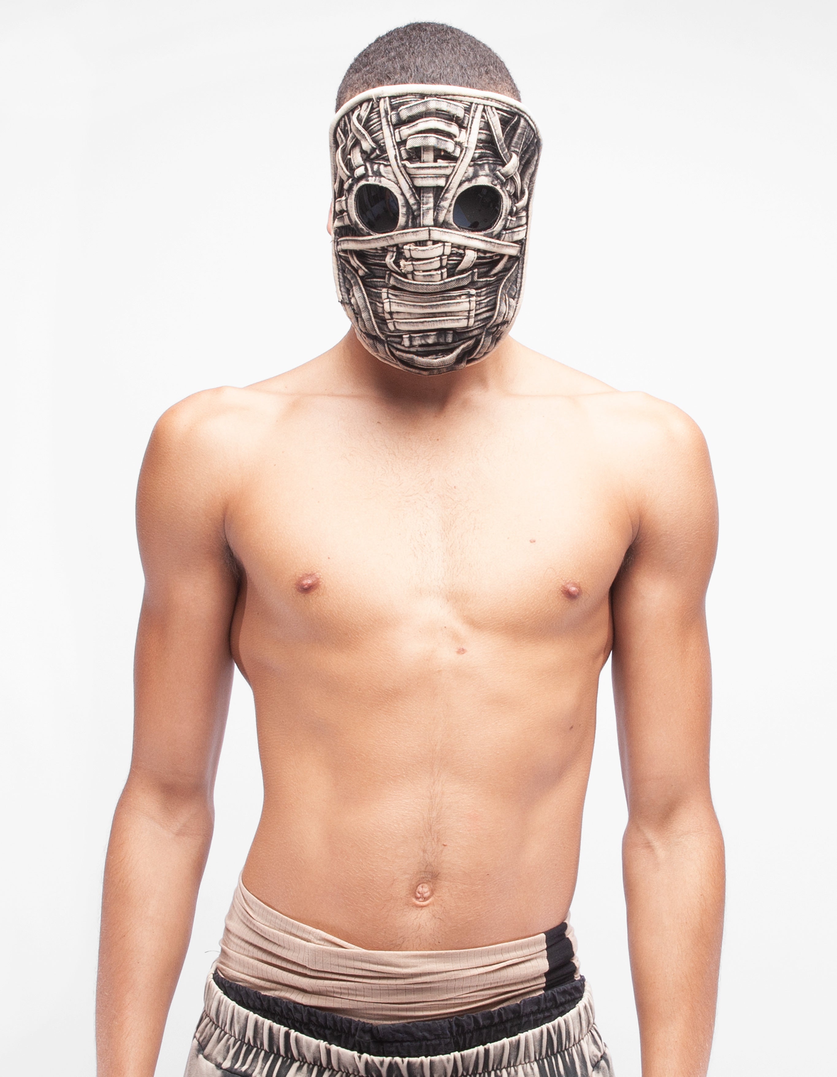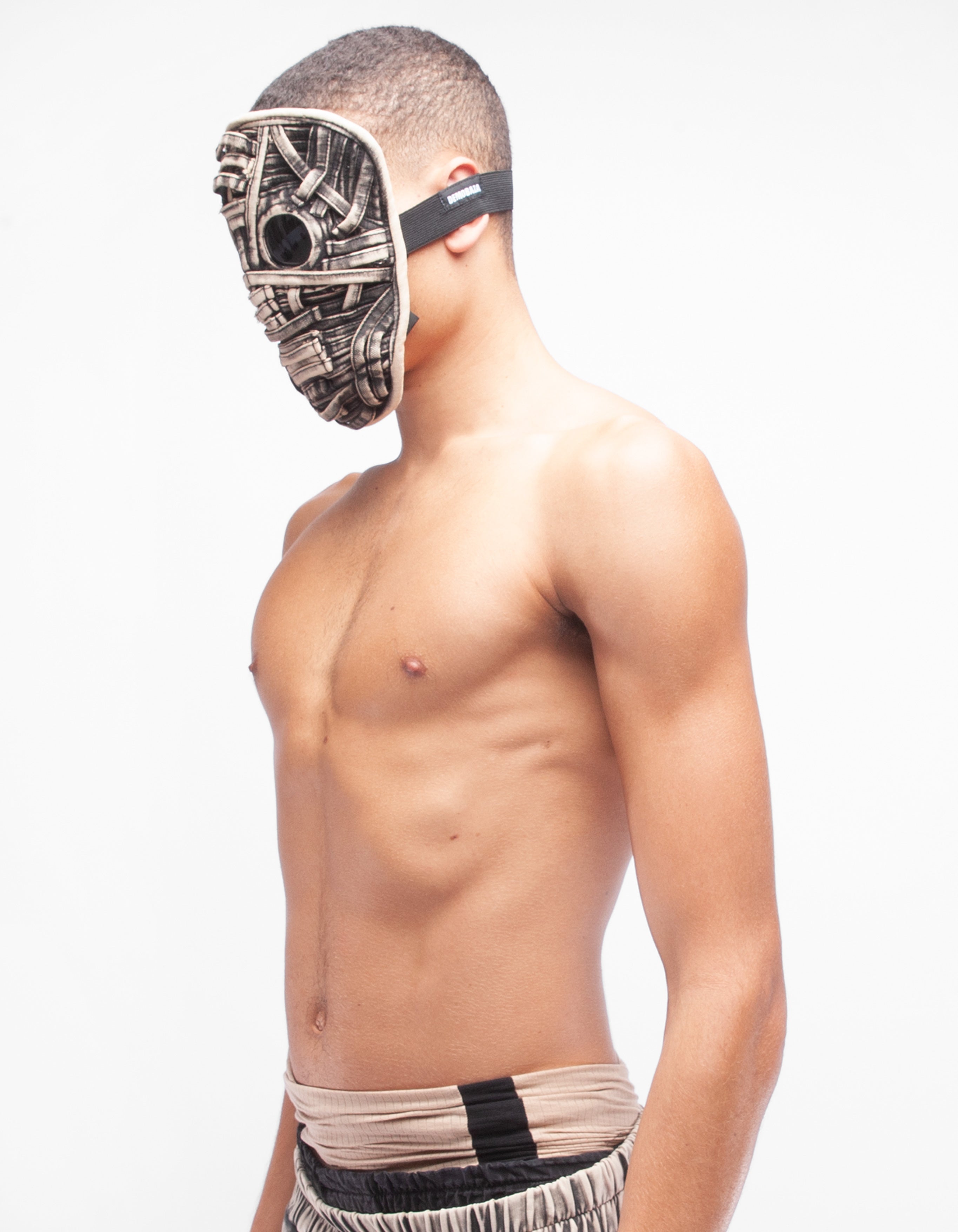 Extrem detaillierte Ganzgesichtsmaske aus elastischem Denim mit Gläsern