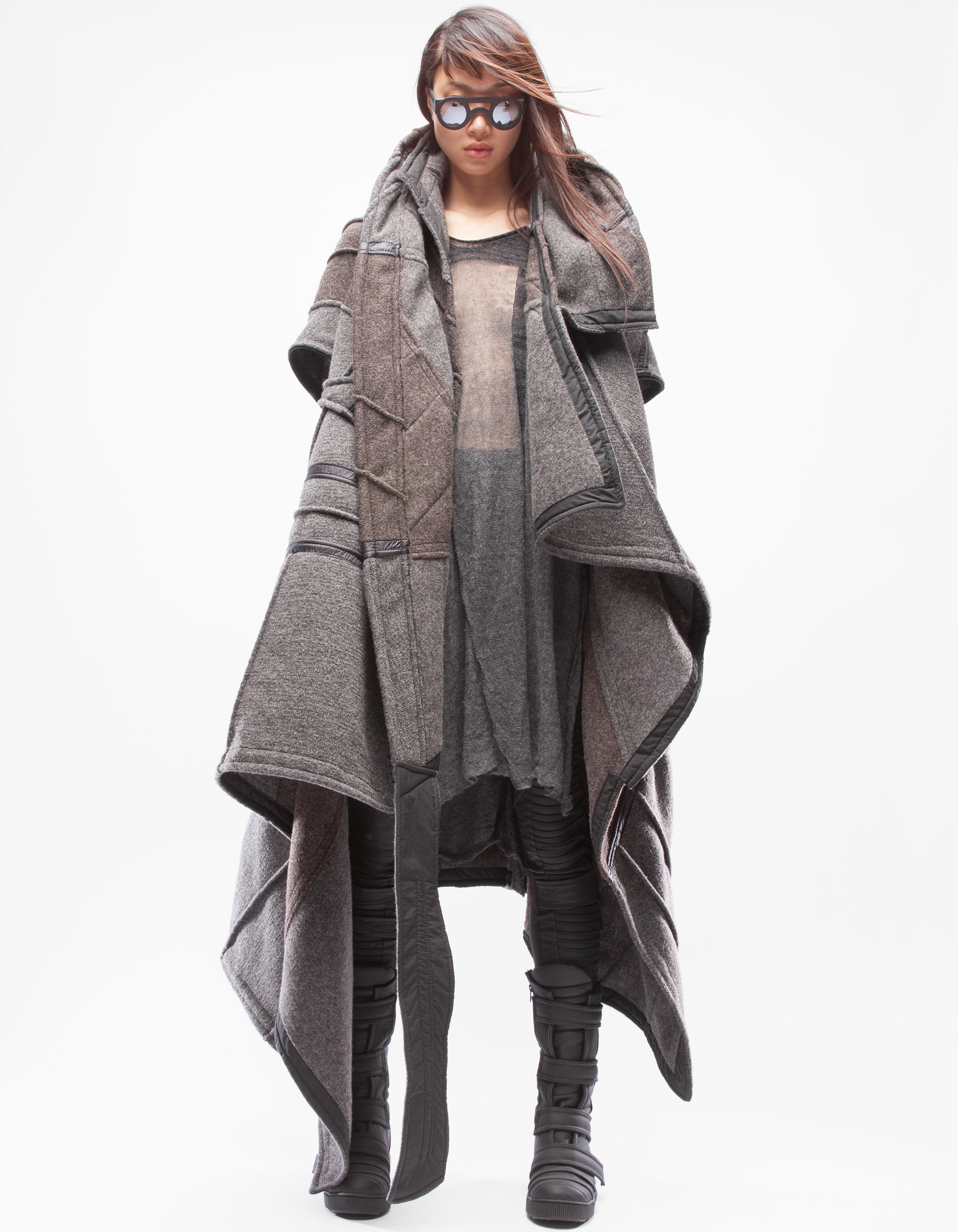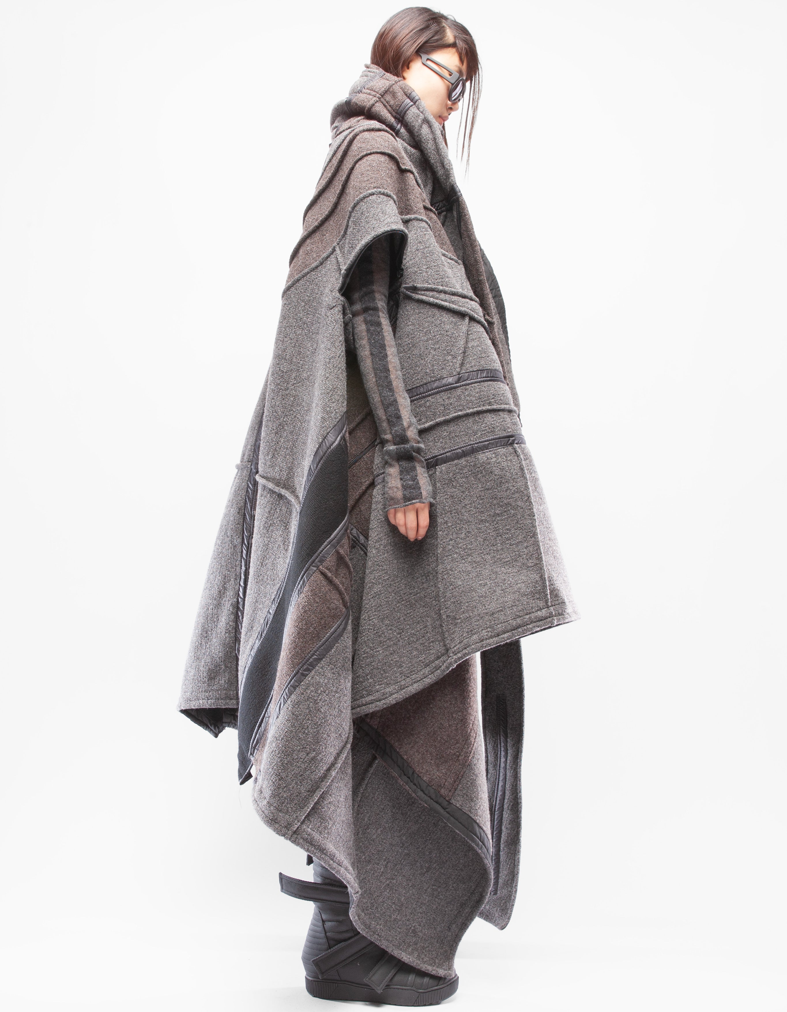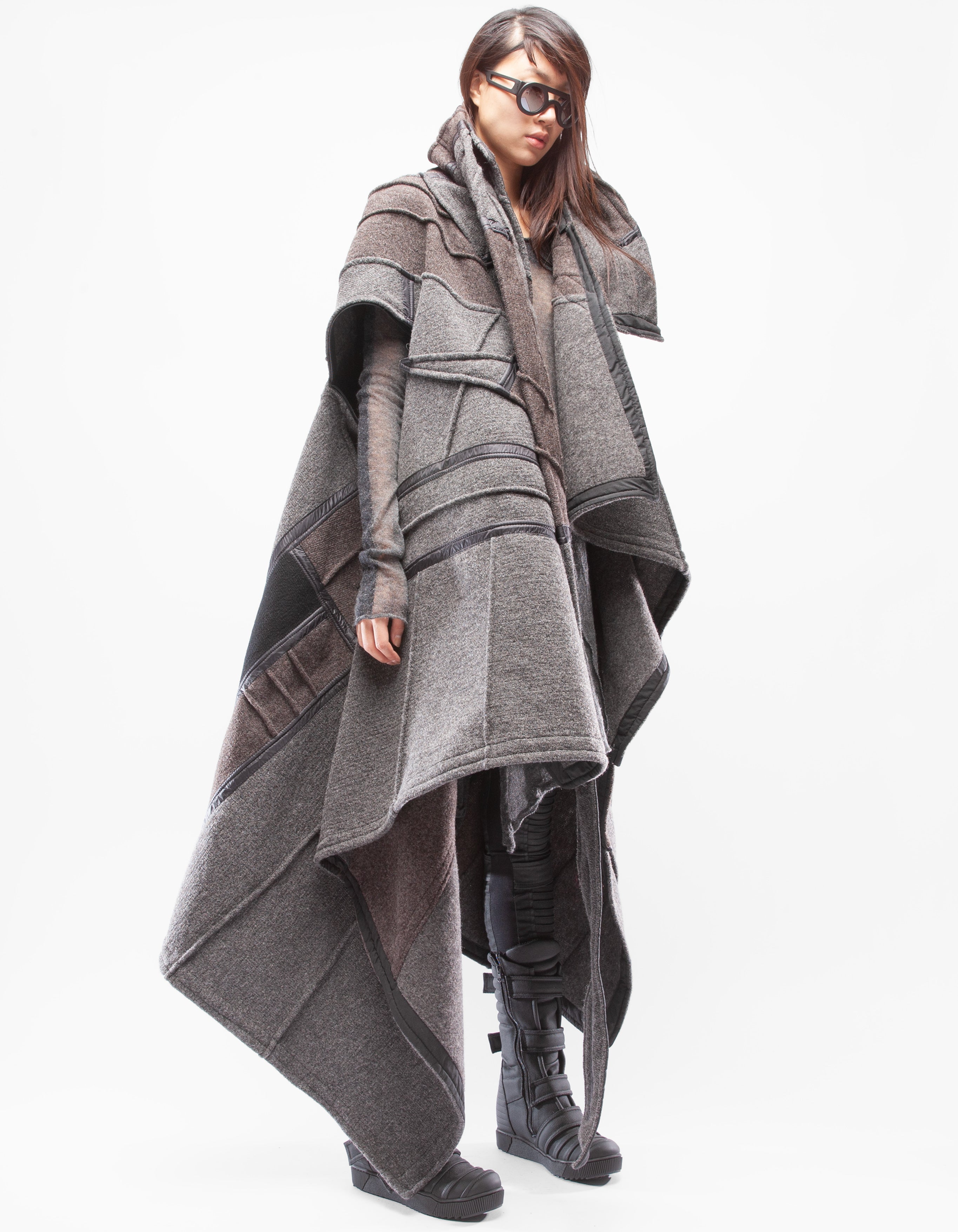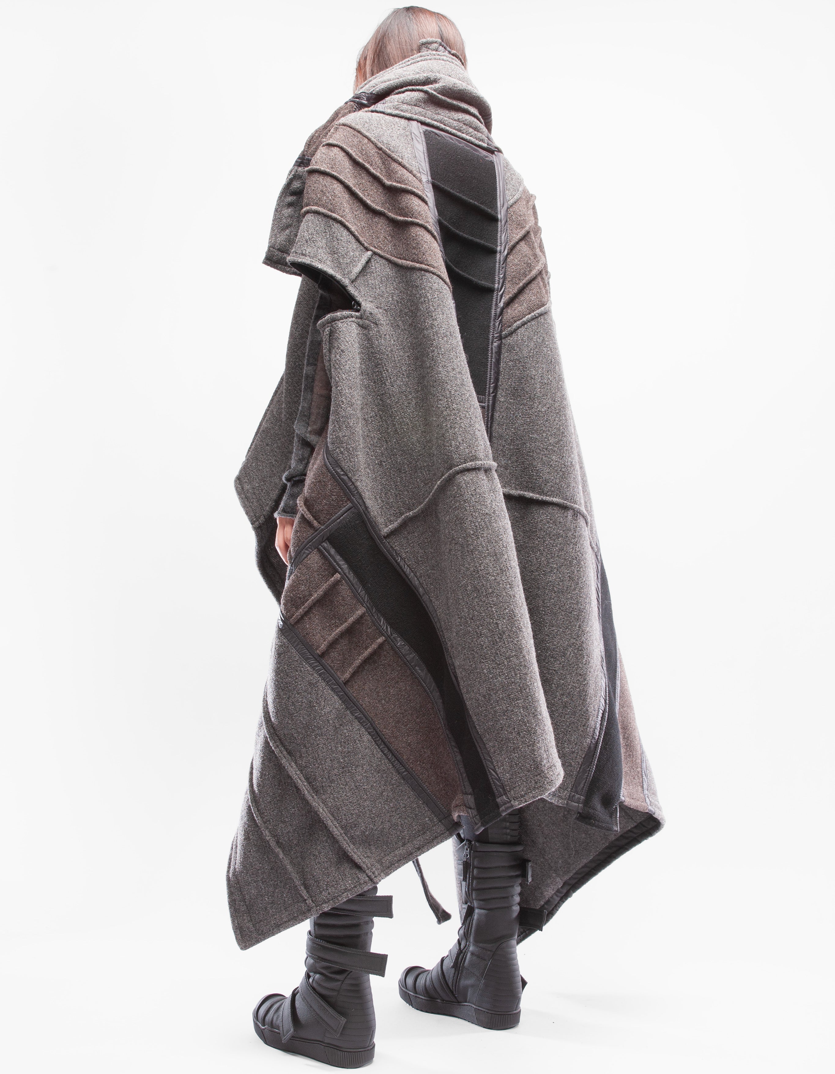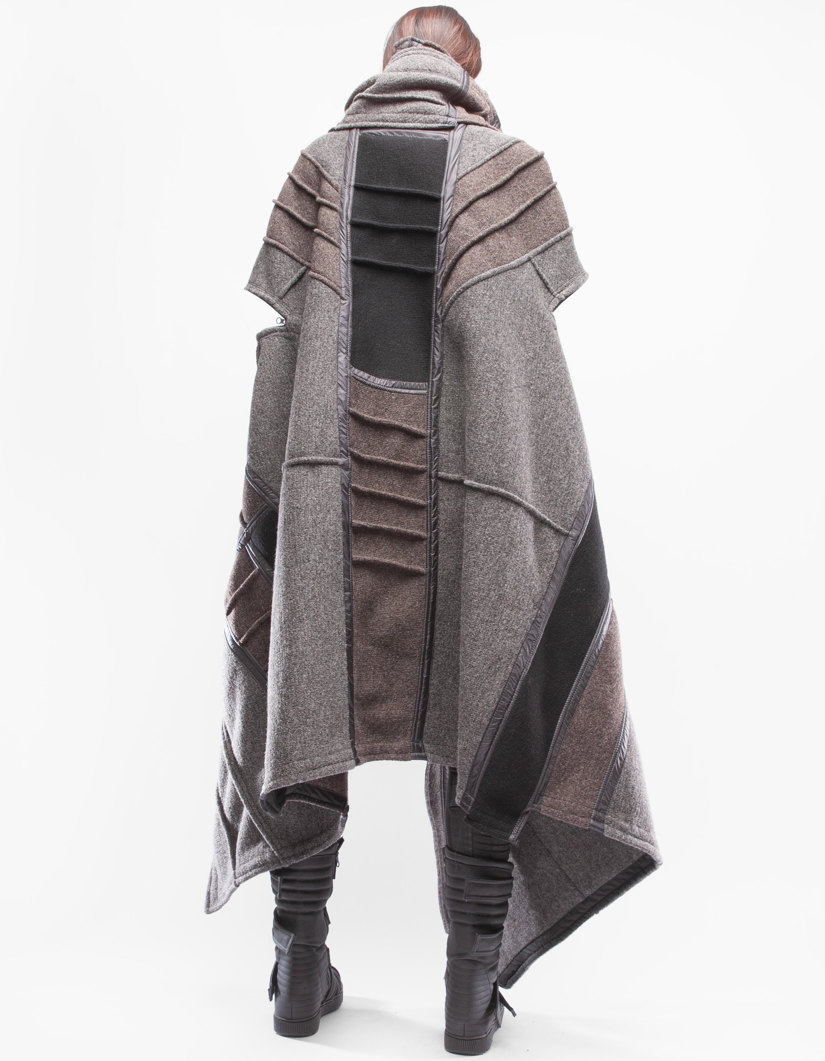 Detaillierter Mantel aus Wollmantel, hoher Kragen, Armlöcher mit Reißverschluss, Wickelverschluss, futuristischer Nomaden-Look