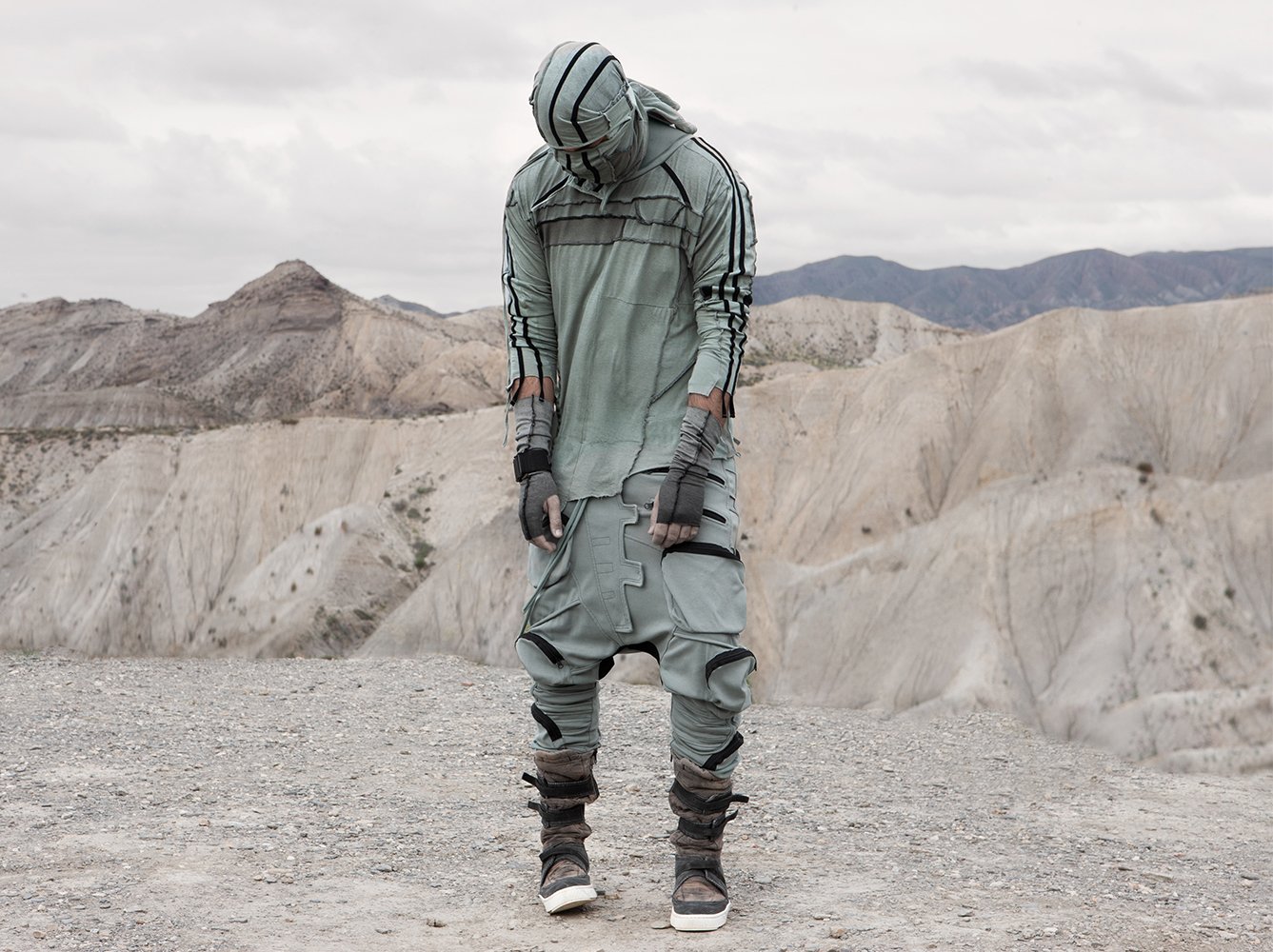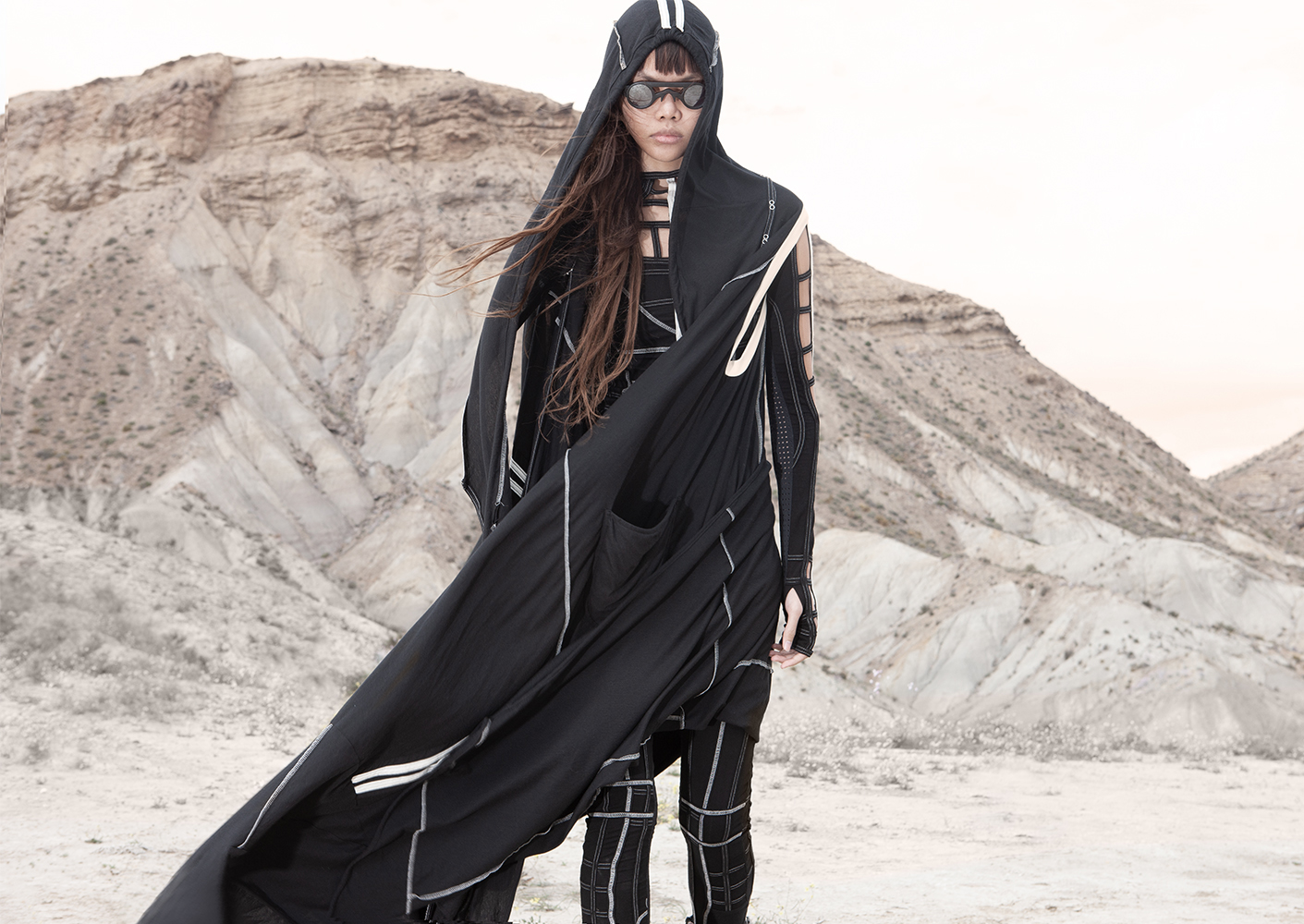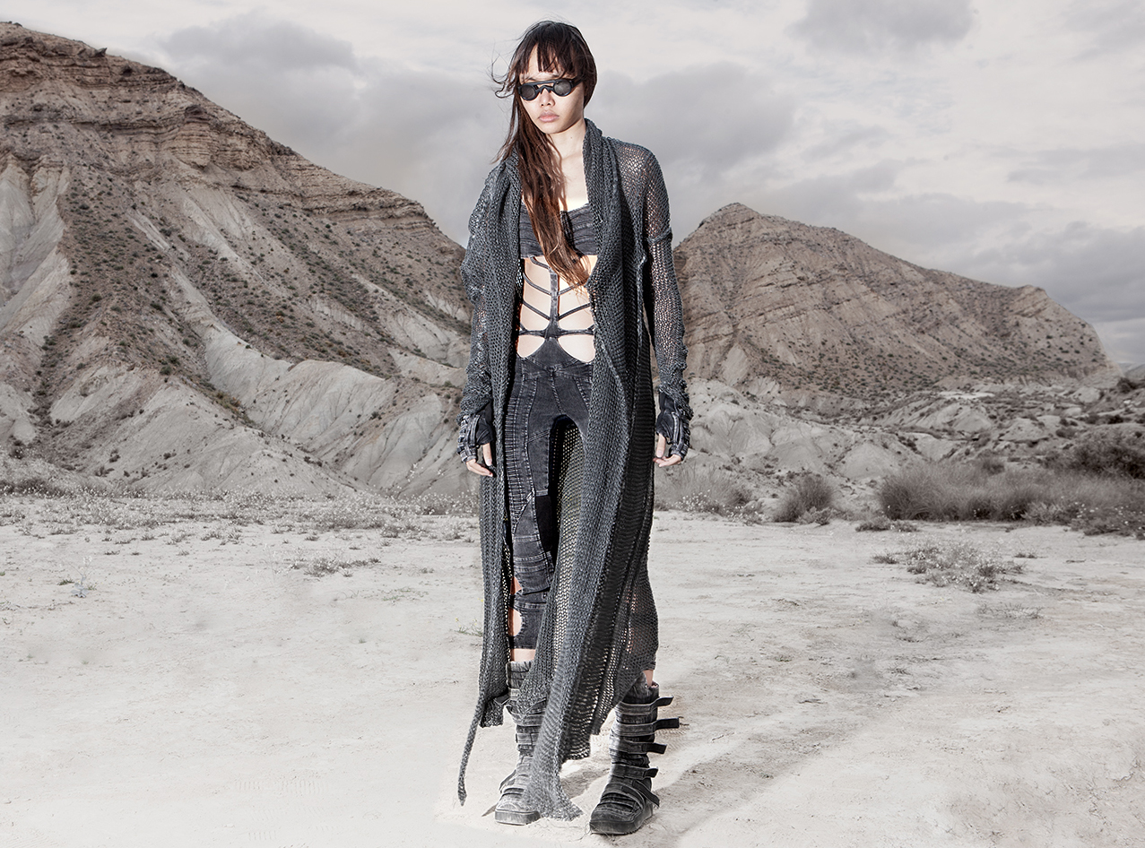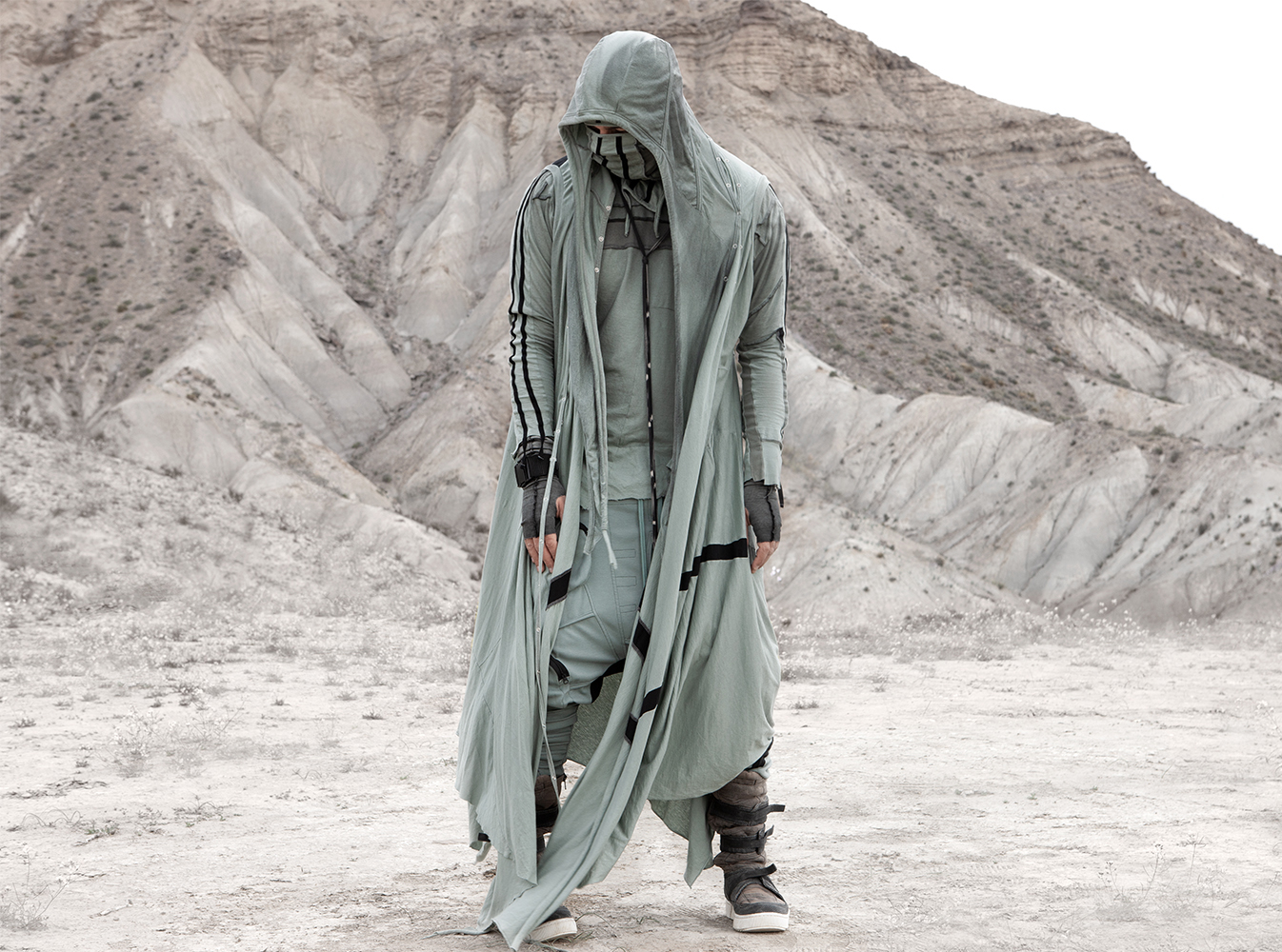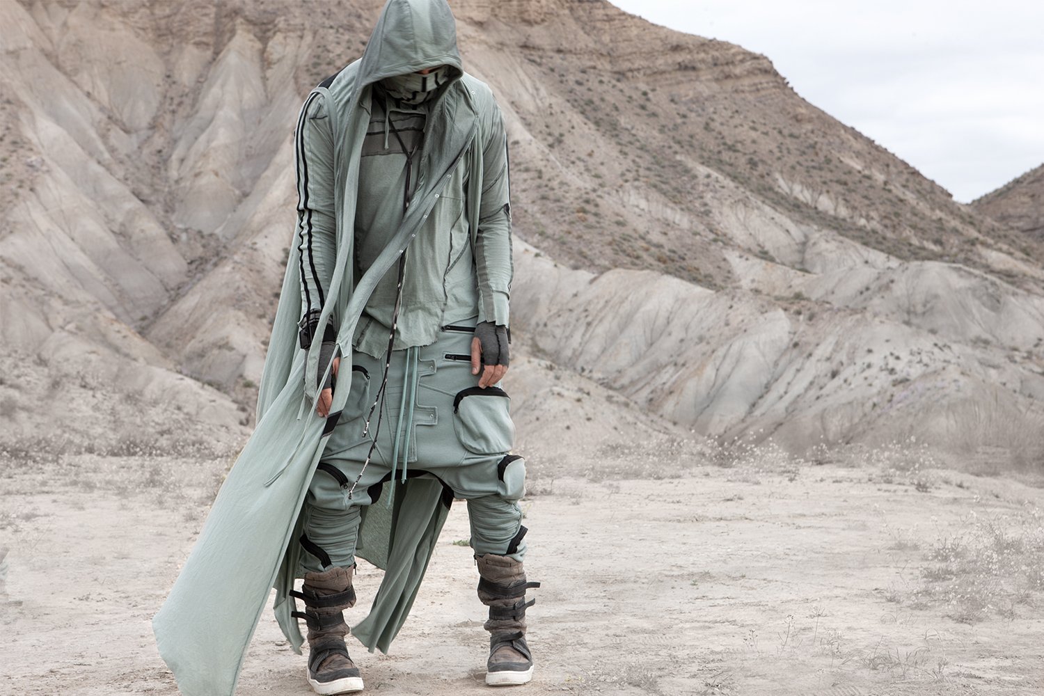 Draped garments, adorned with striking black graphics and lines gracefully meandering through ethereal fabrics, create an eternal sensation. The main color palette is blue, gray, beige, dusty green, white and black. These garments, dancing with the wind and crafted from organic cotton, in combination with the ruggedly detailed denim accessories and jackets, give birth to a dynamic, liberated, yet undeniably futuristic silhouette. They represent the conscious journey through time, space and eternity, crafted from hundreds of details, akin to spiritual electric armor. Masks, elbow pads, harnesses and a wide array of armored vests and jackets – this collection forms the protective lattice and structure that envelops Moksha.
