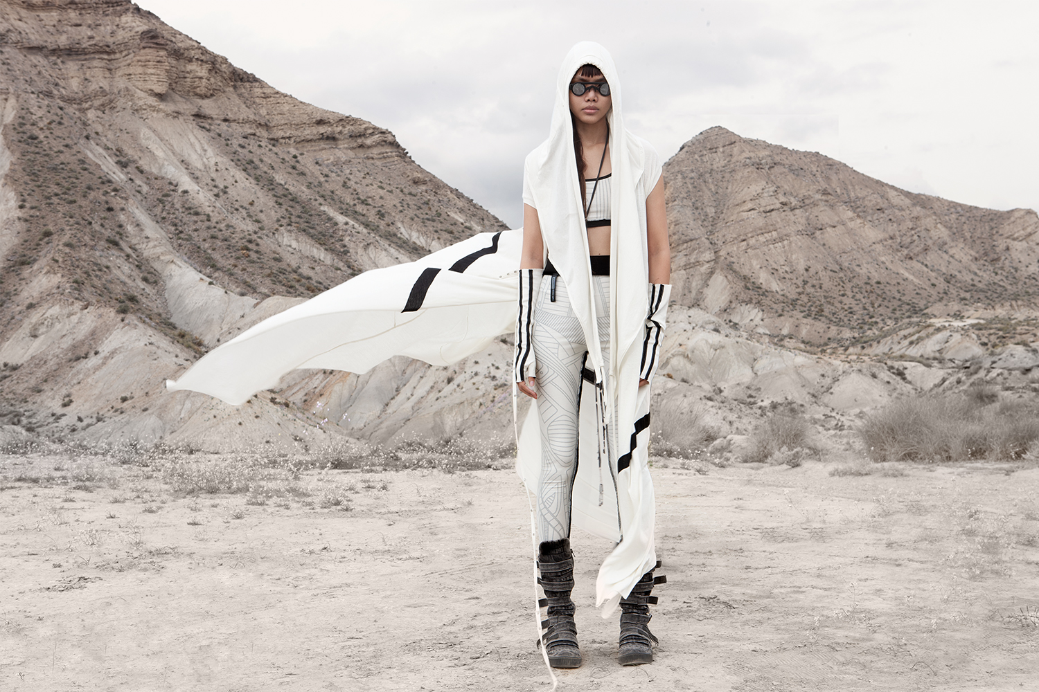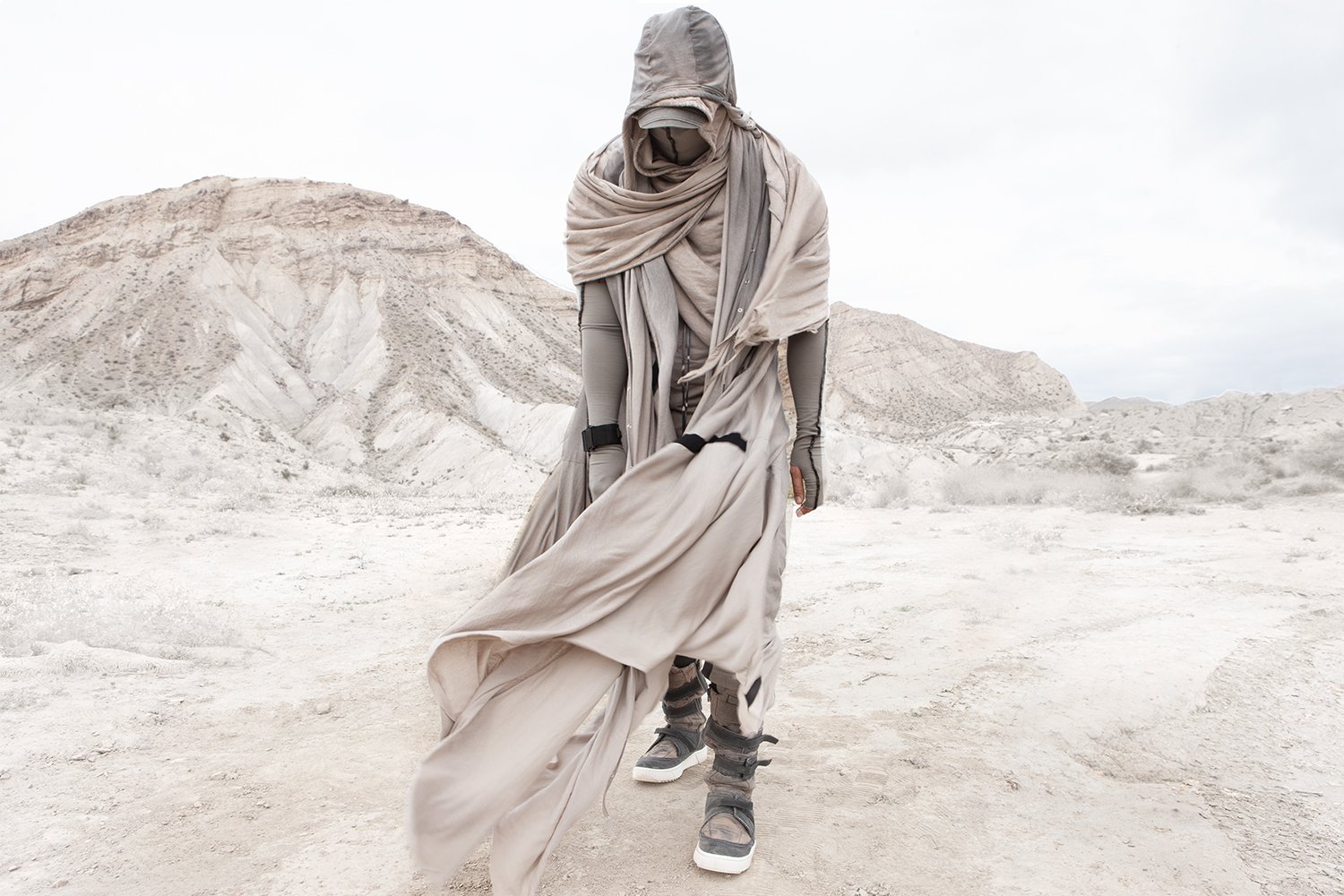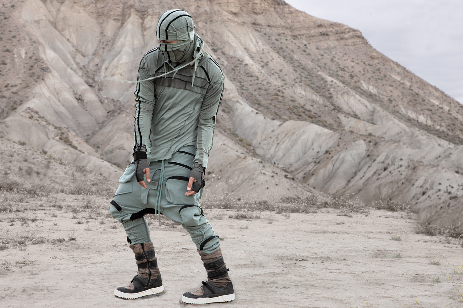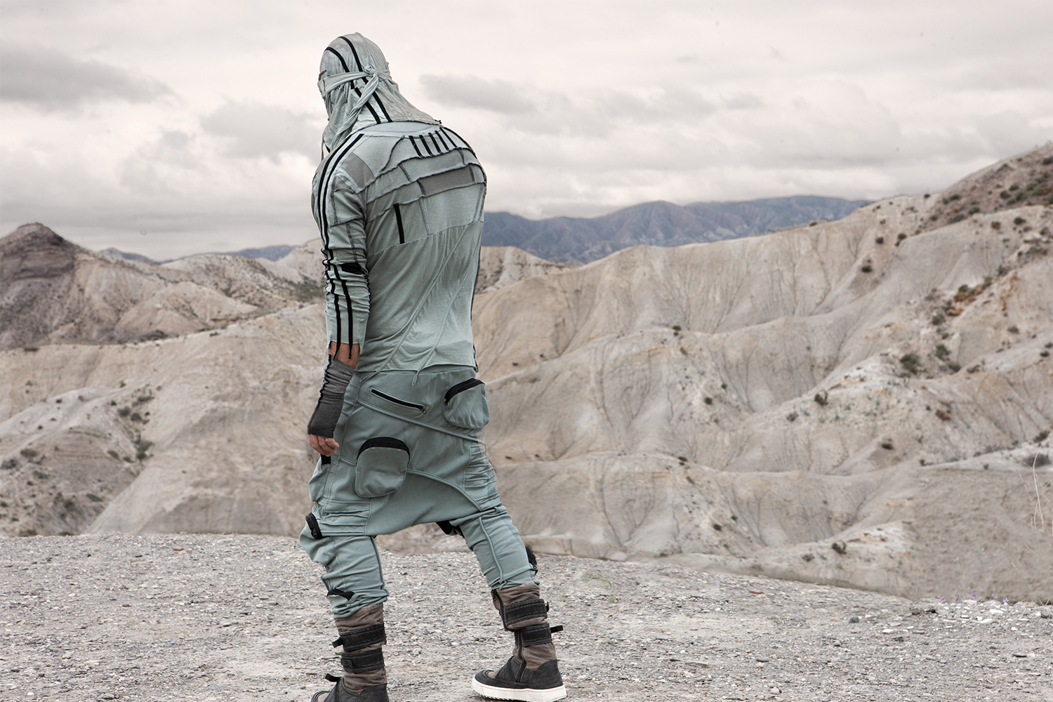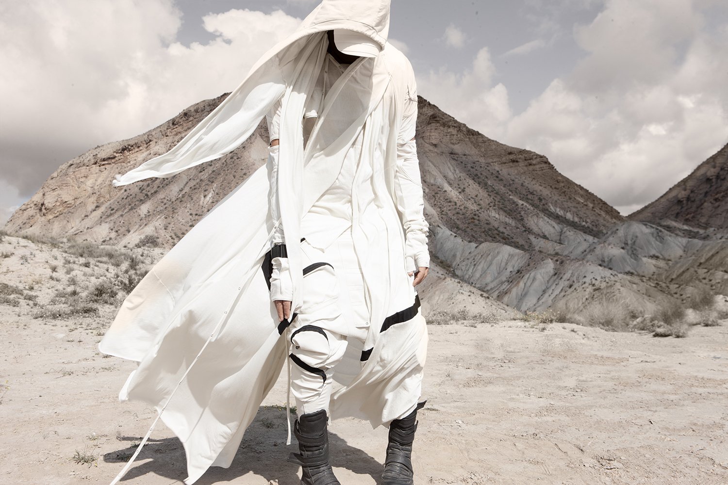 Draped garments, adorned with striking black graphics and lines gracefully meandering through ethereal fabrics, create an eternal sensation. The main color palette is blue, gray, beige, dusty green, white and black. These garments, dancing with the wind and crafted from organic cotton, in combination with the ruggedly detailed denim accessories and jackets, give birth to a dynamic, liberated, yet undeniably futuristic silhouette. They represent the conscious journey through time, space and eternity, crafted from hundreds of details, akin to spiritual electric armor. Masks, elbow pads, harnesses and a wide array of armored vests and jackets – this collection forms the protective lattice and structure that envelops Moksha.