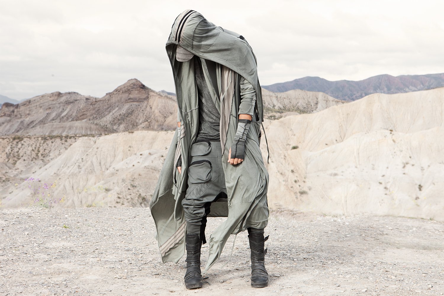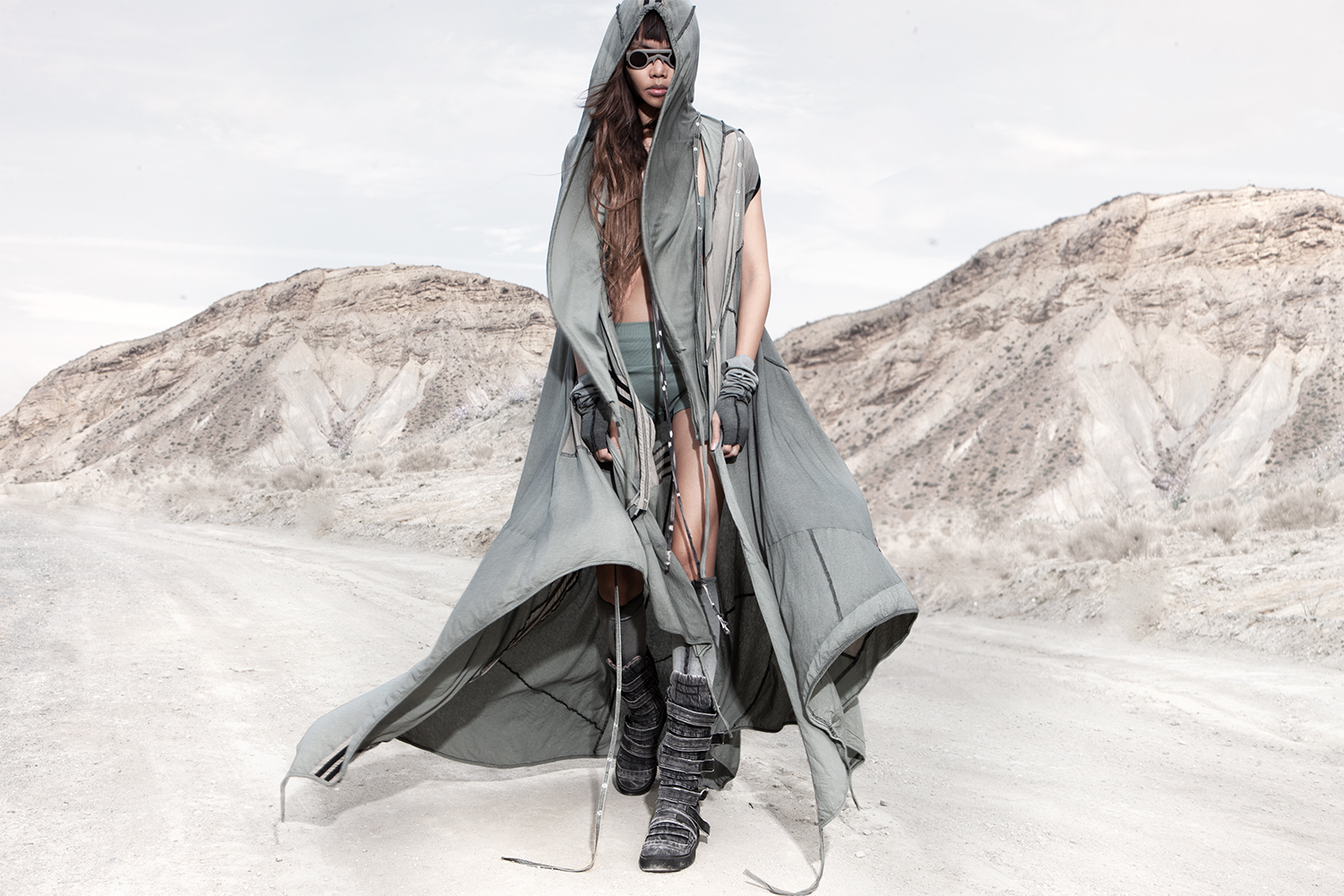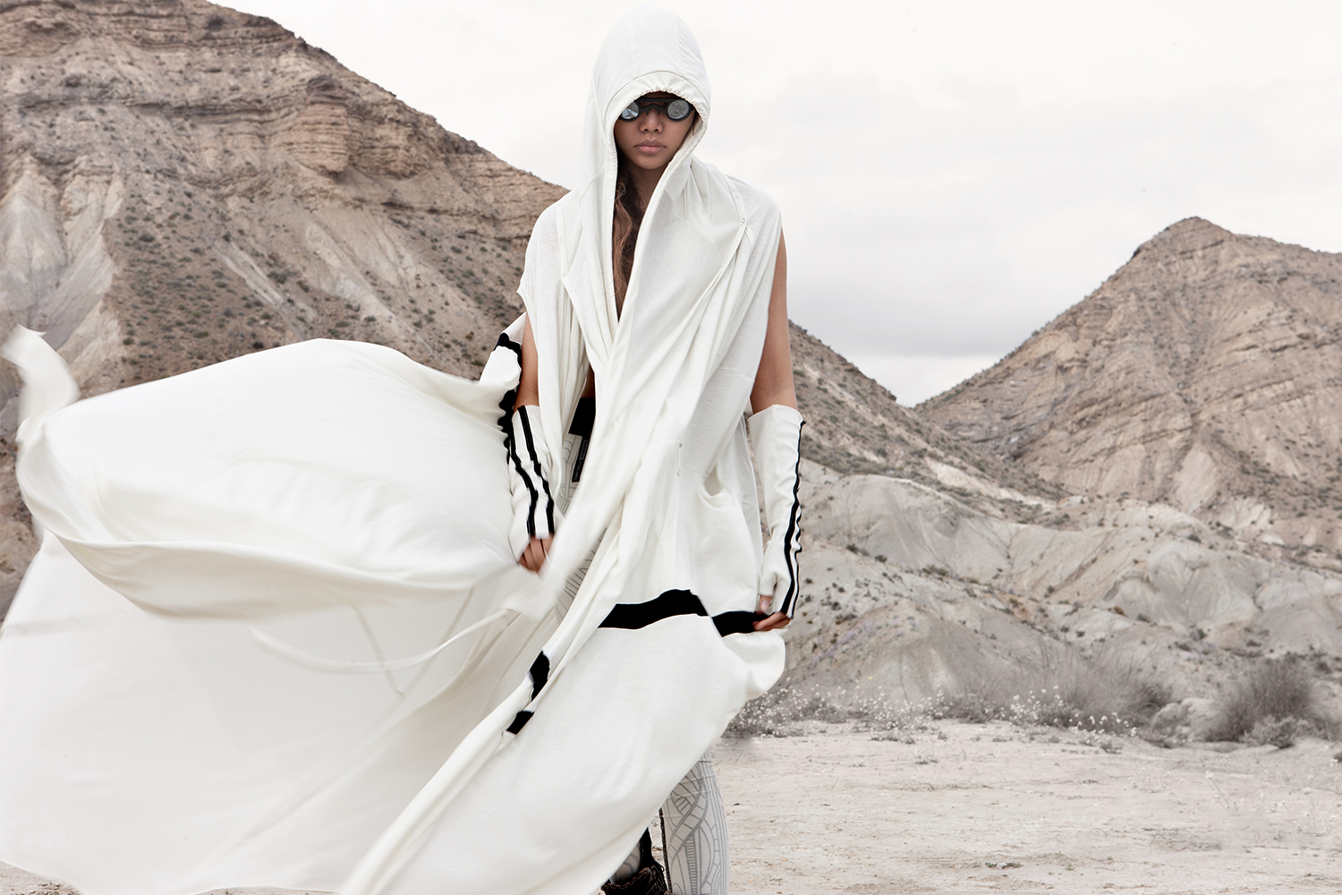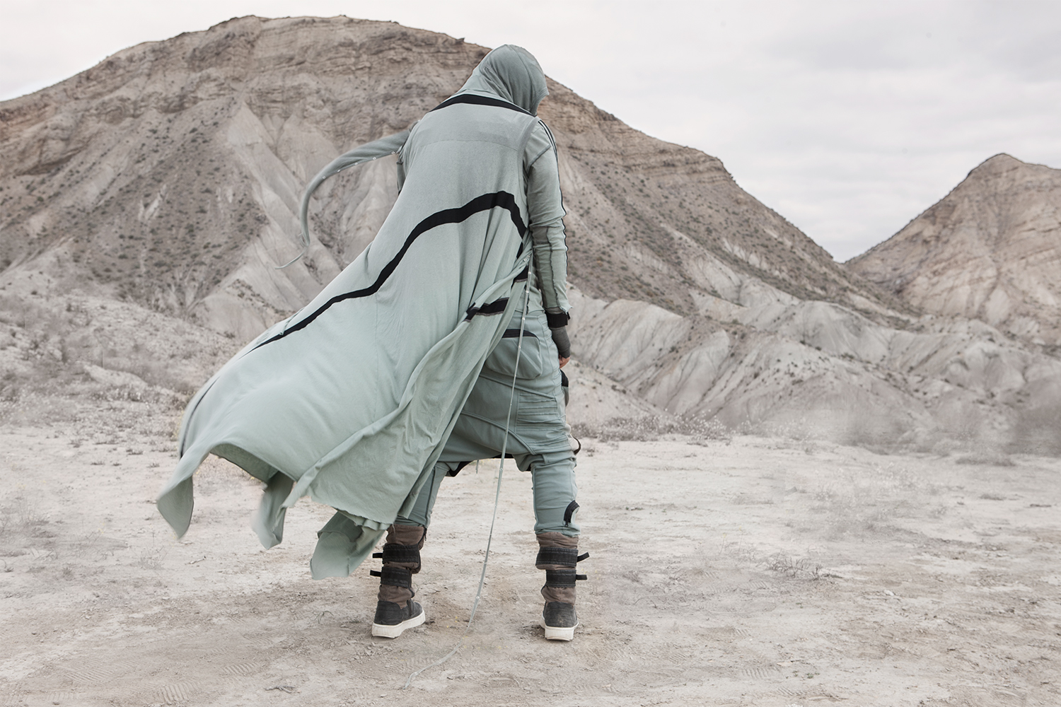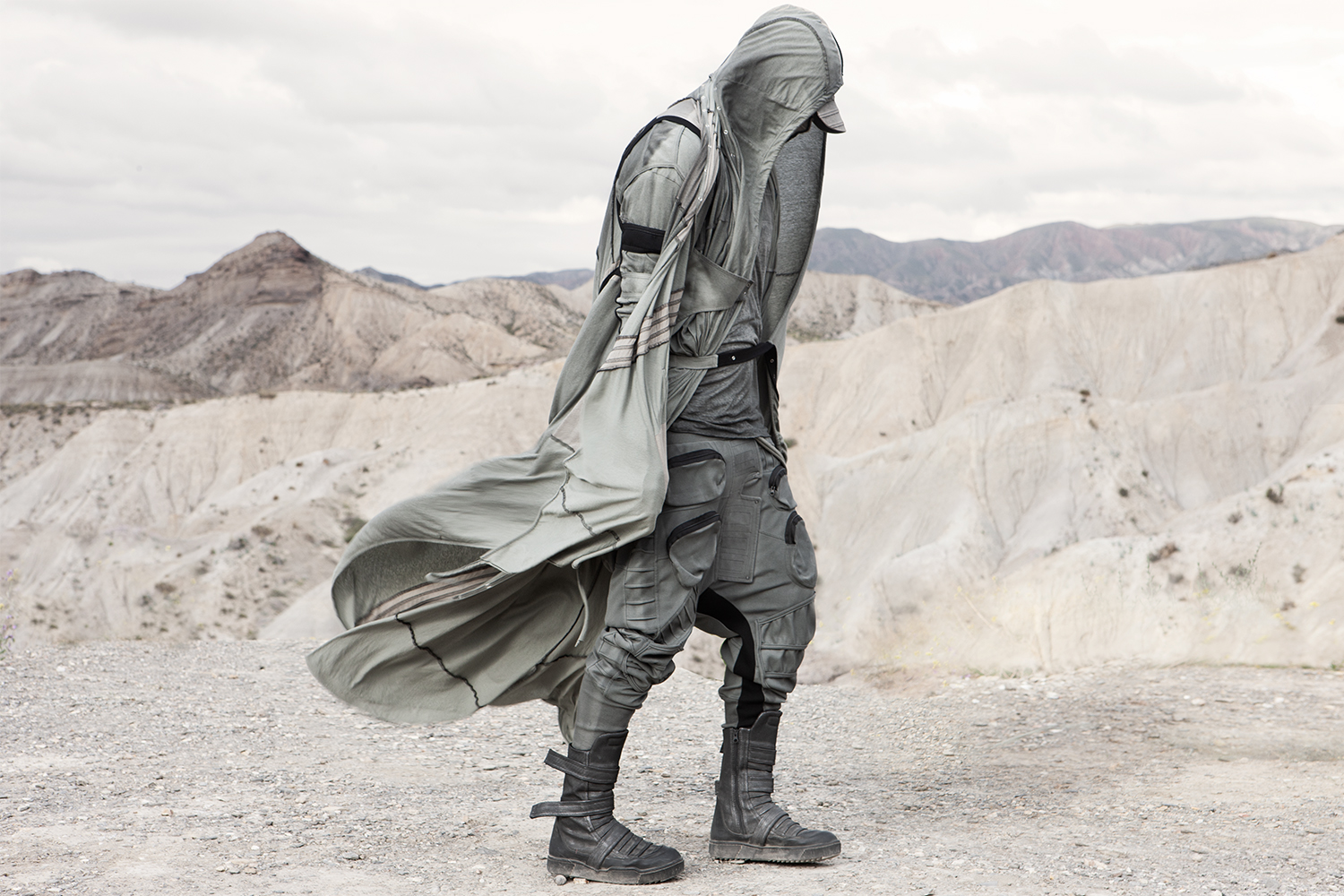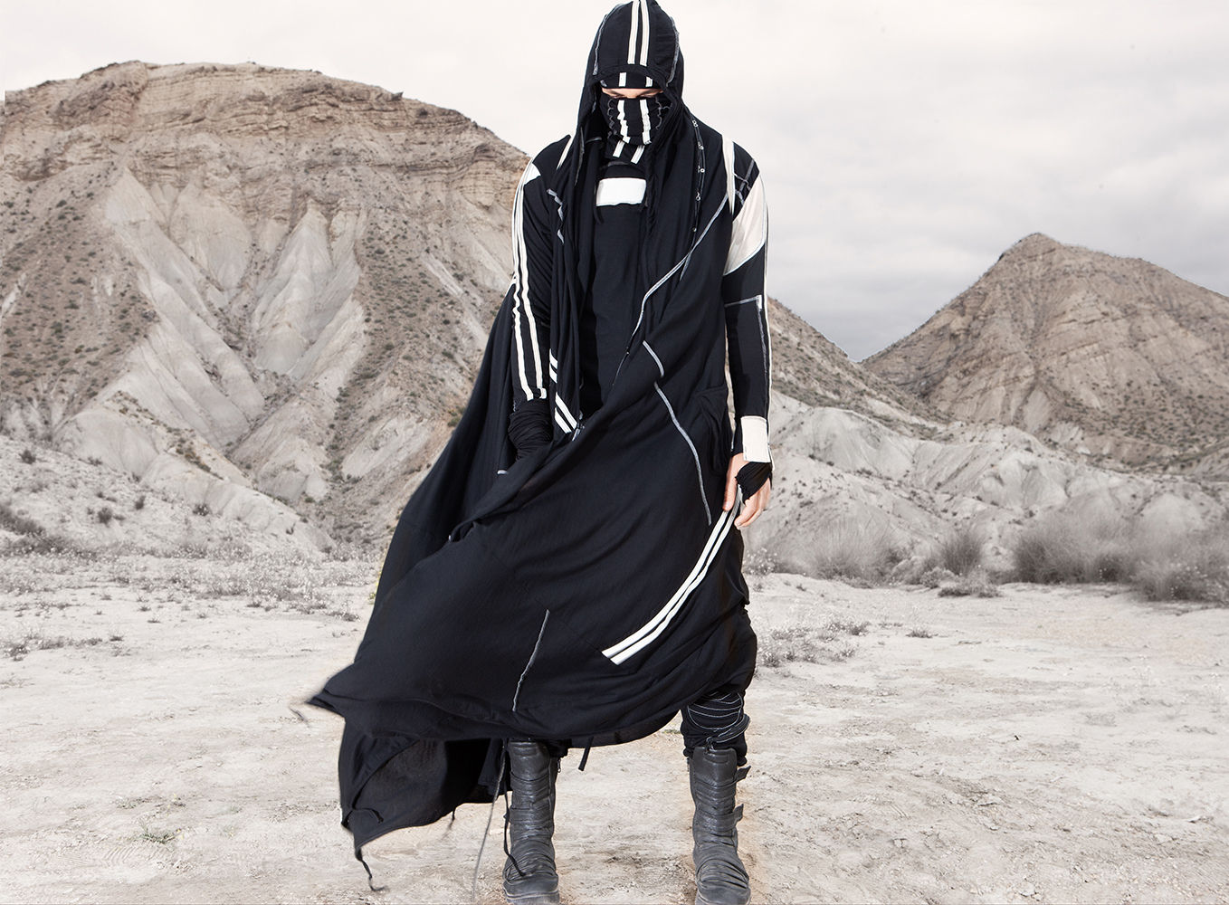 Draped garments, adorned with striking black graphics and lines gracefully meandering through ethereal fabrics, create an eternal sensation. The main color palette is blue, gray, beige, dusty green, white and black. These garments, dancing with the wind and crafted from organic cotton, in combination with the ruggedly detailed denim accessories and jackets, give birth to a dynamic, liberated, yet undeniably futuristic silhouette. They represent the conscious journey through time, space and eternity, crafted from hundreds of details, akin to spiritual electric armor. Masks, elbow pads, harnesses and a wide array of armored vests and jackets – this collection forms the protective lattice and structure that envelops Moksha.