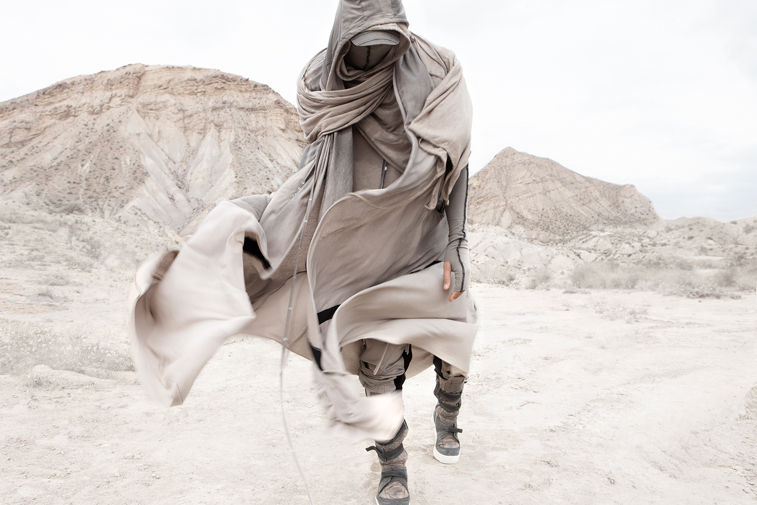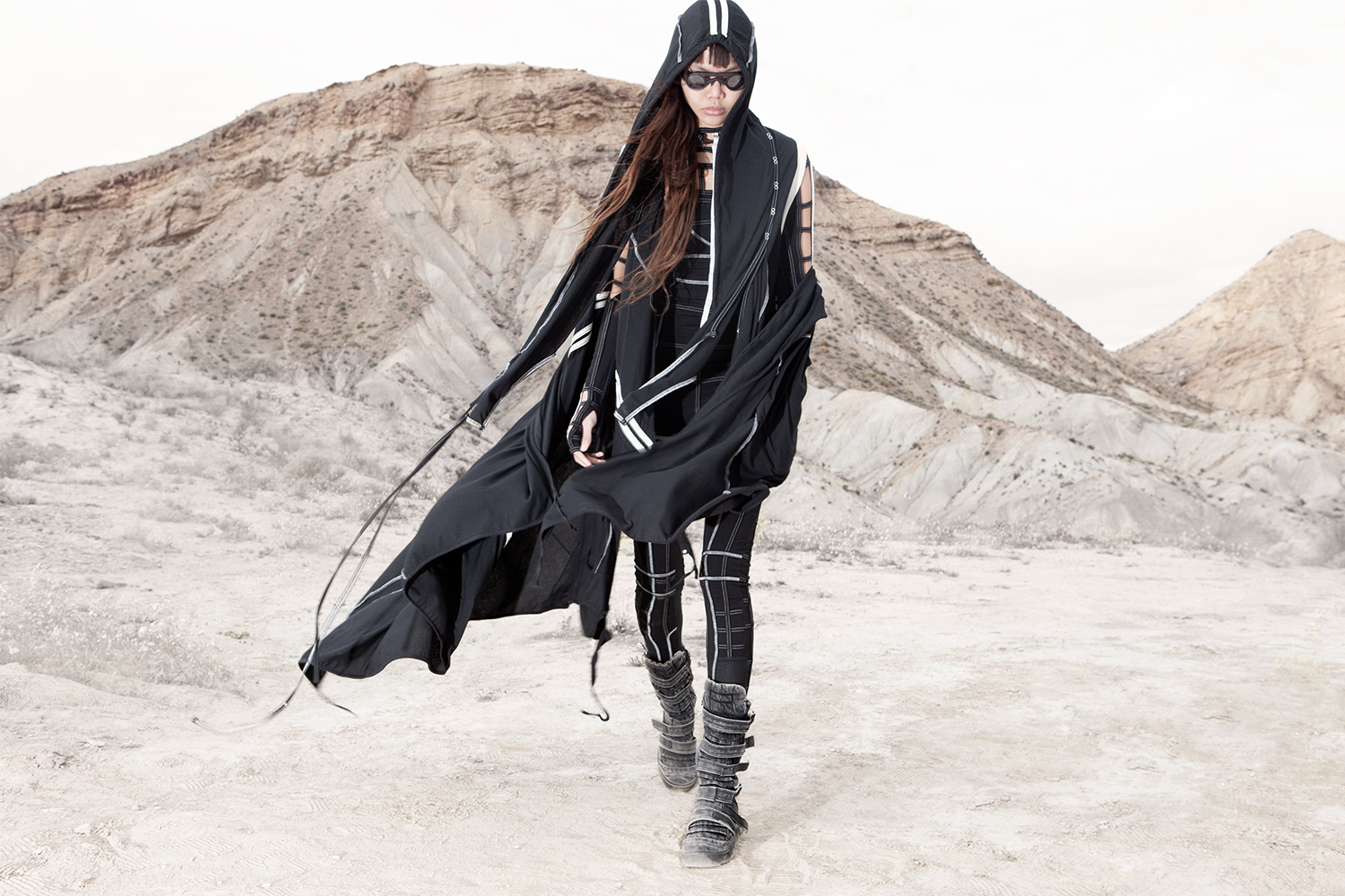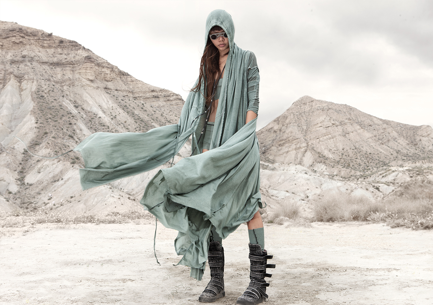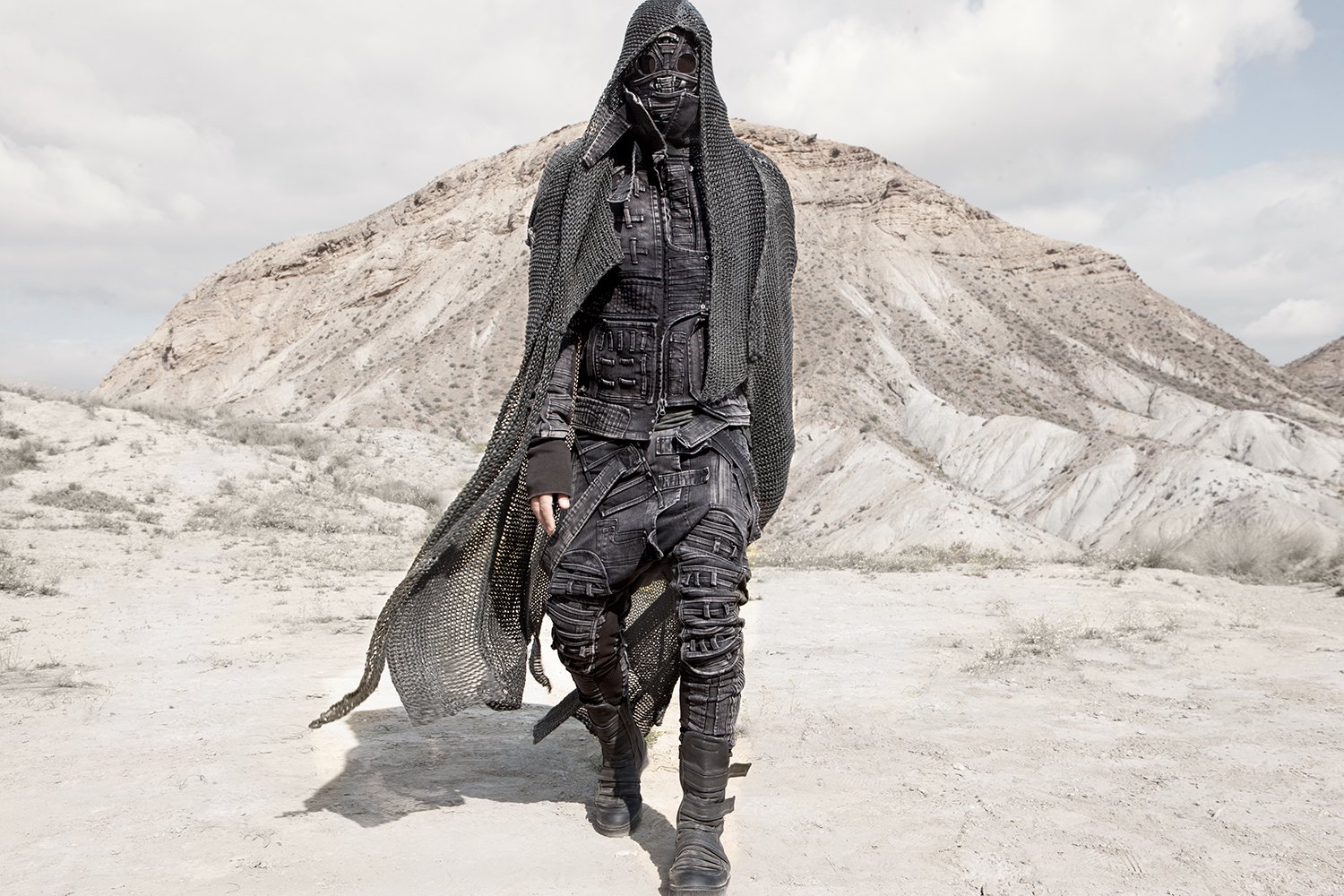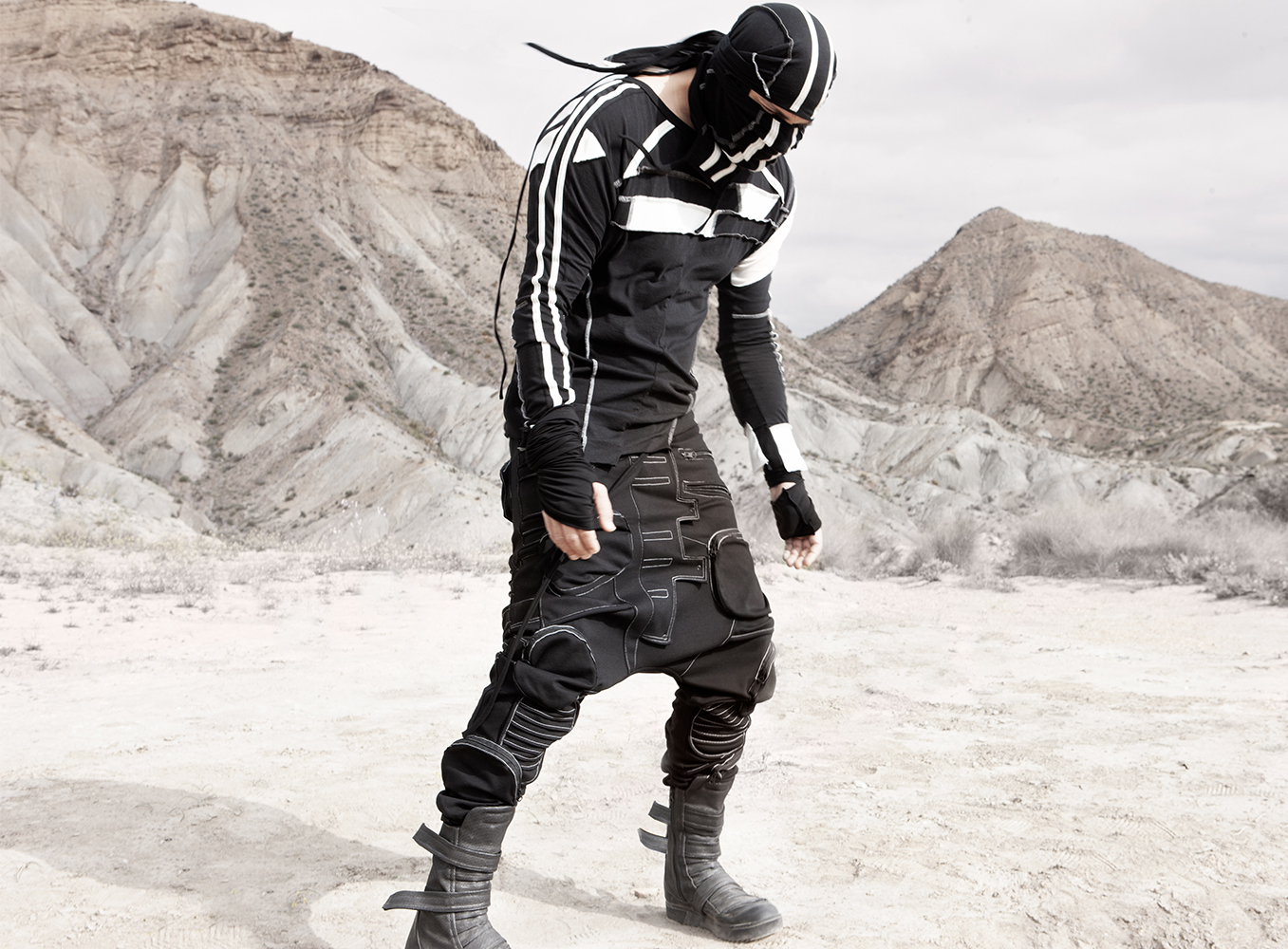 Draped garments, adorned with striking black graphics and lines gracefully meandering through ethereal fabrics, create an eternal sensation. The main color palette is blue, gray, beige, dusty green, white and black. These garments, dancing with the wind and crafted from organic cotton, in combination with the ruggedly detailed denim accessories and jackets, give birth to a dynamic, liberated, yet undeniably futuristic silhouette. They represent the conscious journey through time, space and eternity, crafted from hundreds of details, akin to spiritual electric armor. Masks, elbow pads, harnesses and a wide array of armored vests and jackets – this collection forms the protective lattice and structure that envelops Moksha.