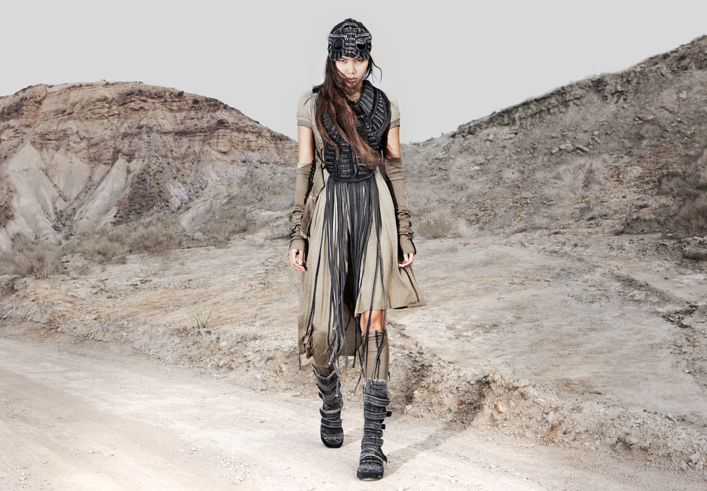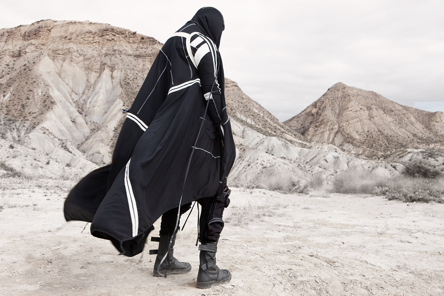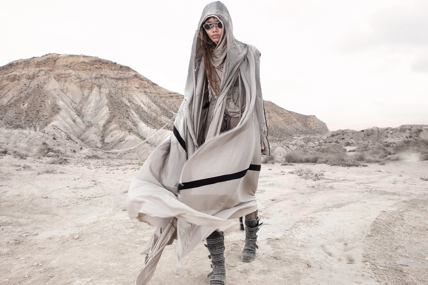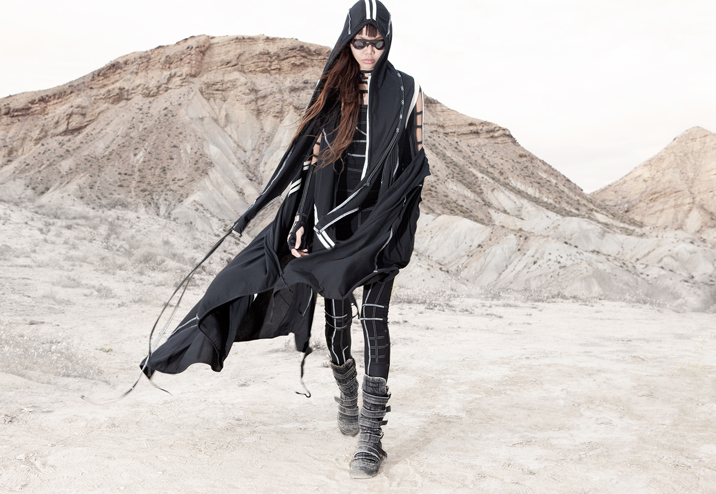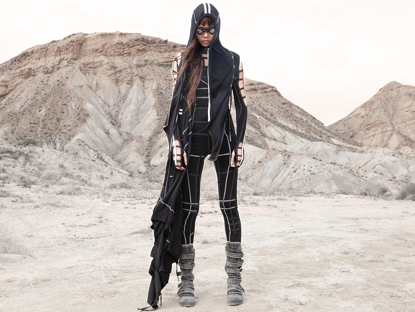 Draped garments, adorned with striking black graphics and lines gracefully meandering through ethereal fabrics, create an eternal sensation. The main color palette is blue, gray, beige, dusty green, white and black. These garments, dancing with the wind and crafted from organic cotton, in combination with the ruggedly detailed denim accessories and jackets, give birth to a dynamic, liberated, yet undeniably futuristic silhouette. They represent the conscious journey through time, space and eternity, crafted from hundreds of details, akin to spiritual electric armor. Masks, elbow pads, harnesses and a wide array of armored vests and jackets – this collection forms the protective lattice and structure that envelops Moksha.