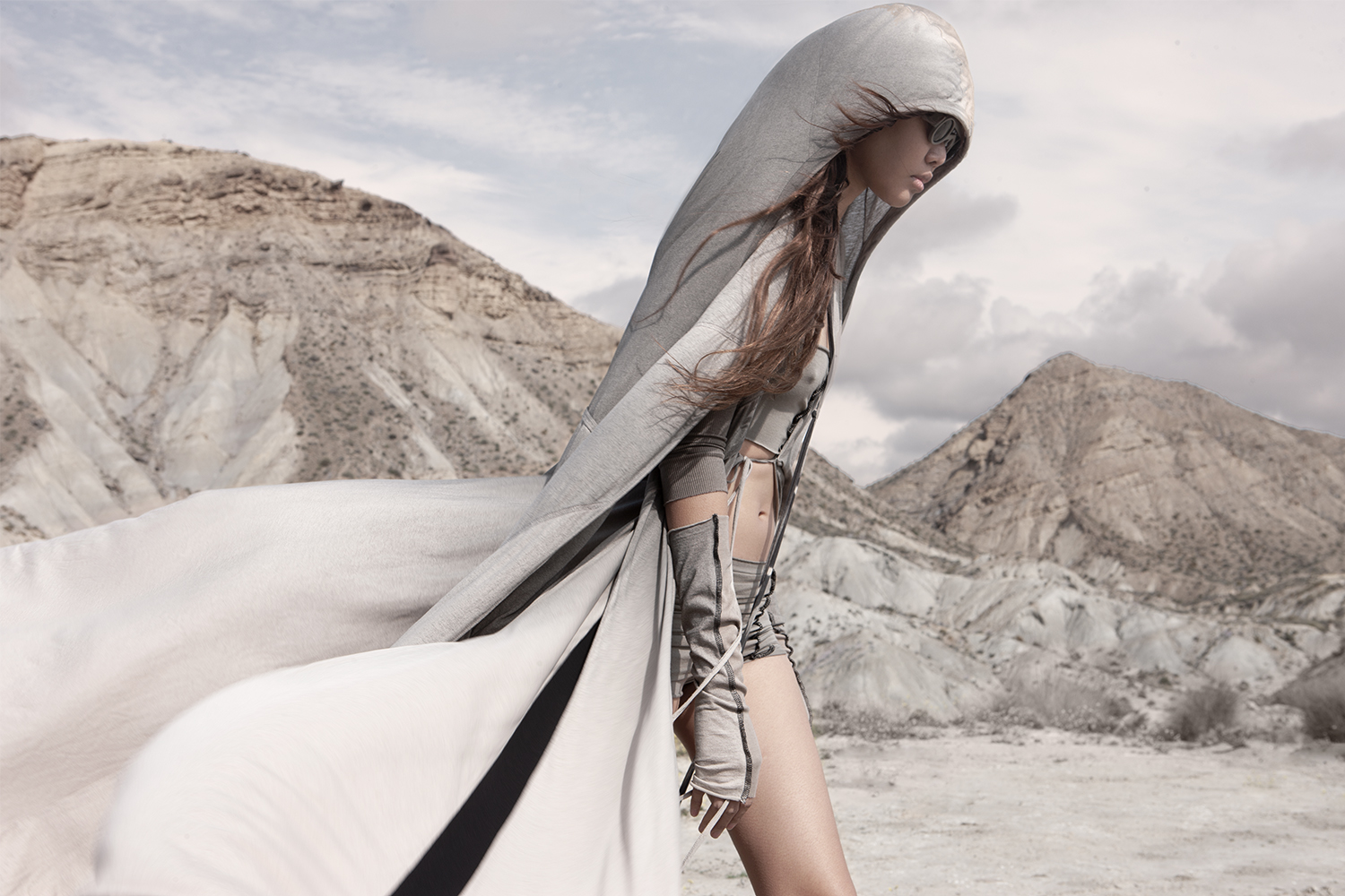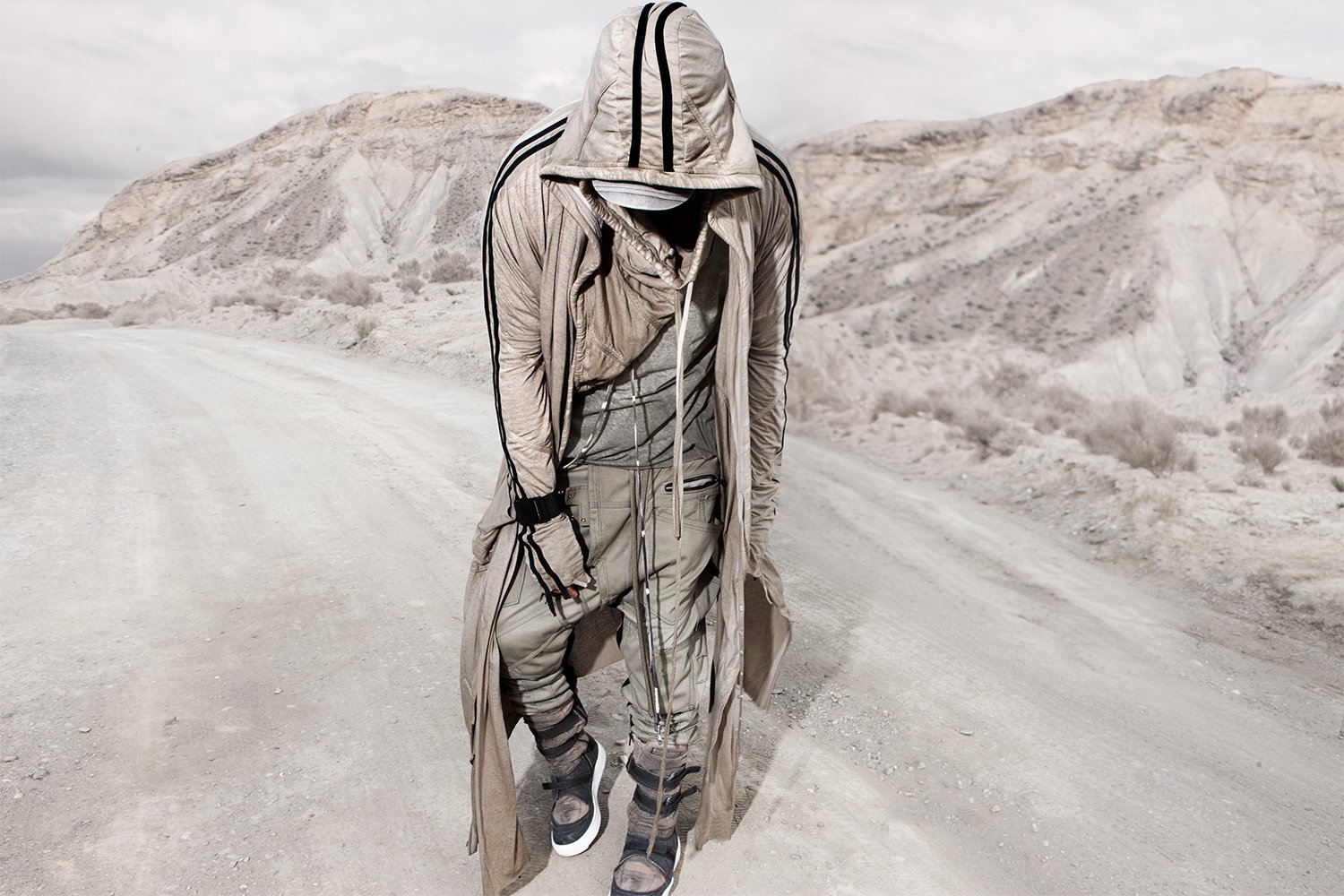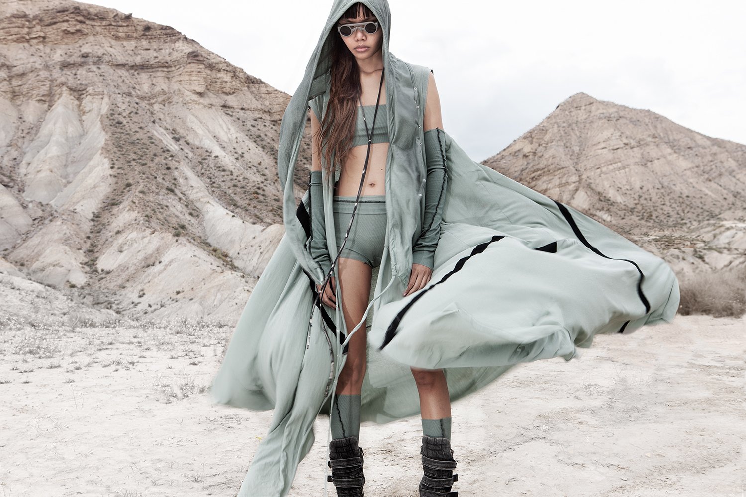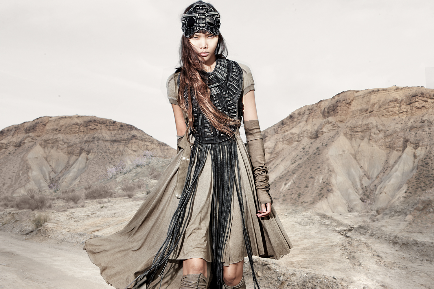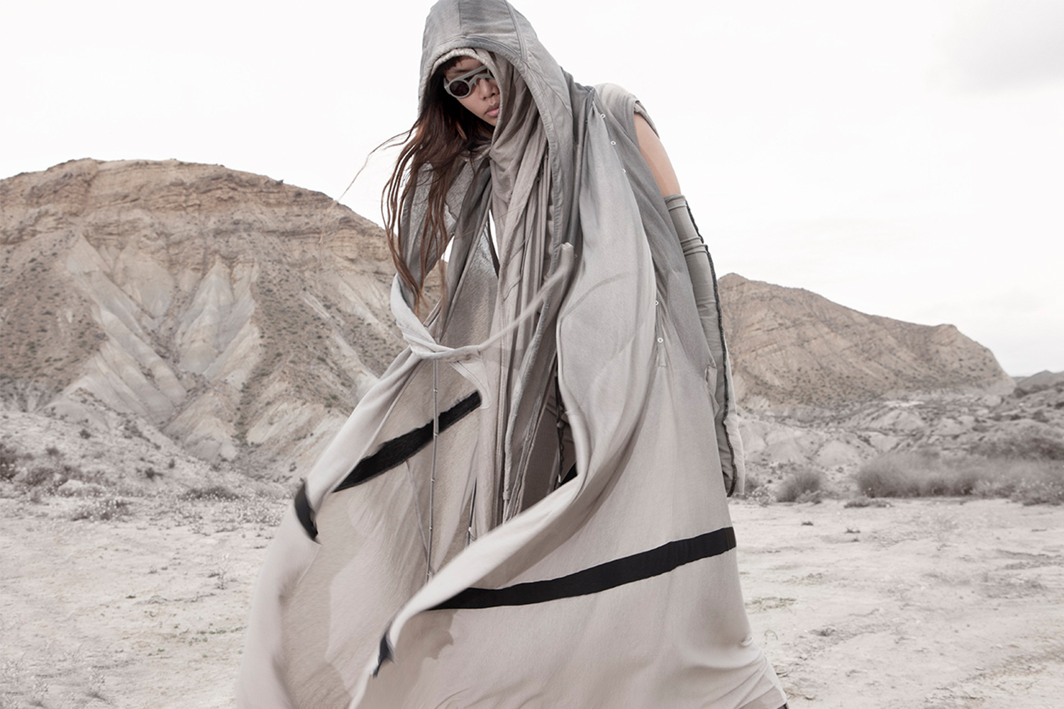 Draped garments, adorned with striking black graphics and lines gracefully meandering through ethereal fabrics, create an eternal sensation. The main color palette is blue, gray, beige, dusty green, white and black. These garments, dancing with the wind and crafted from organic cotton, in combination with the ruggedly detailed denim accessories and jackets, give birth to a dynamic, liberated, yet undeniably futuristic silhouette. They represent the conscious journey through time, space and eternity, crafted from hundreds of details, akin to spiritual electric armor. Masks, elbow pads, harnesses and a wide array of armored vests and jackets – this collection forms the protective lattice and structure that envelops Moksha.