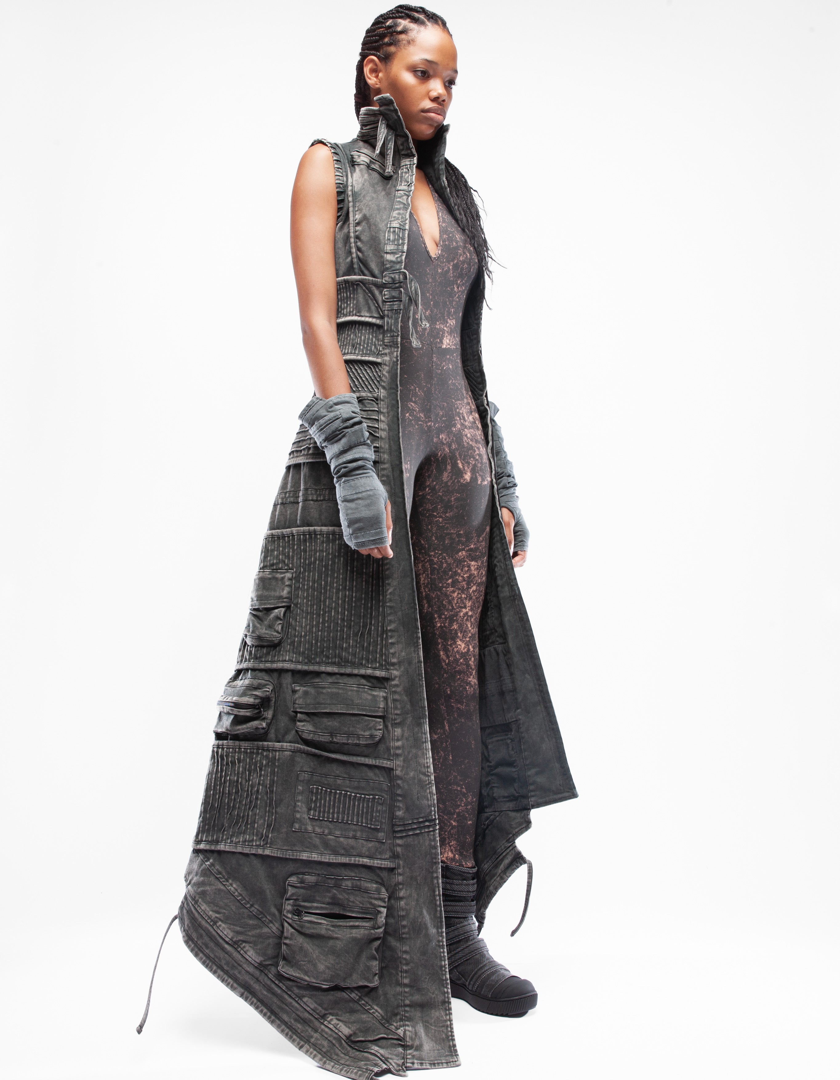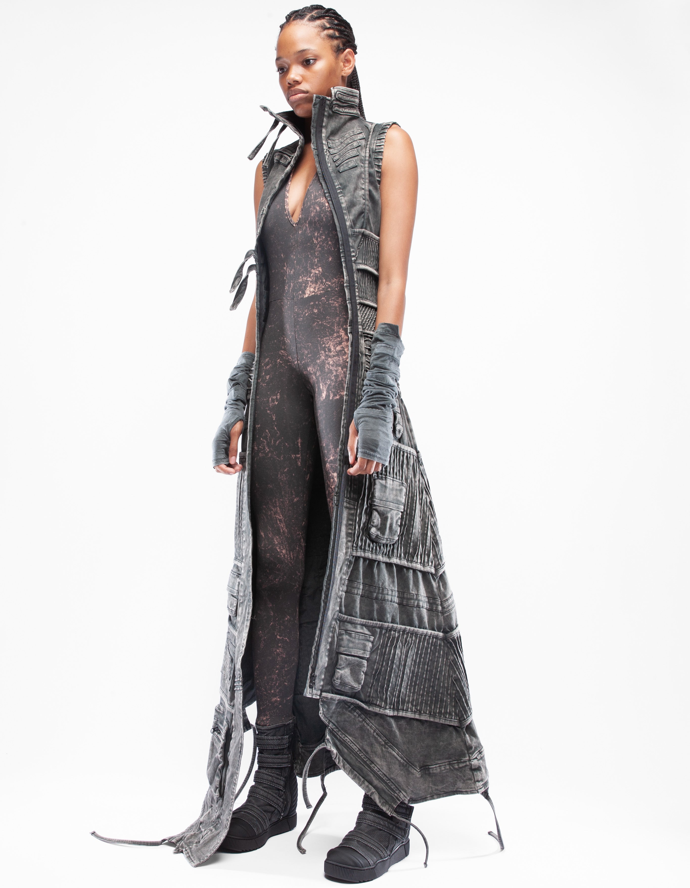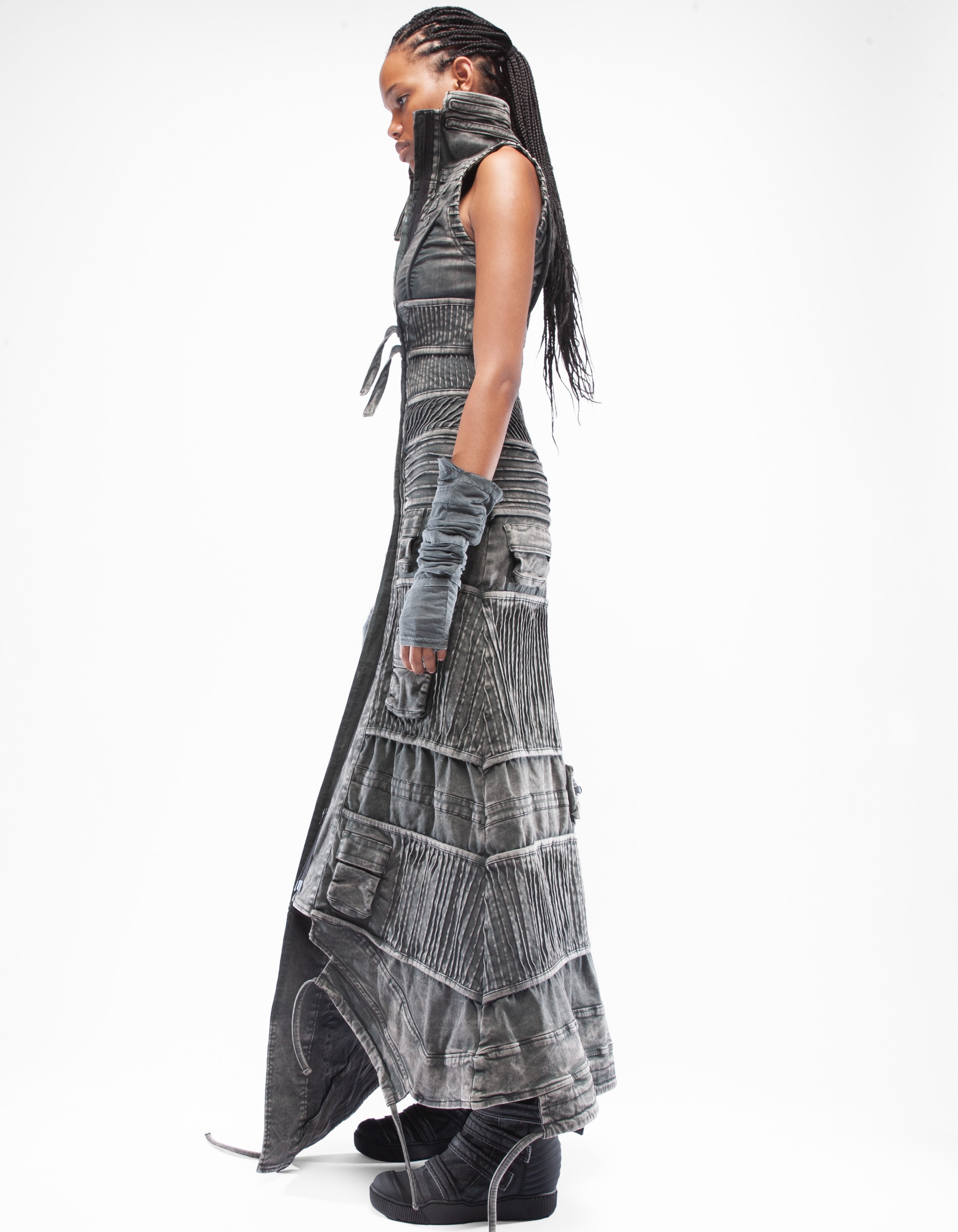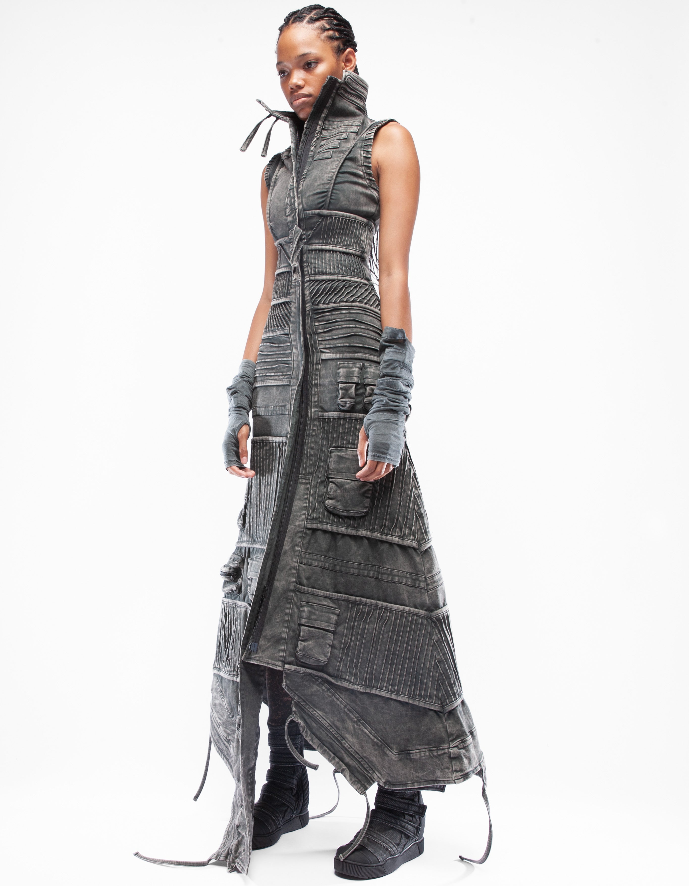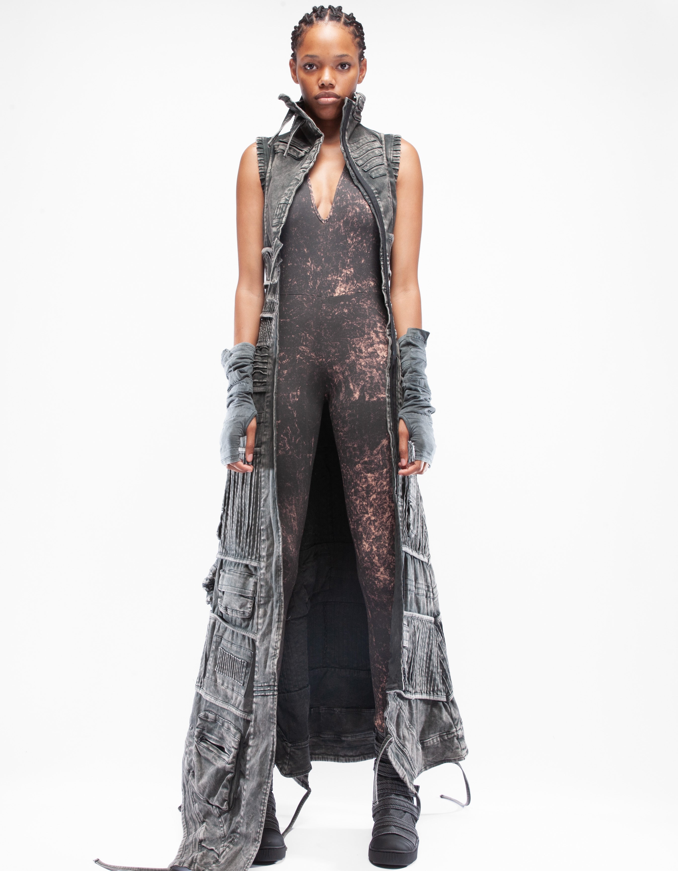 abrigo largo sin mangas de mezclilla elástica asimétrica detallada