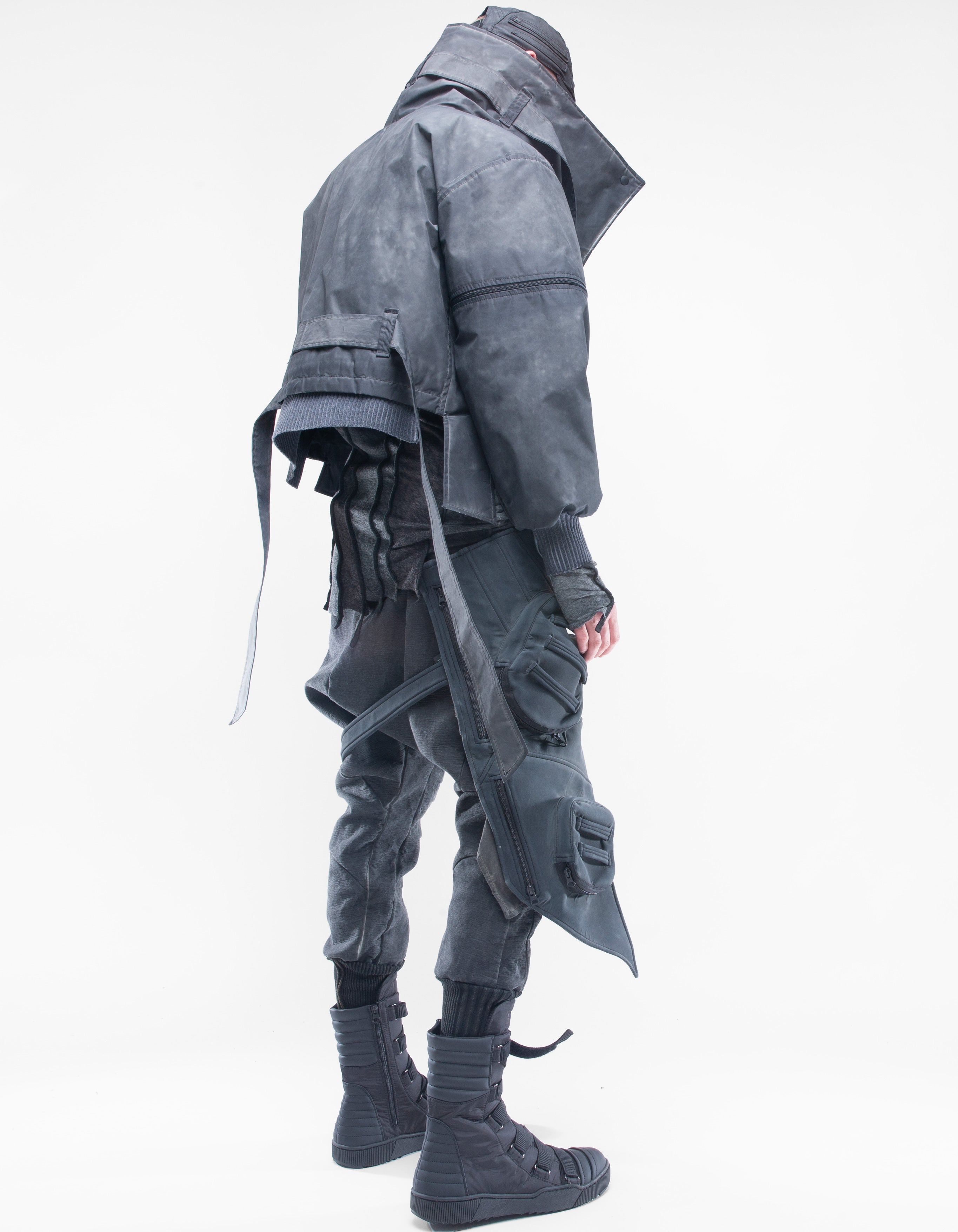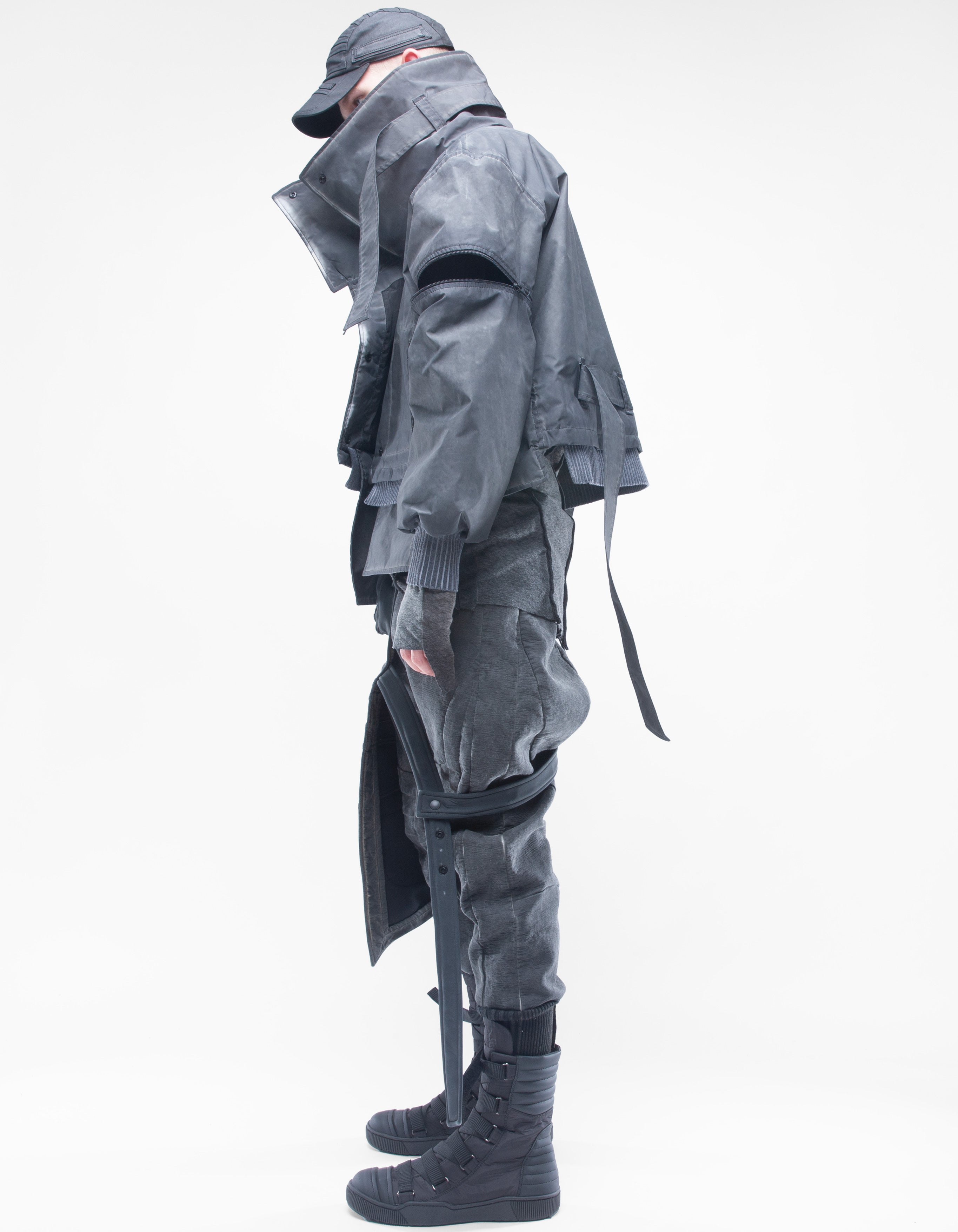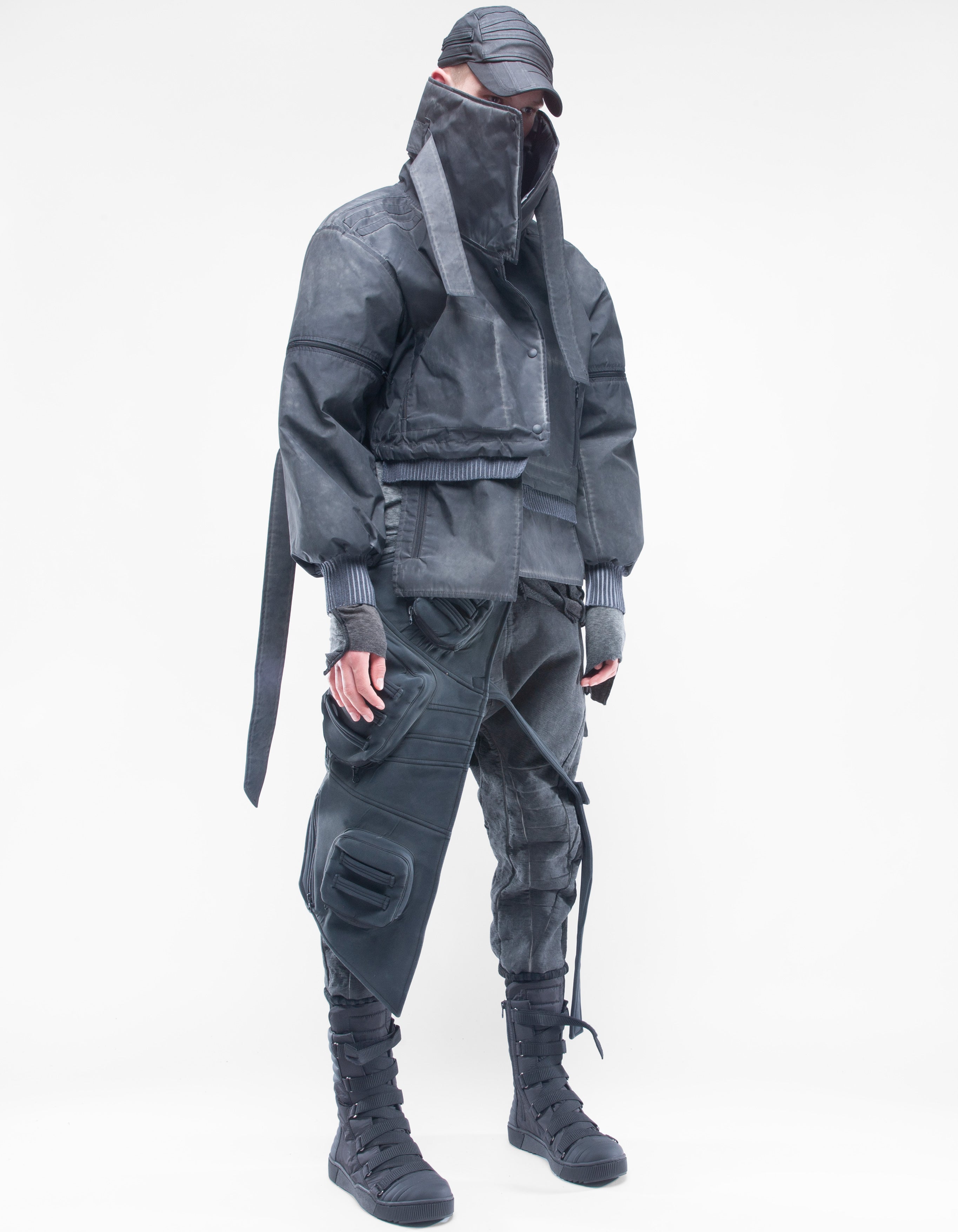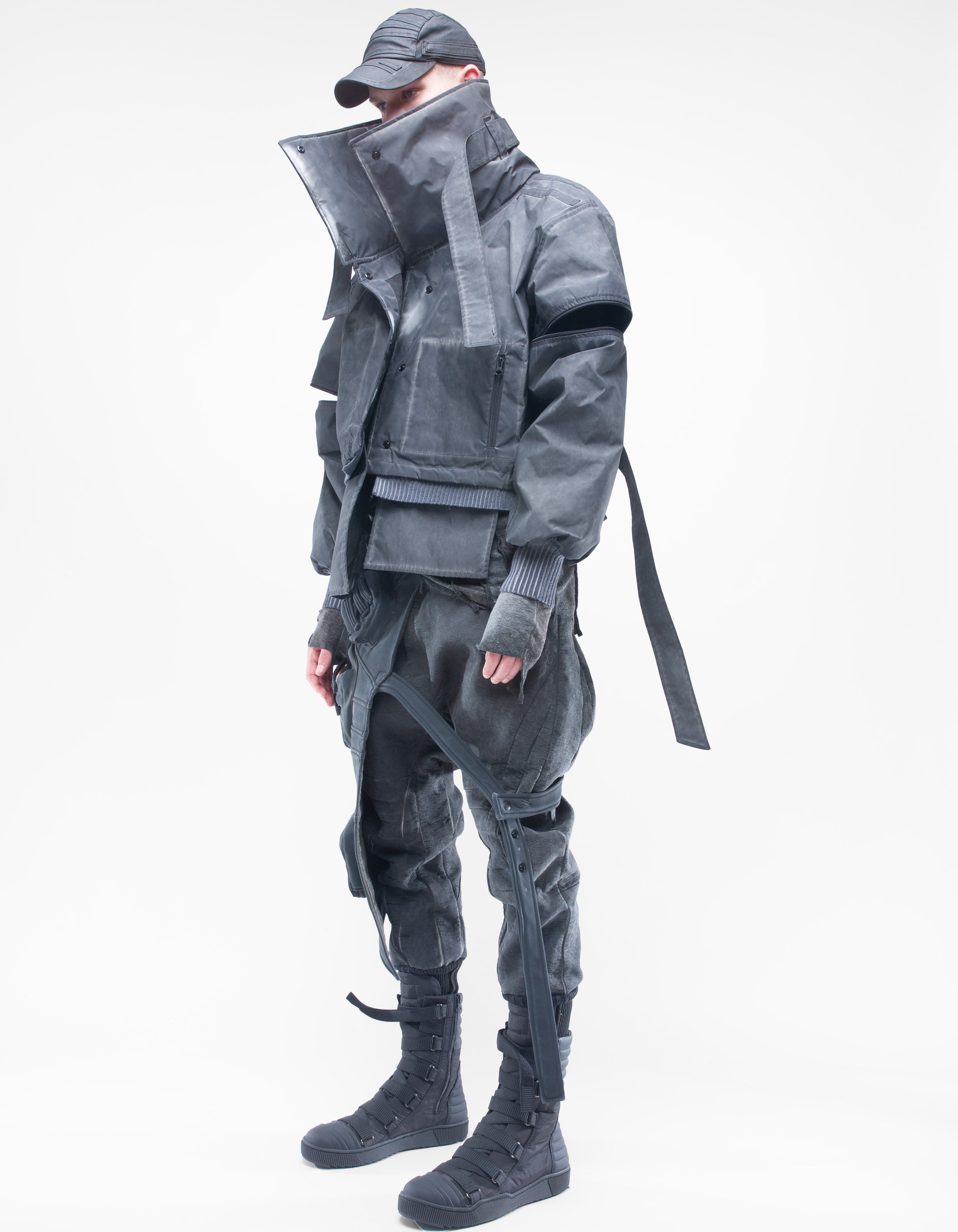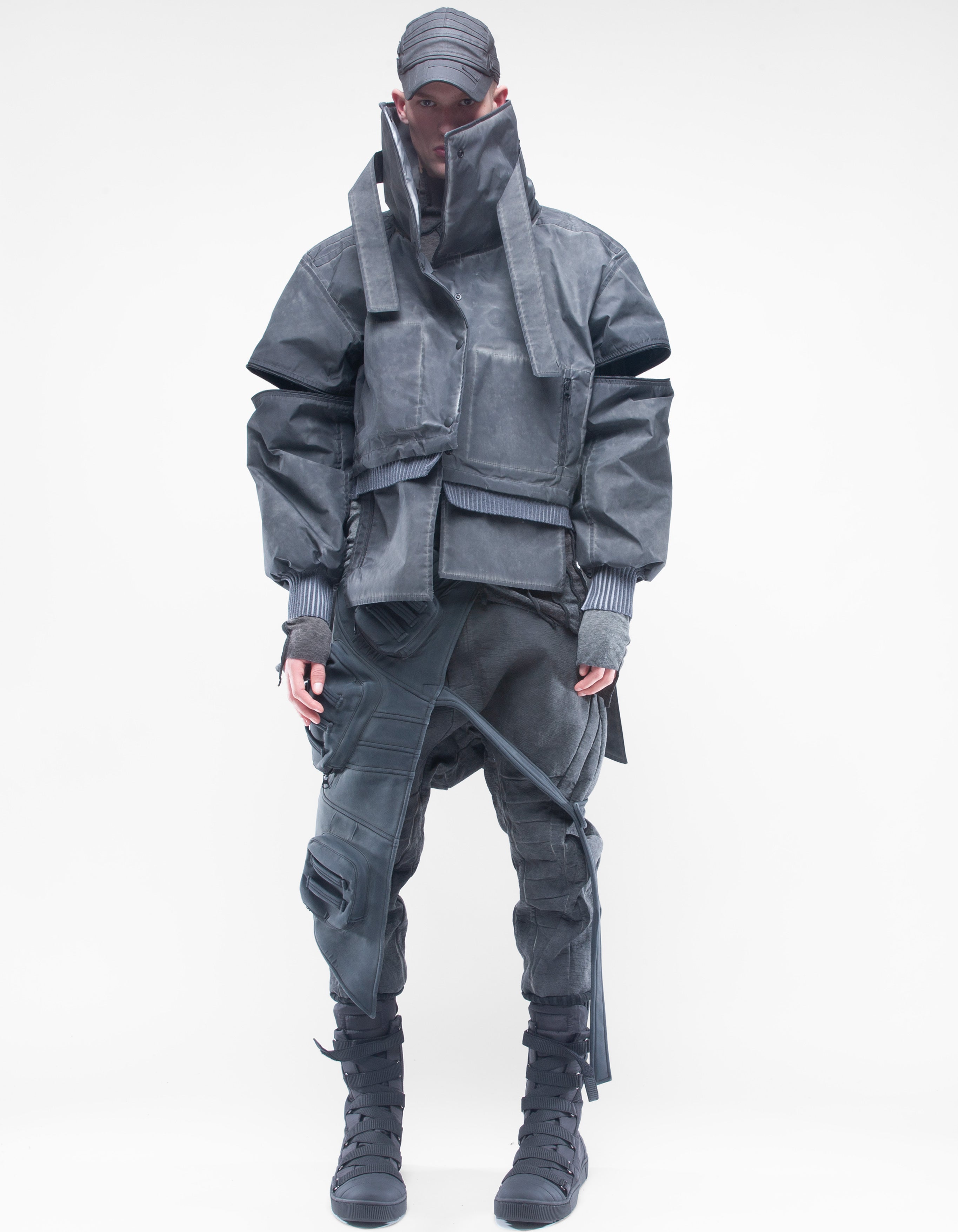 veste d'hiver courte à col haut en mac lourd, asymétrique, fermant par des boutons, manches ajustables par des zips, poches avant zippées