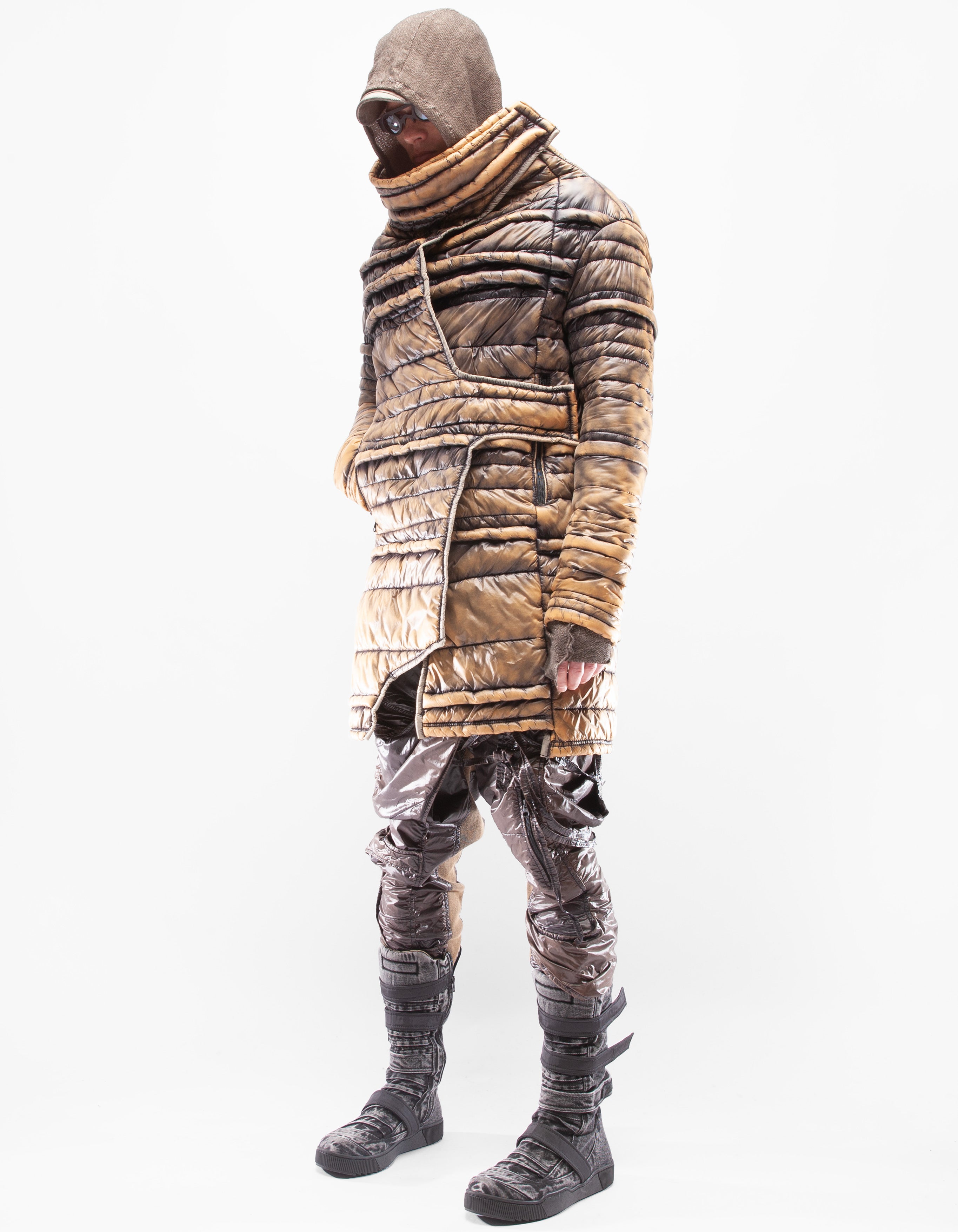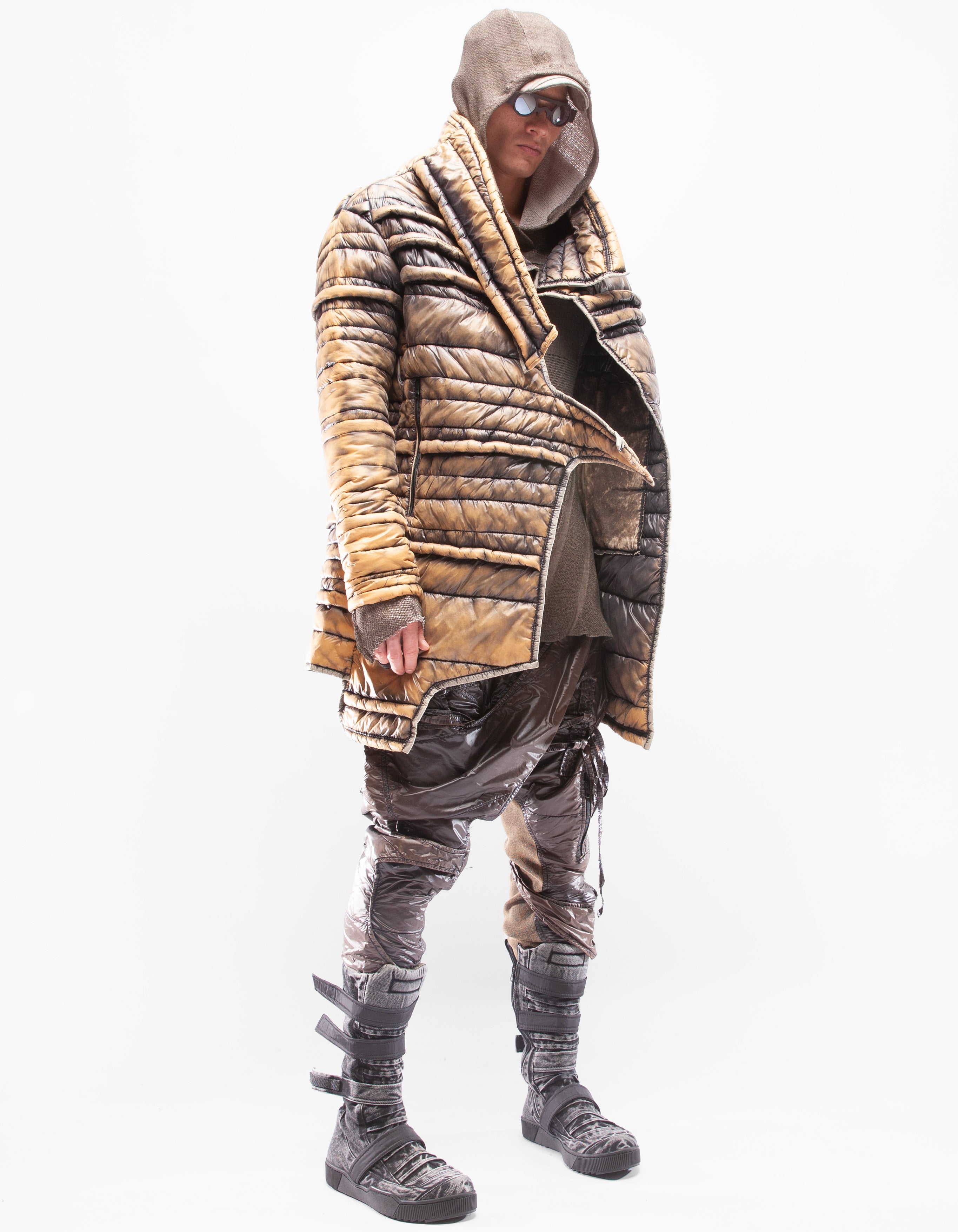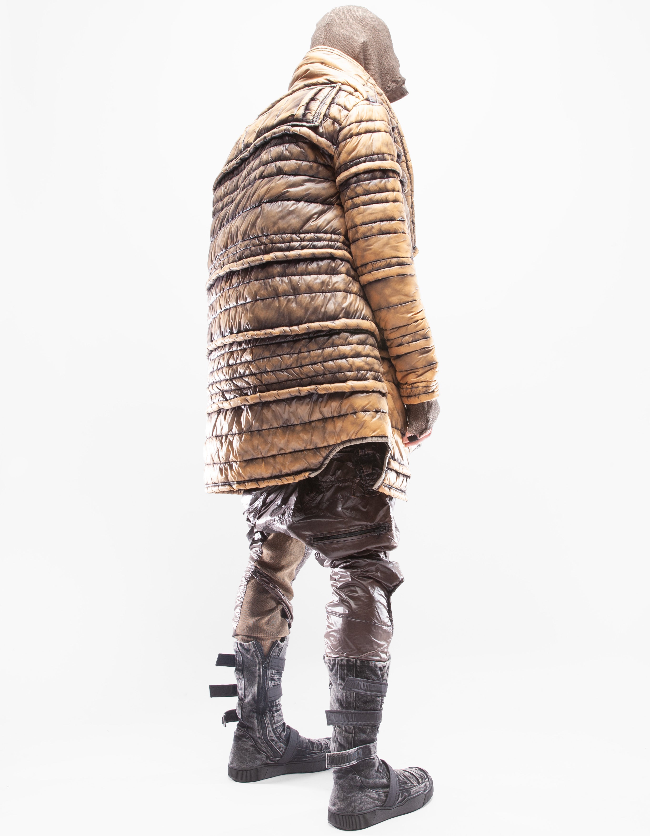 veste longue col montant en mac matelassée manuellement asymétrique et détaillée