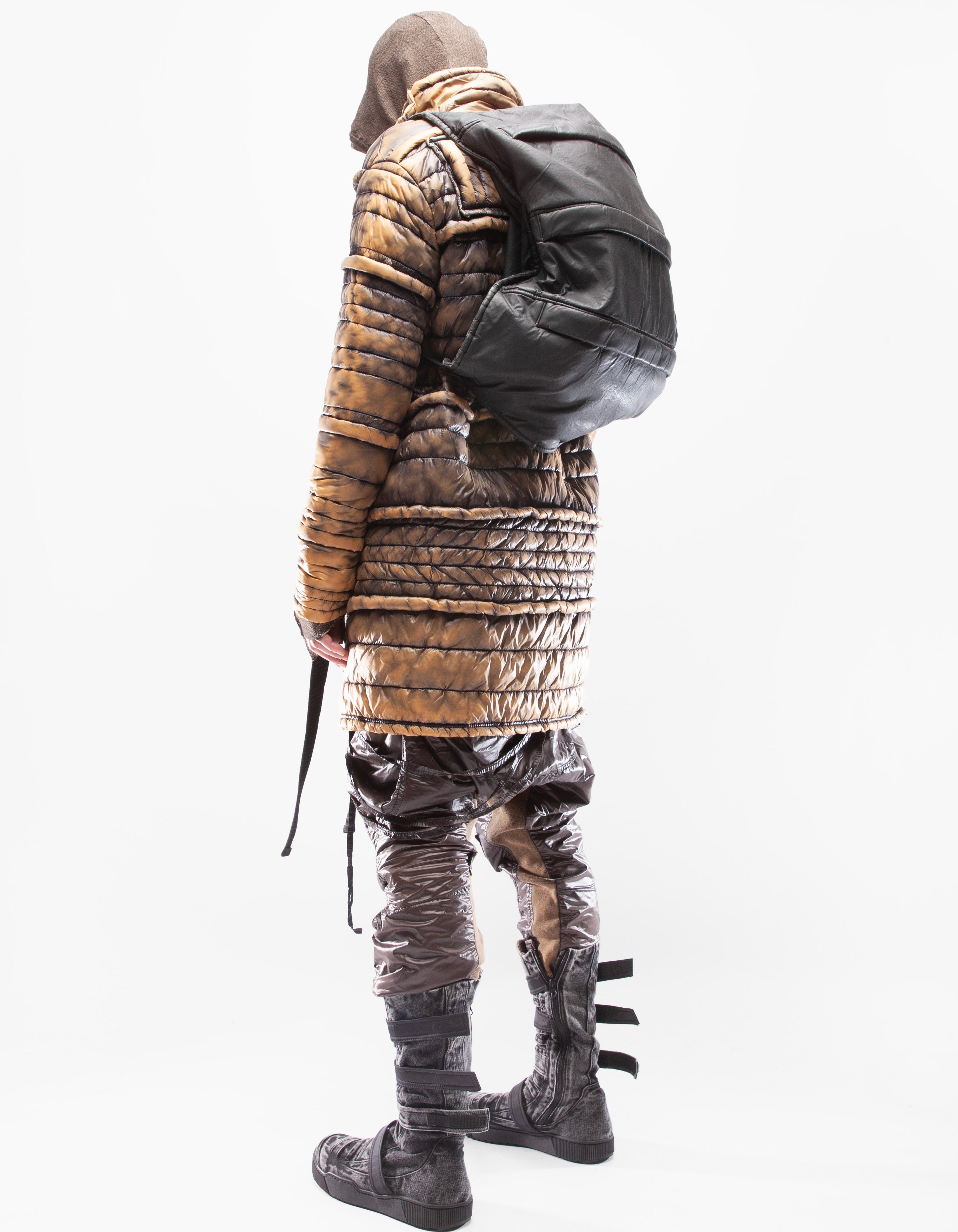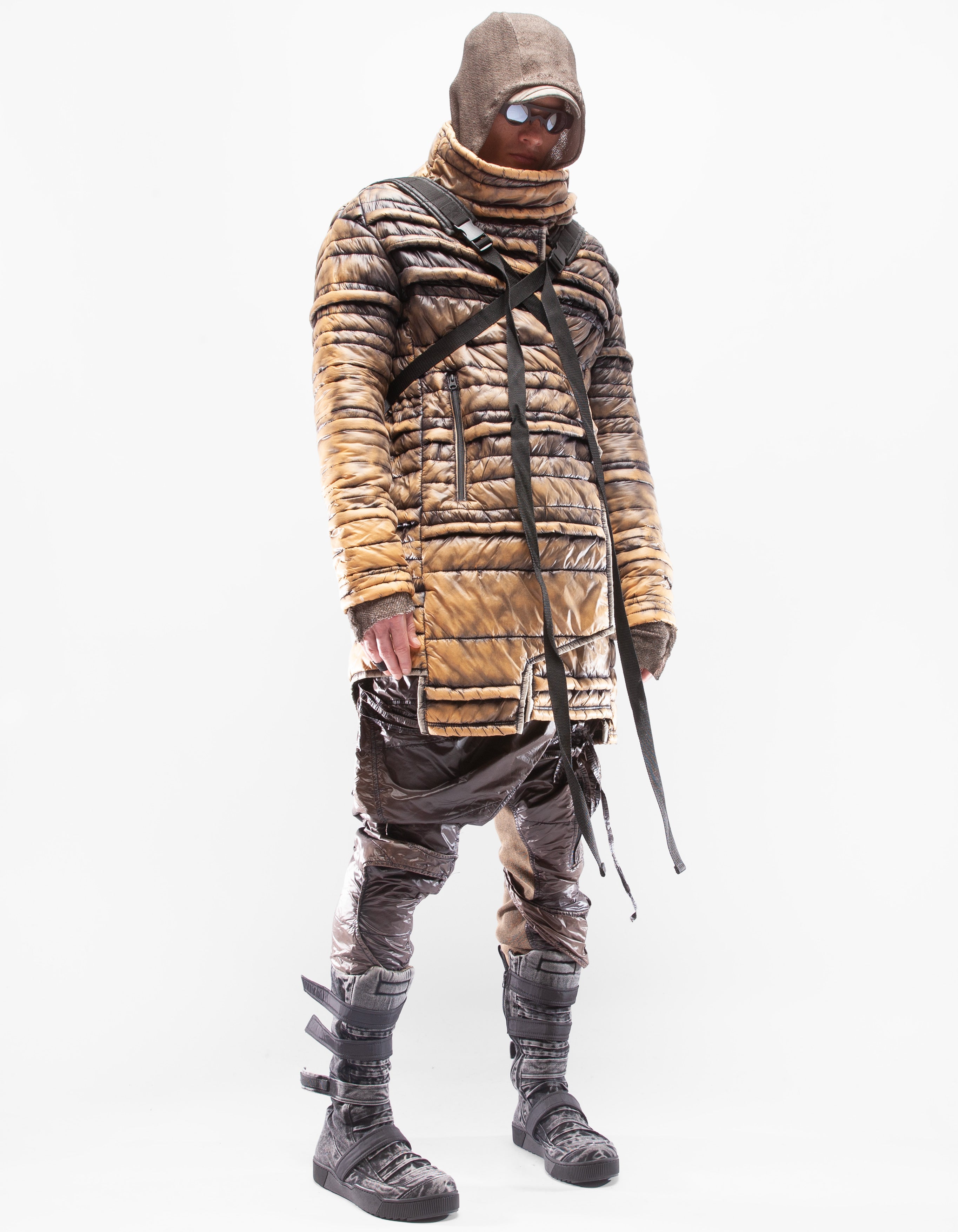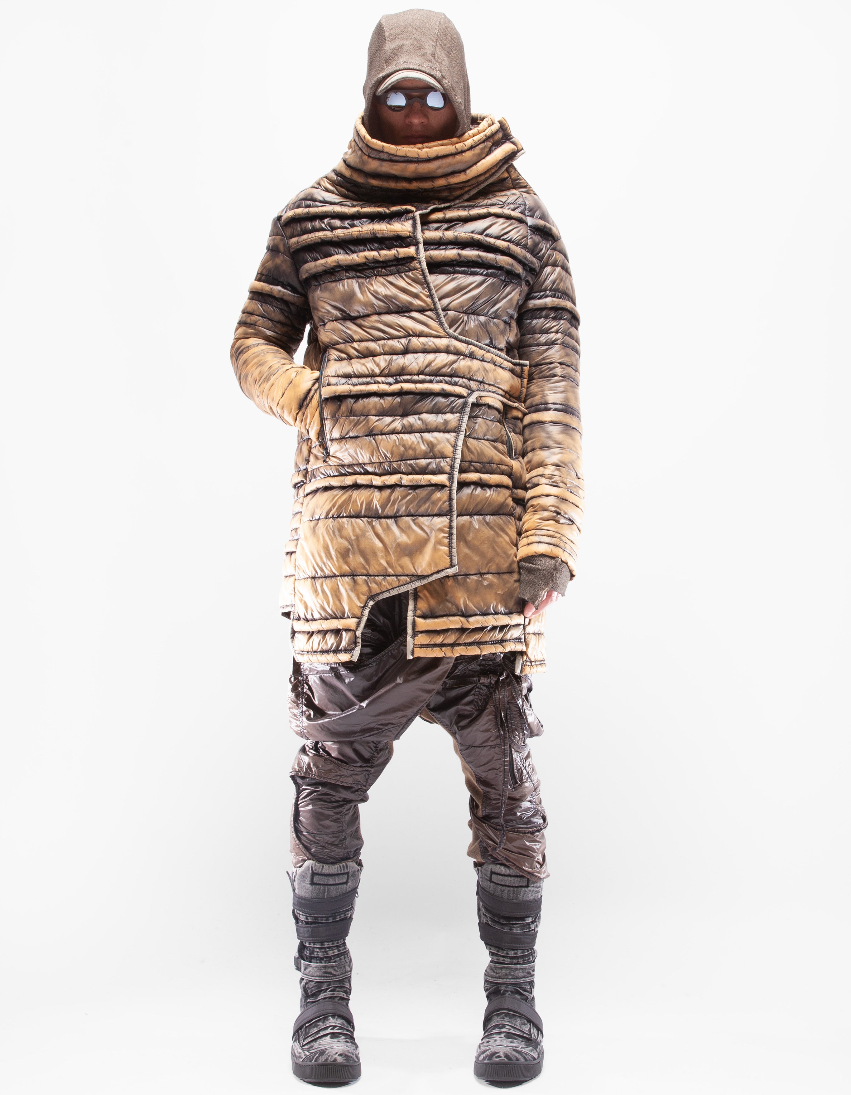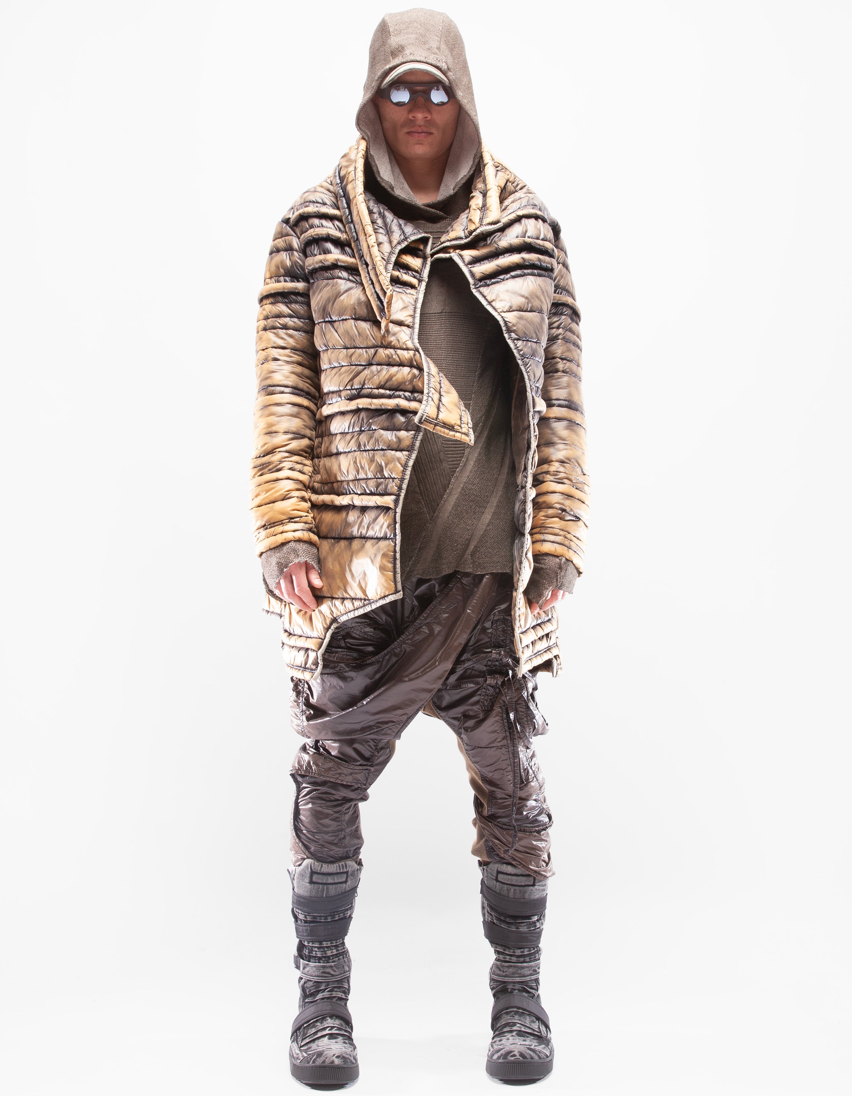 veste longue col montant en mac matelassée manuellement asymétrique et détaillée