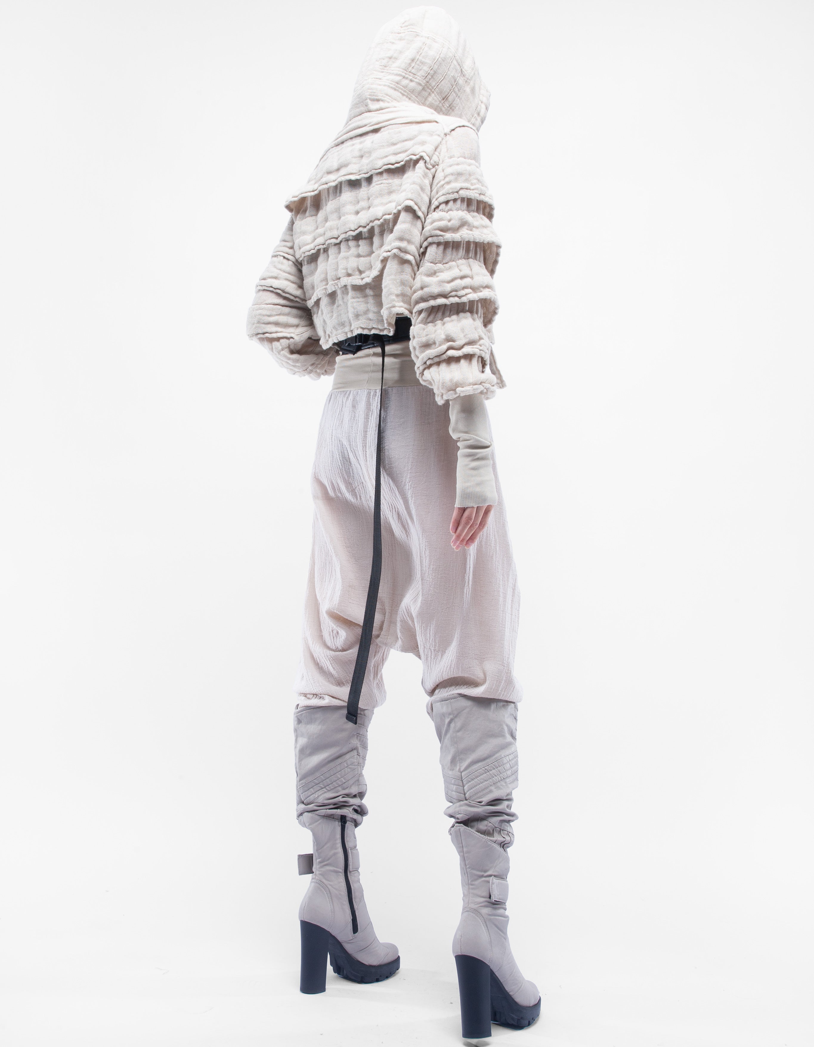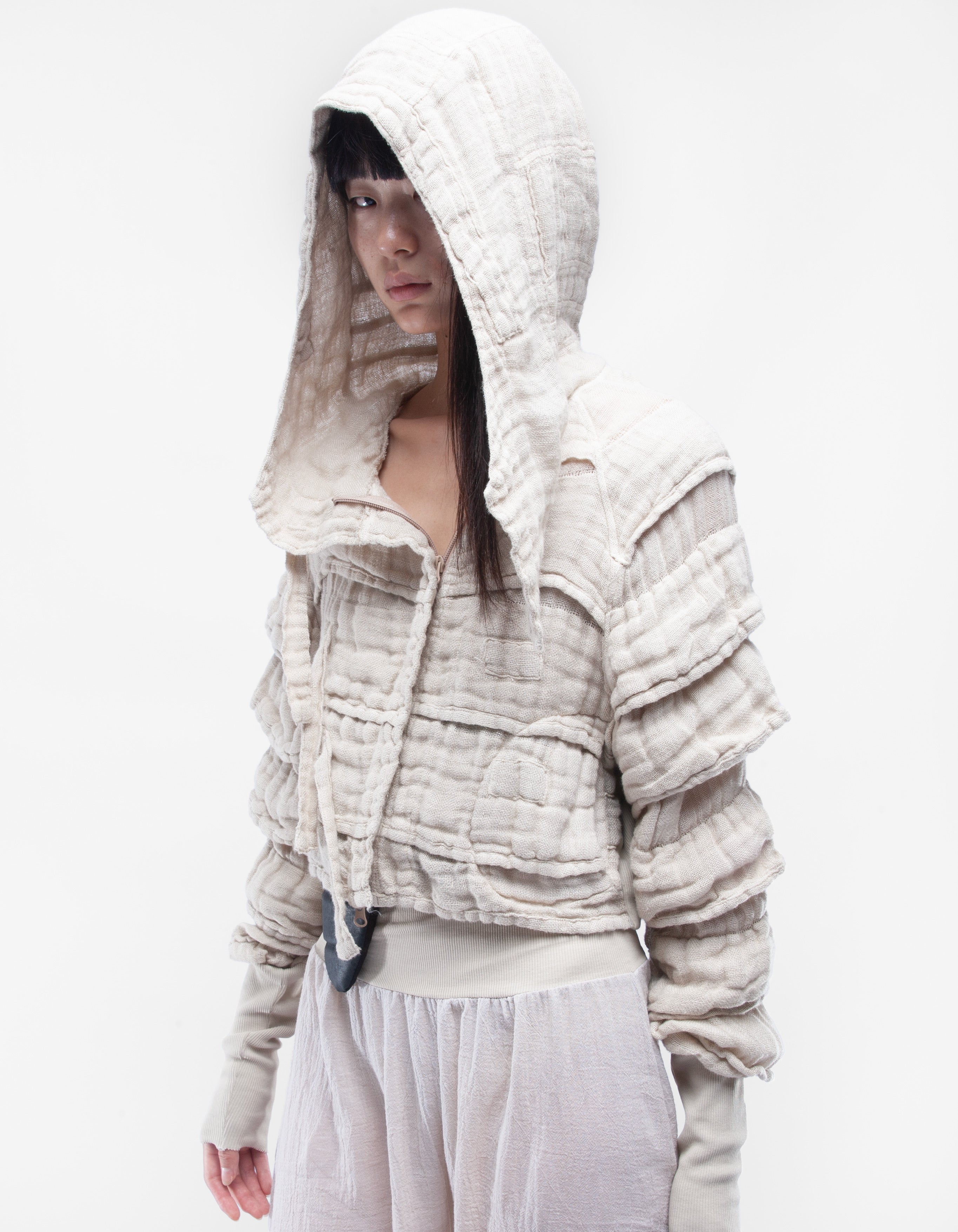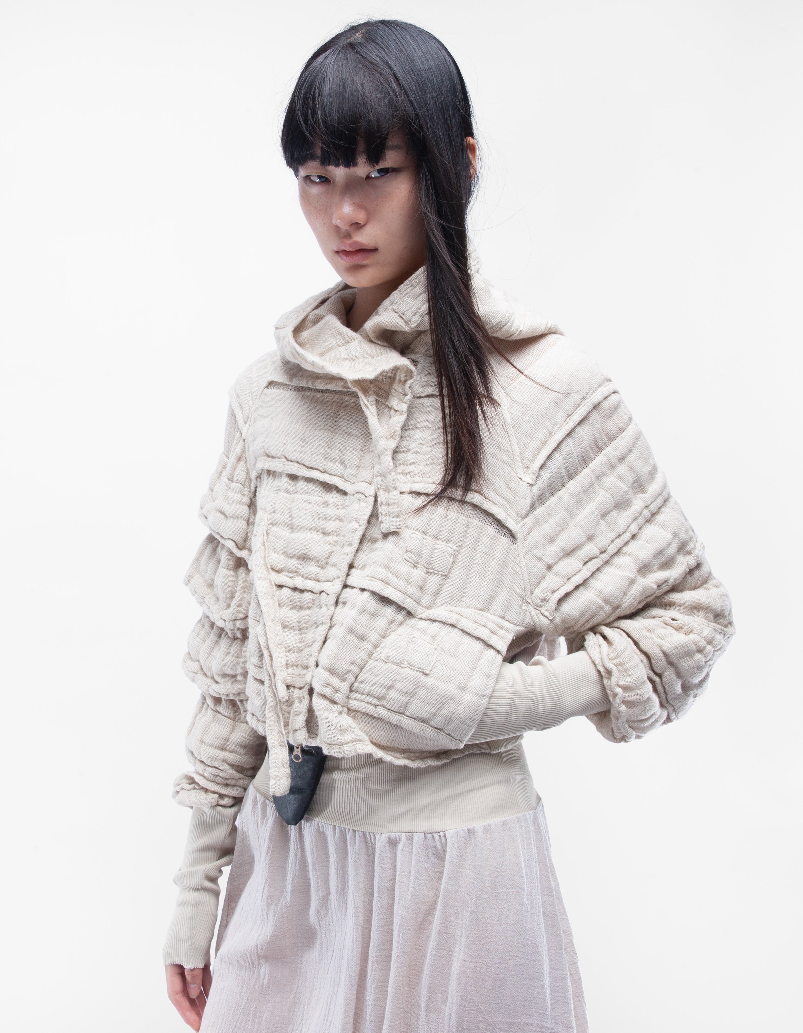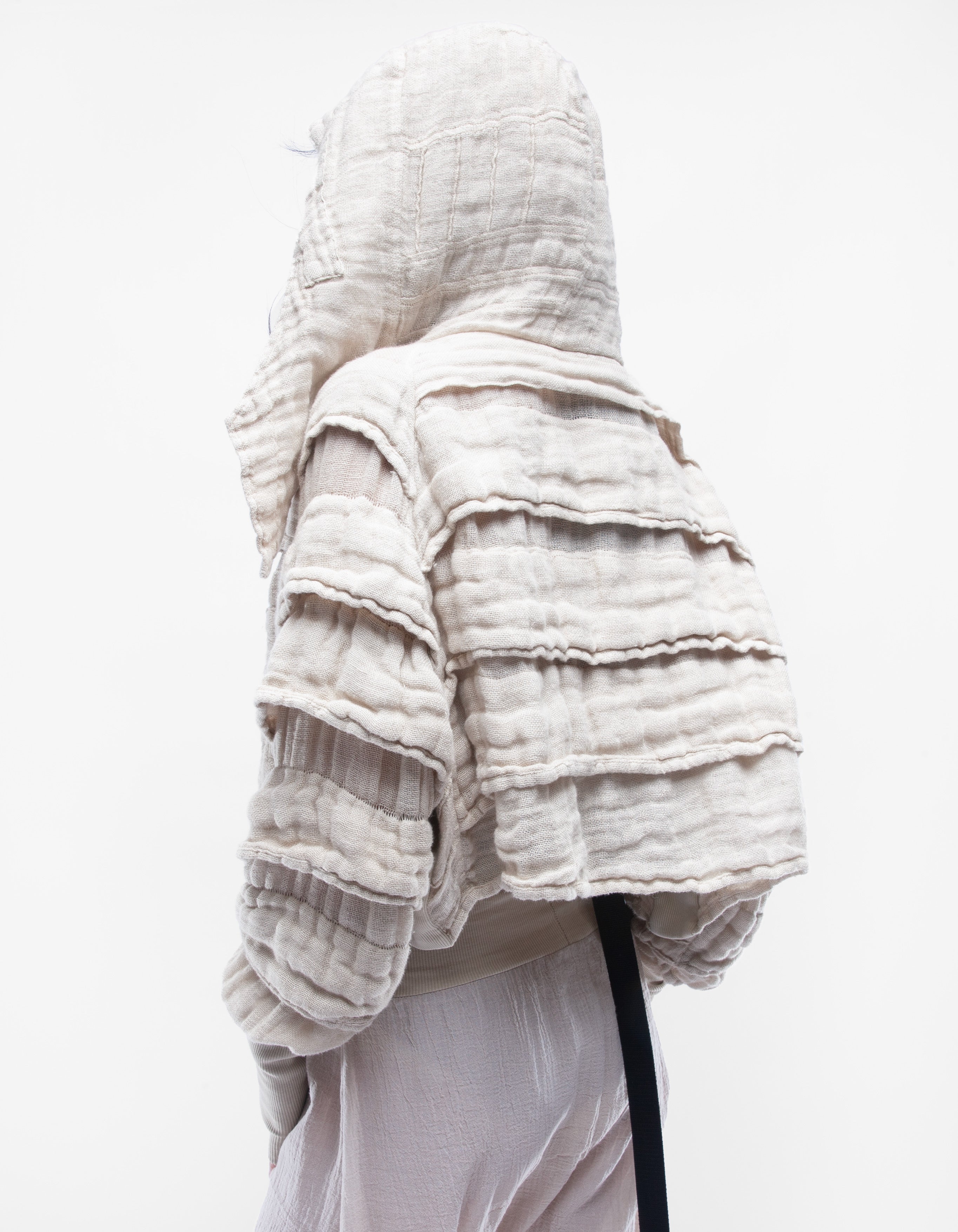 giacca corta asimmetrica con cappuccio in lino naturale stratificato e dettagliato