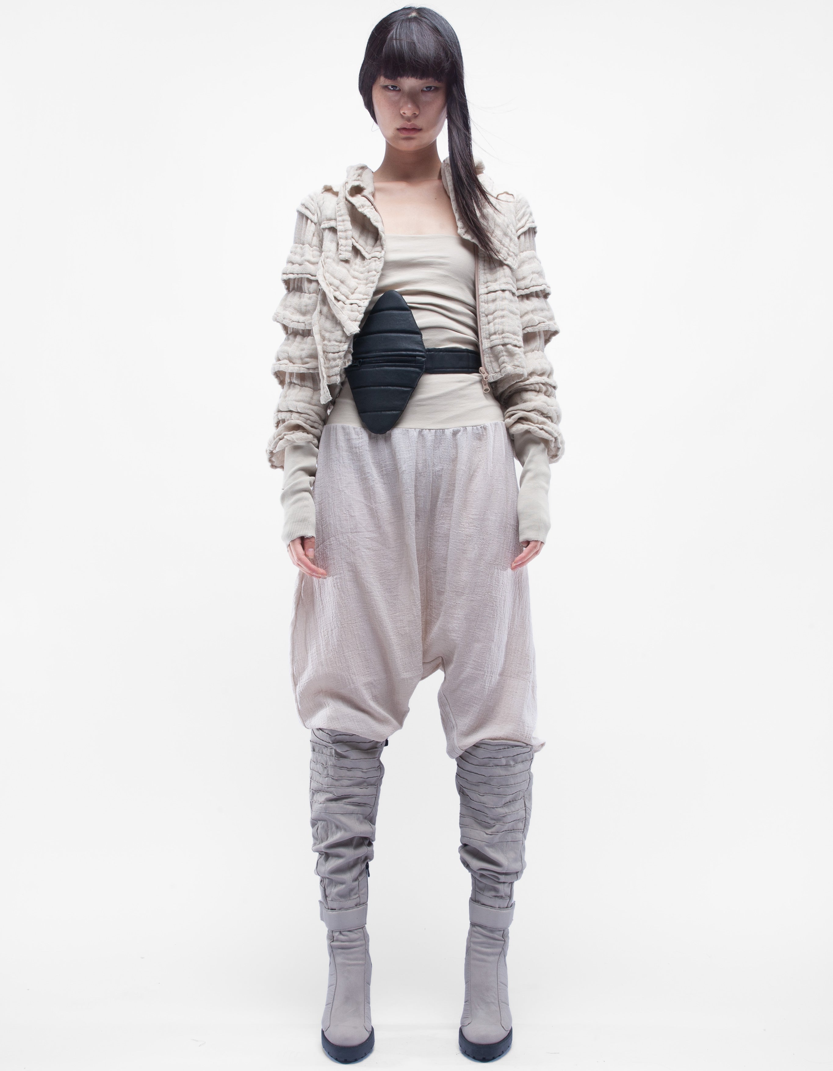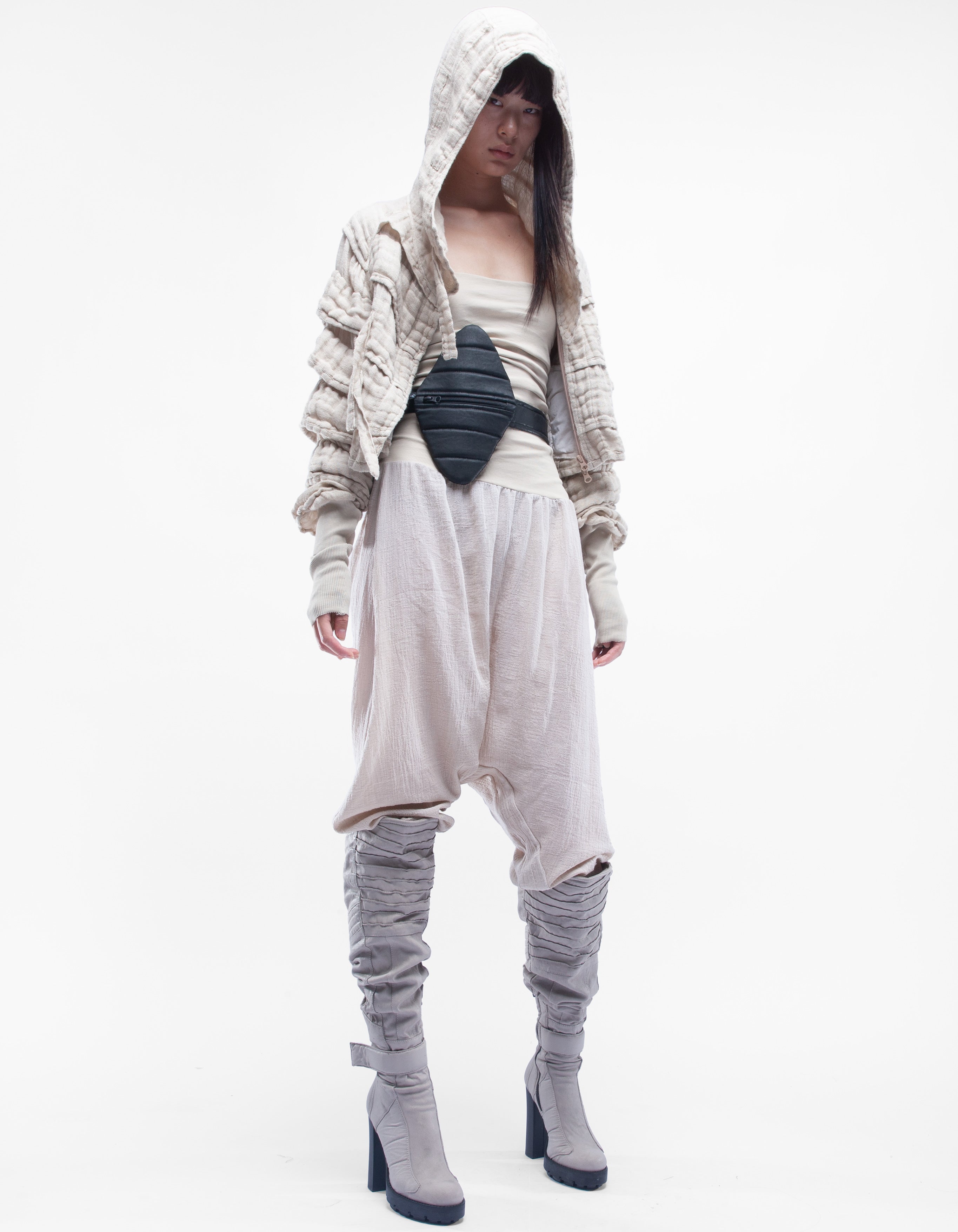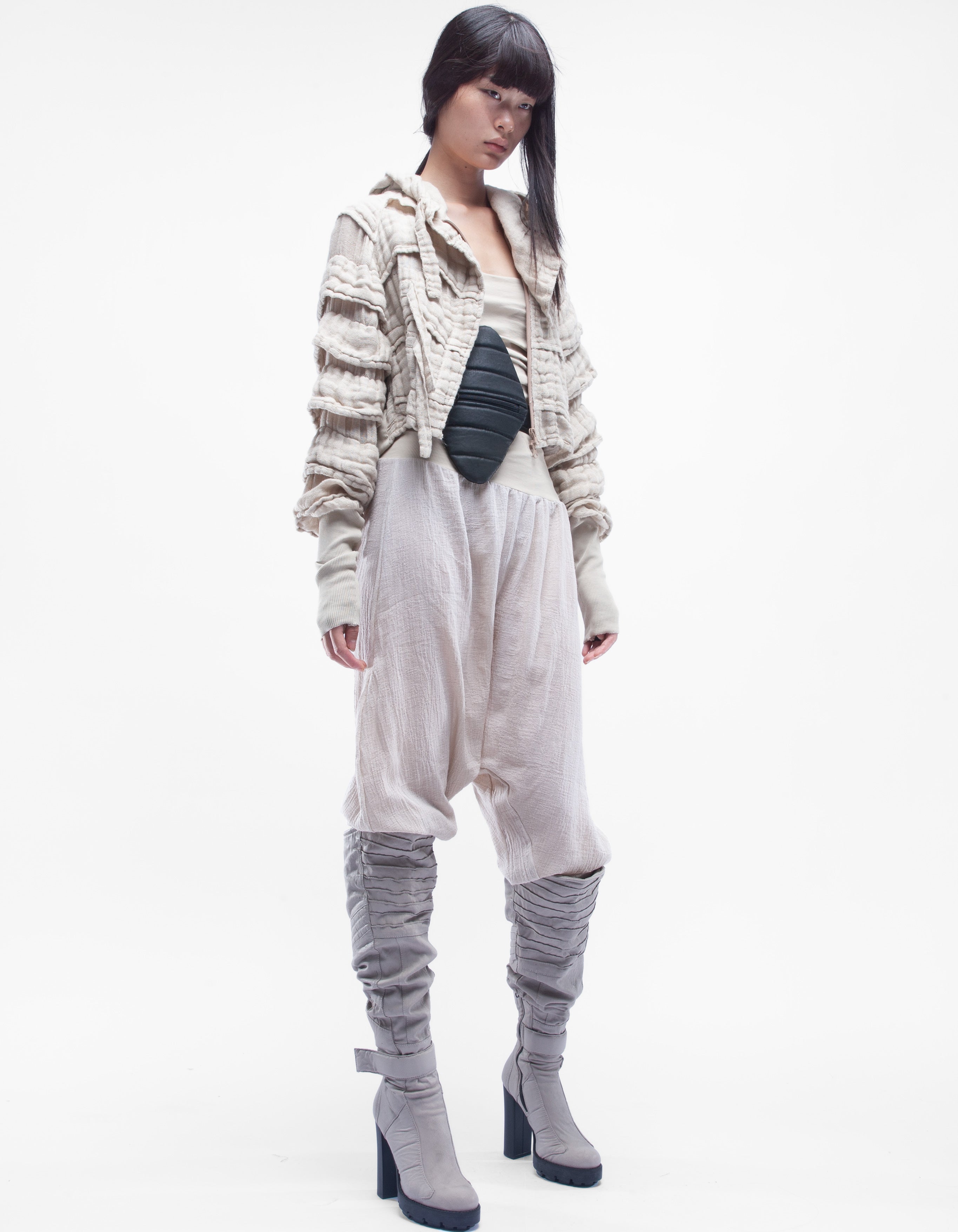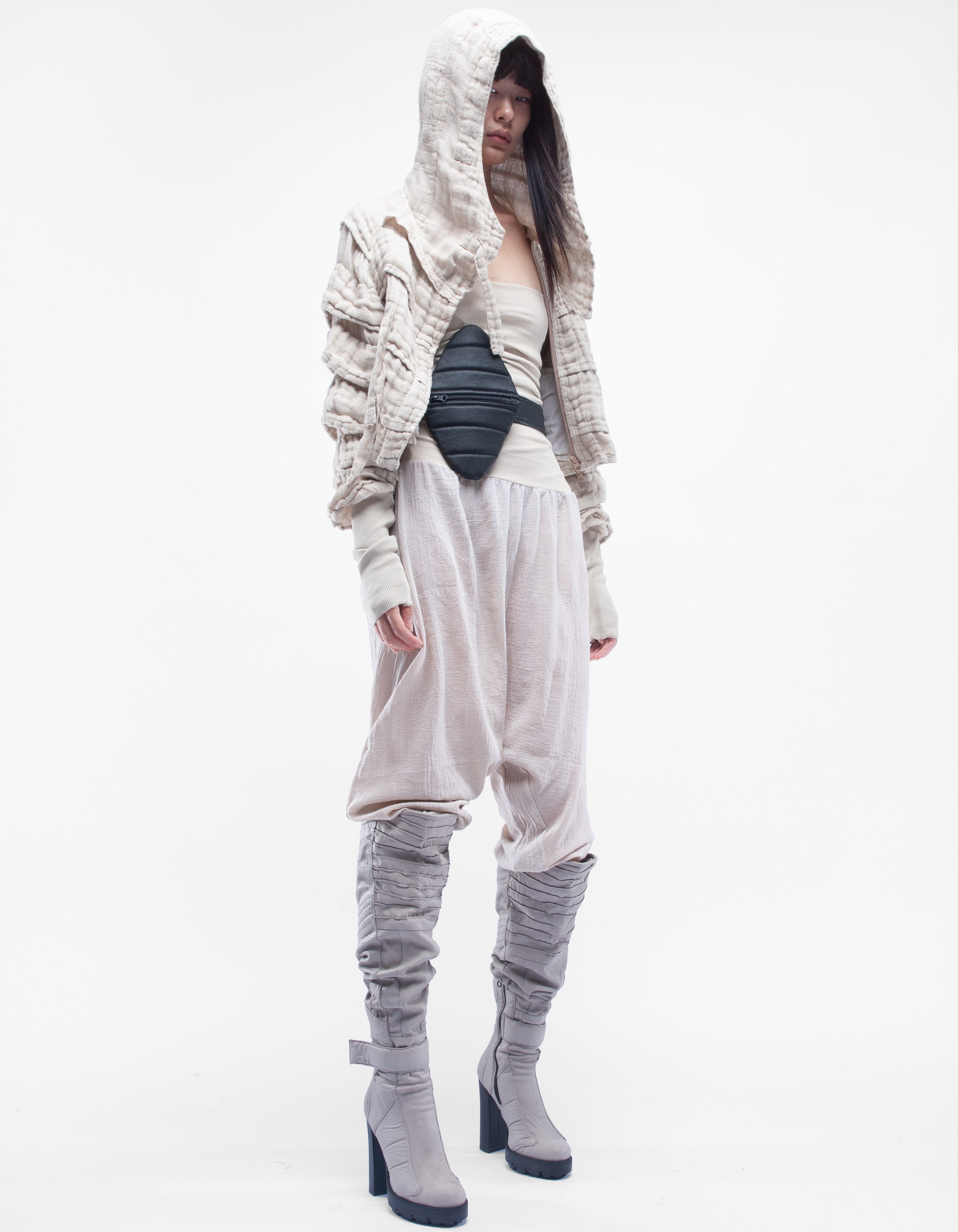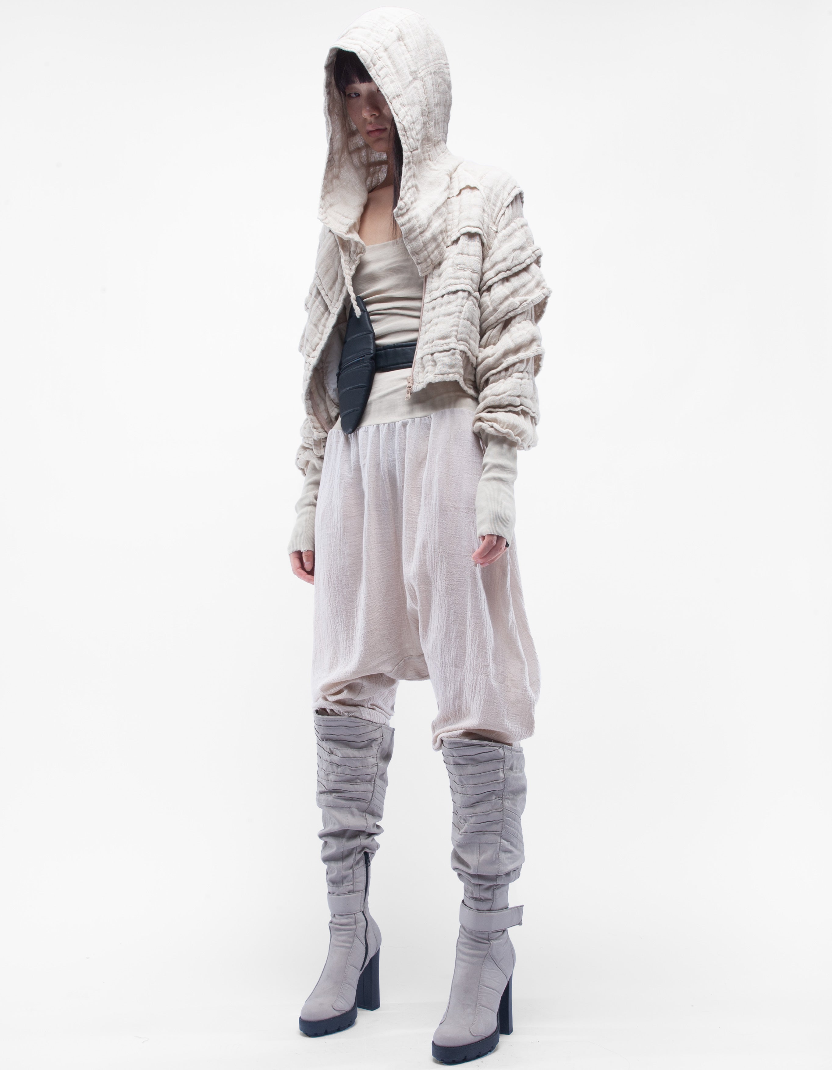 giacca corta asimmetrica con cappuccio in lino naturale stratificato e dettagliato