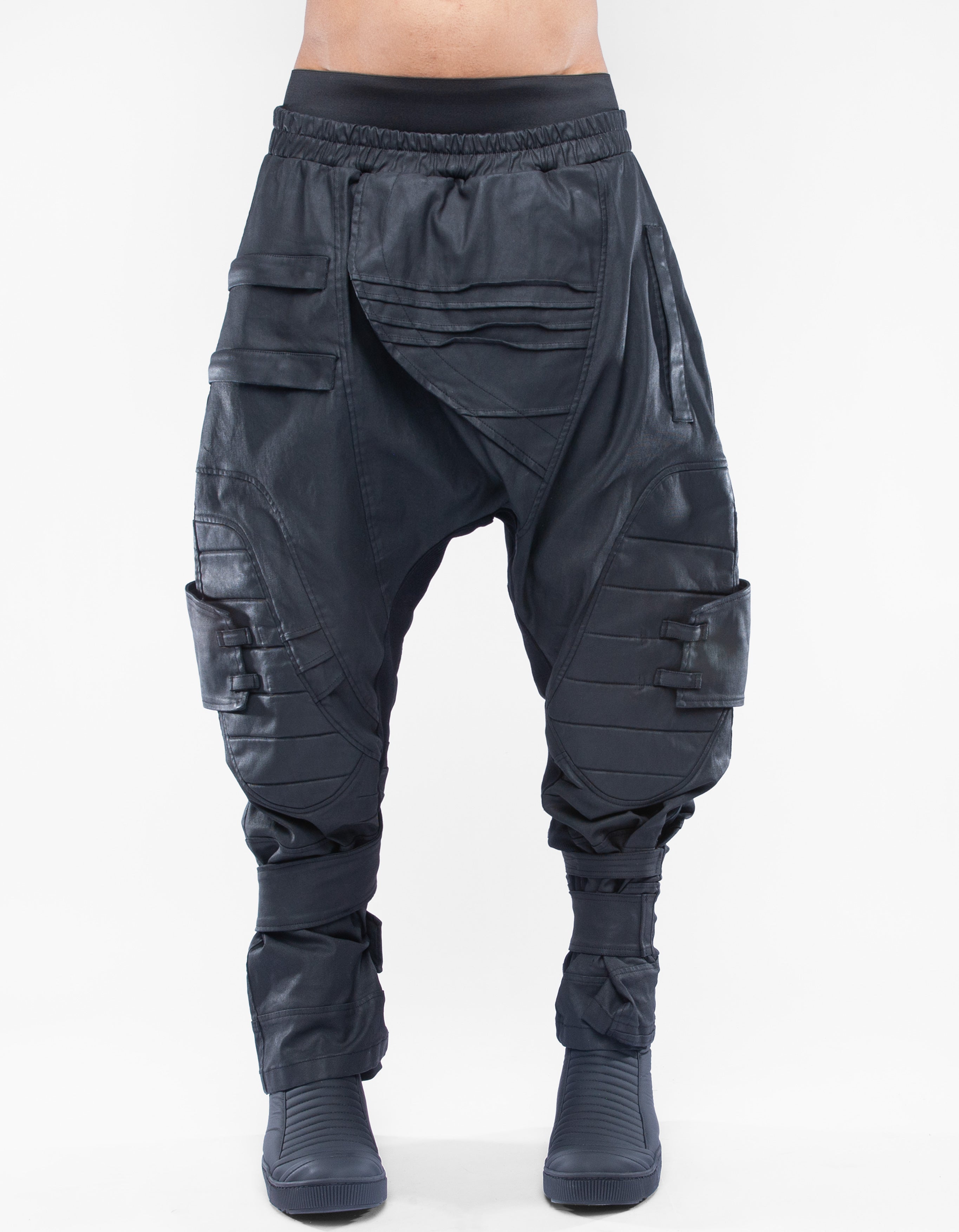 waxed detailed elastic denim baggy trousers