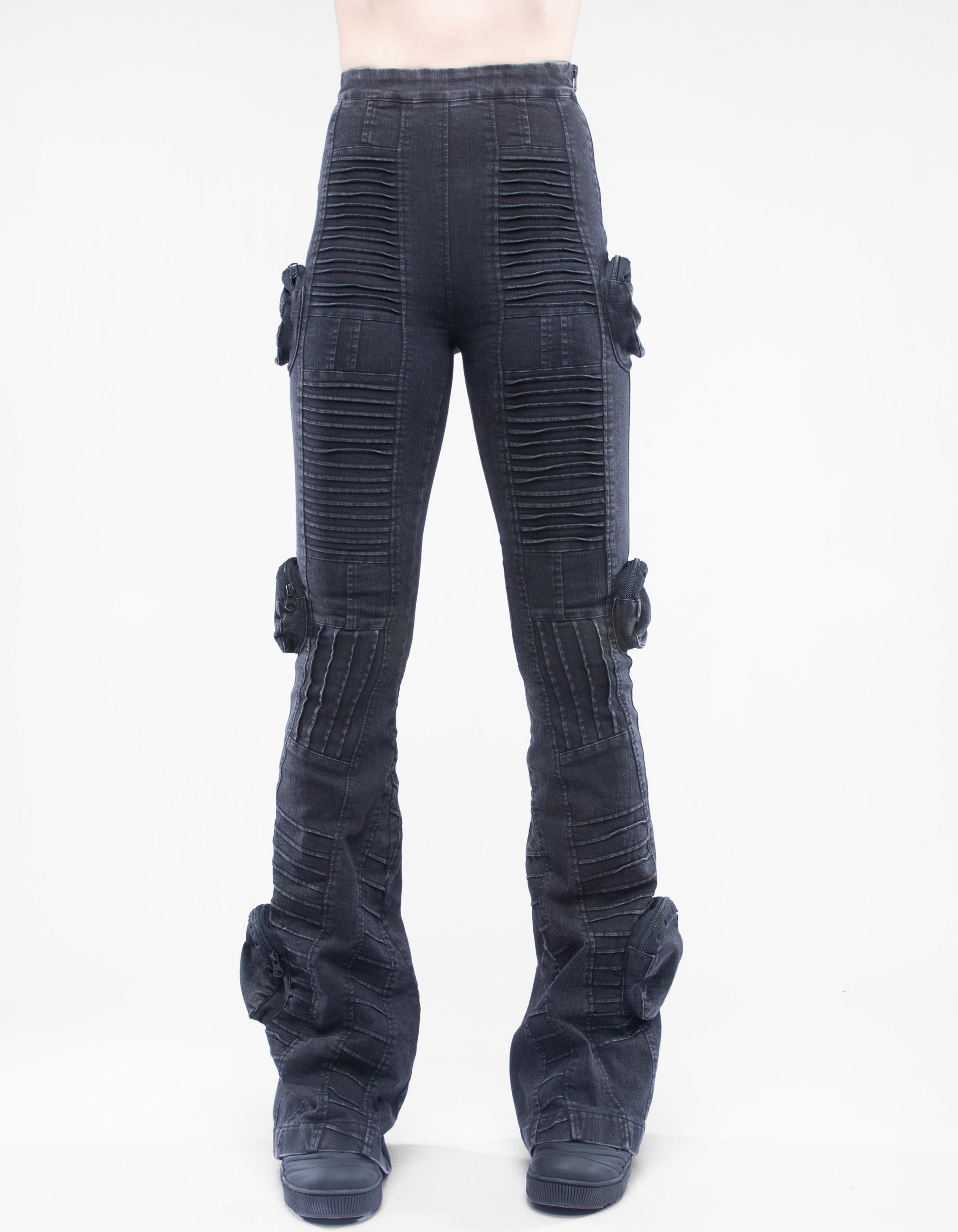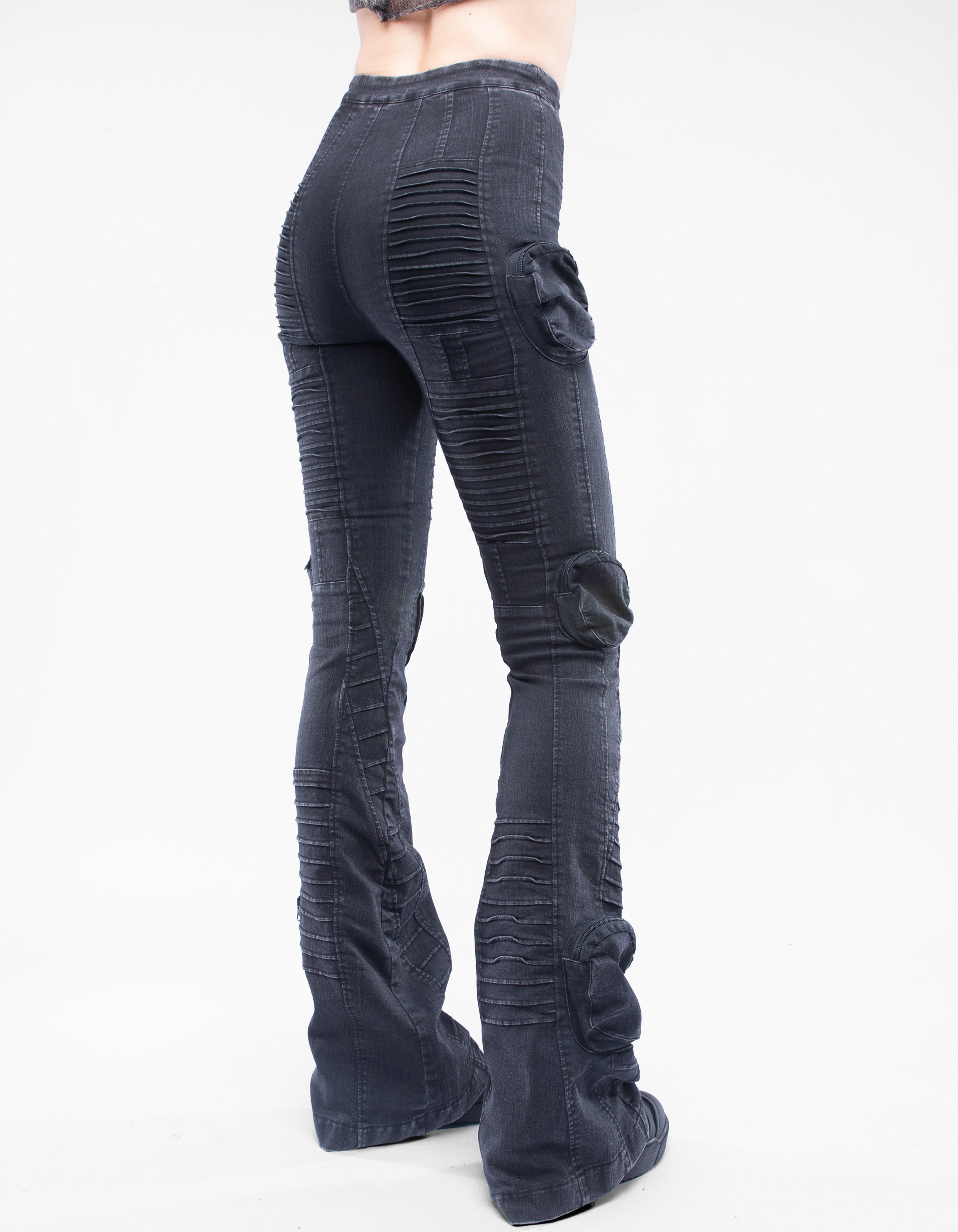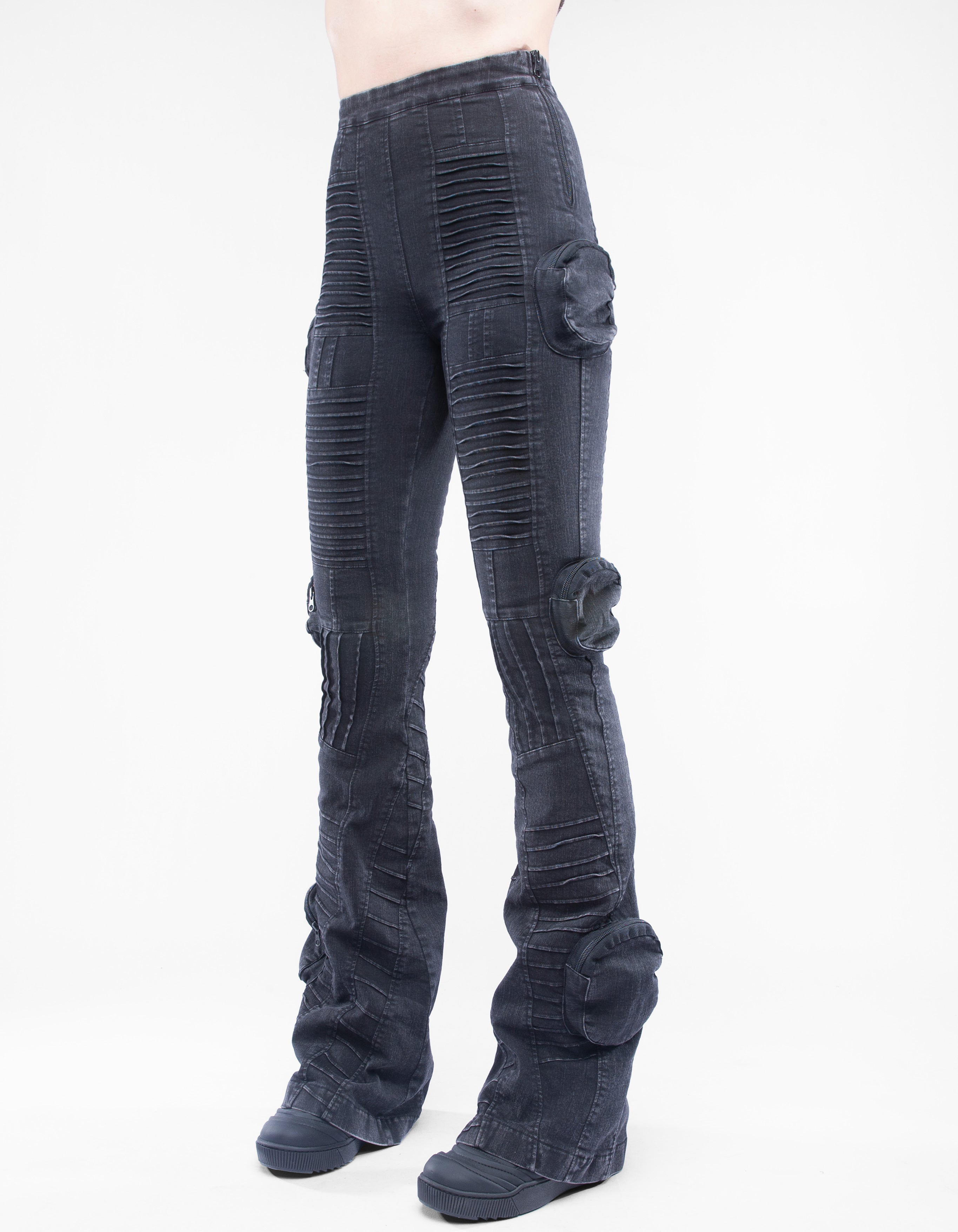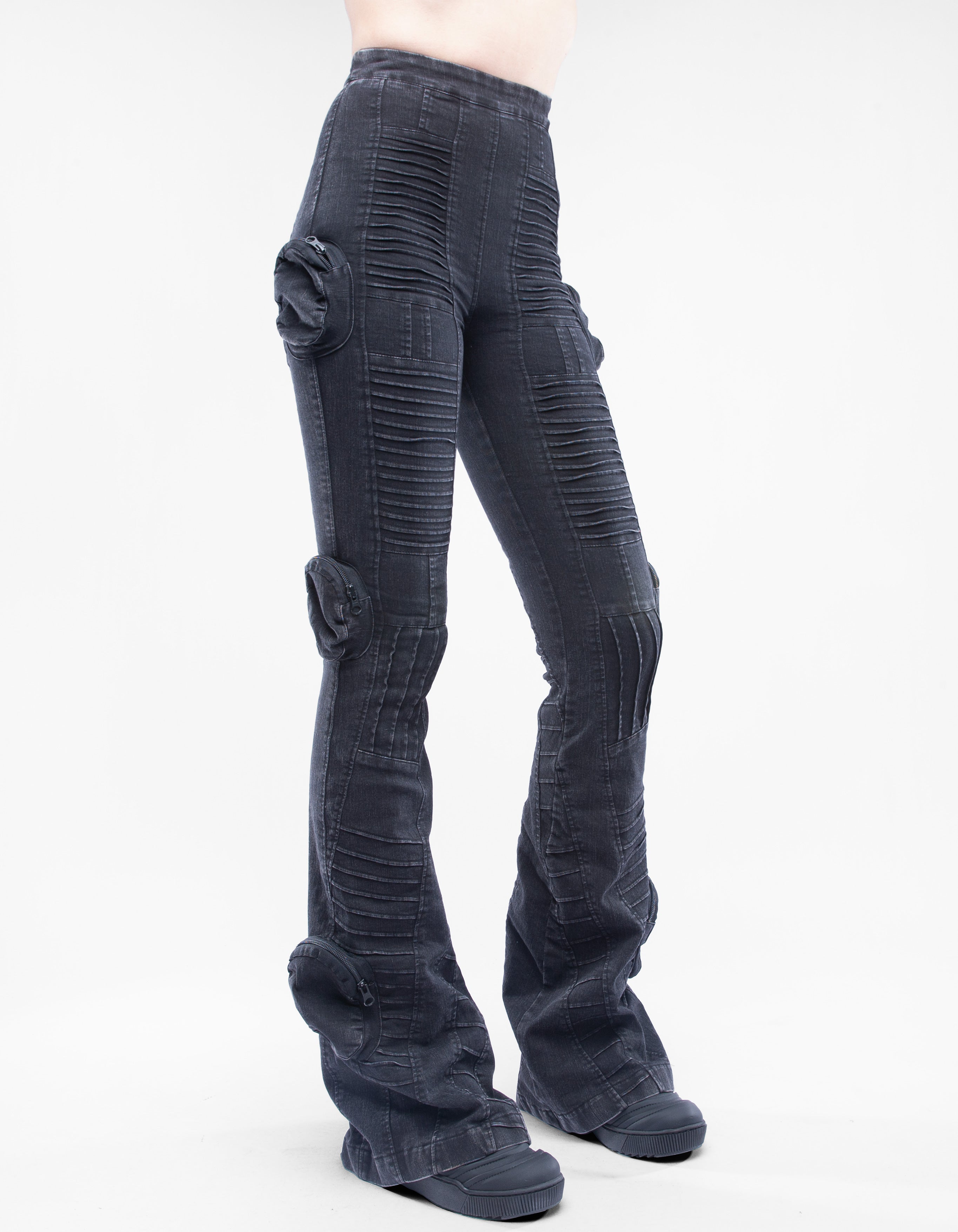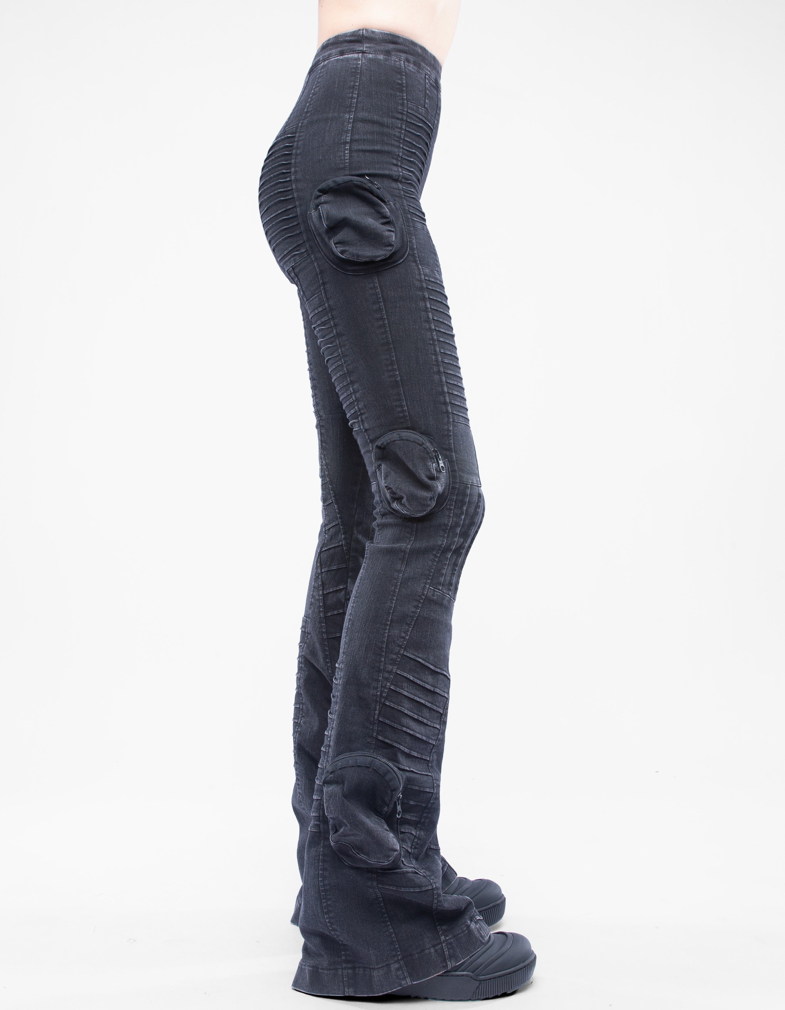 black vintage-washed flared jeans, elastic fit with detailed ribbed geometry, zipped circular combat pockets