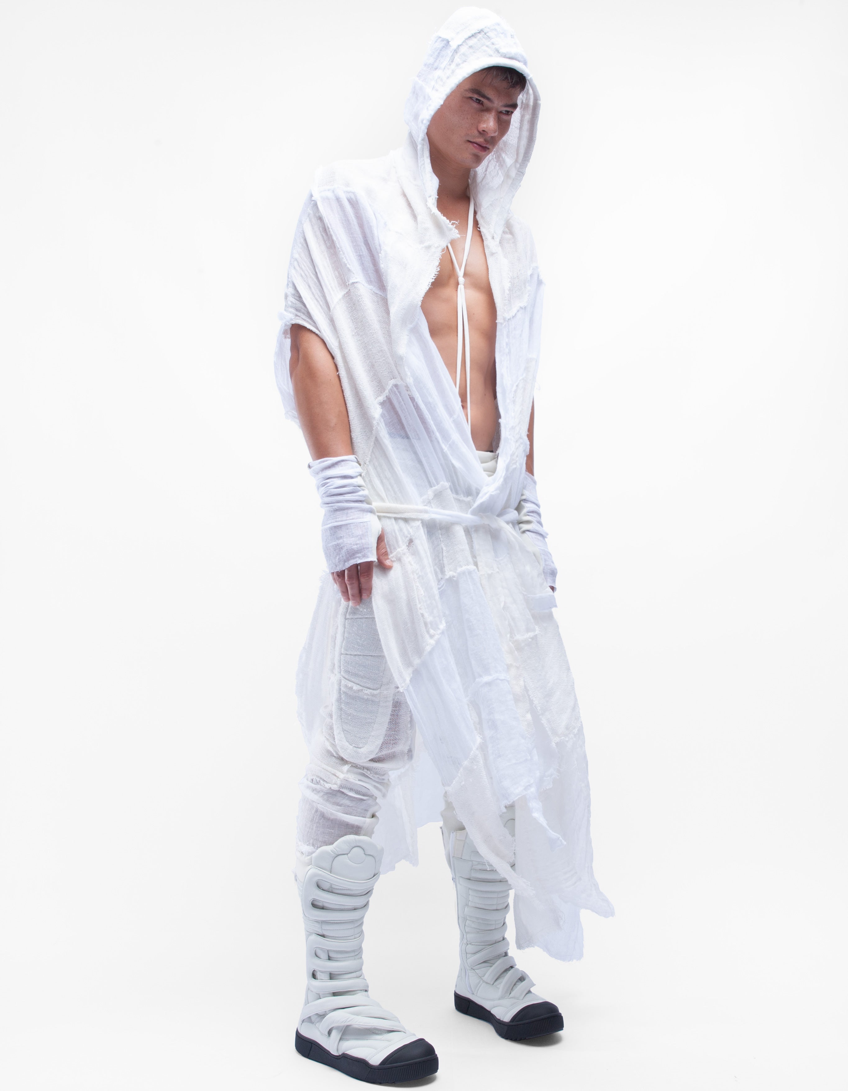 cardigan lungo senza maniche con cappuccio in lino naturale dettagliato