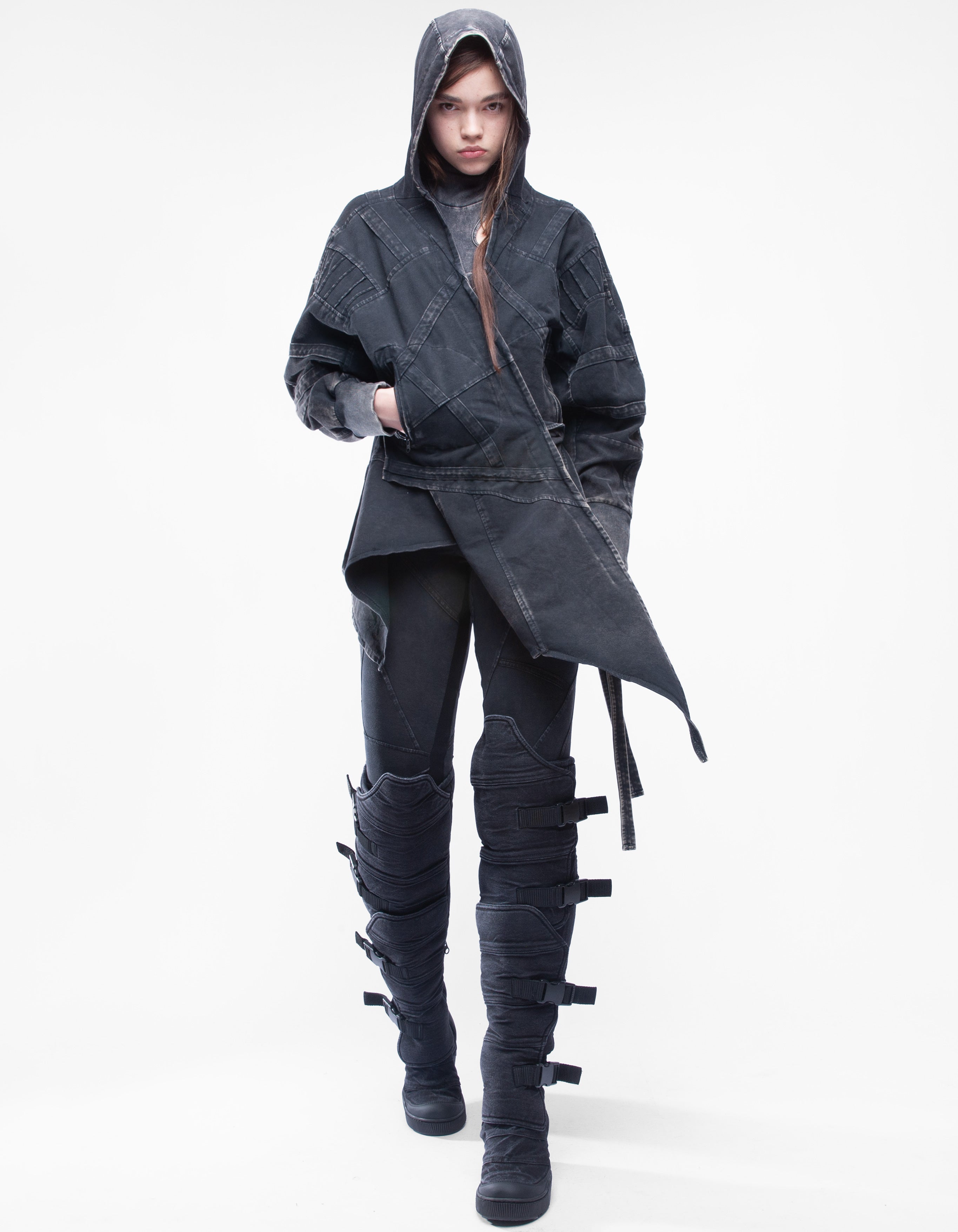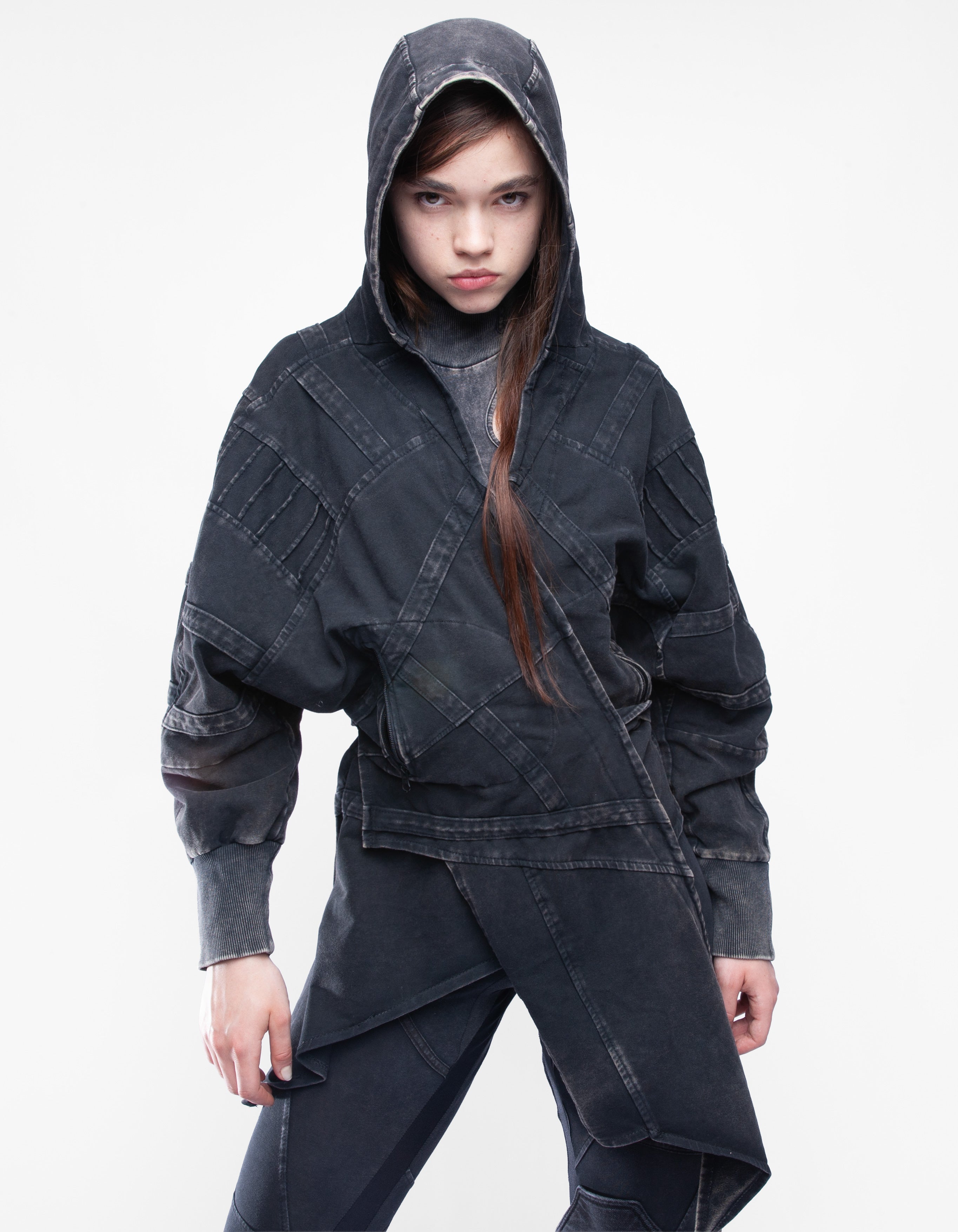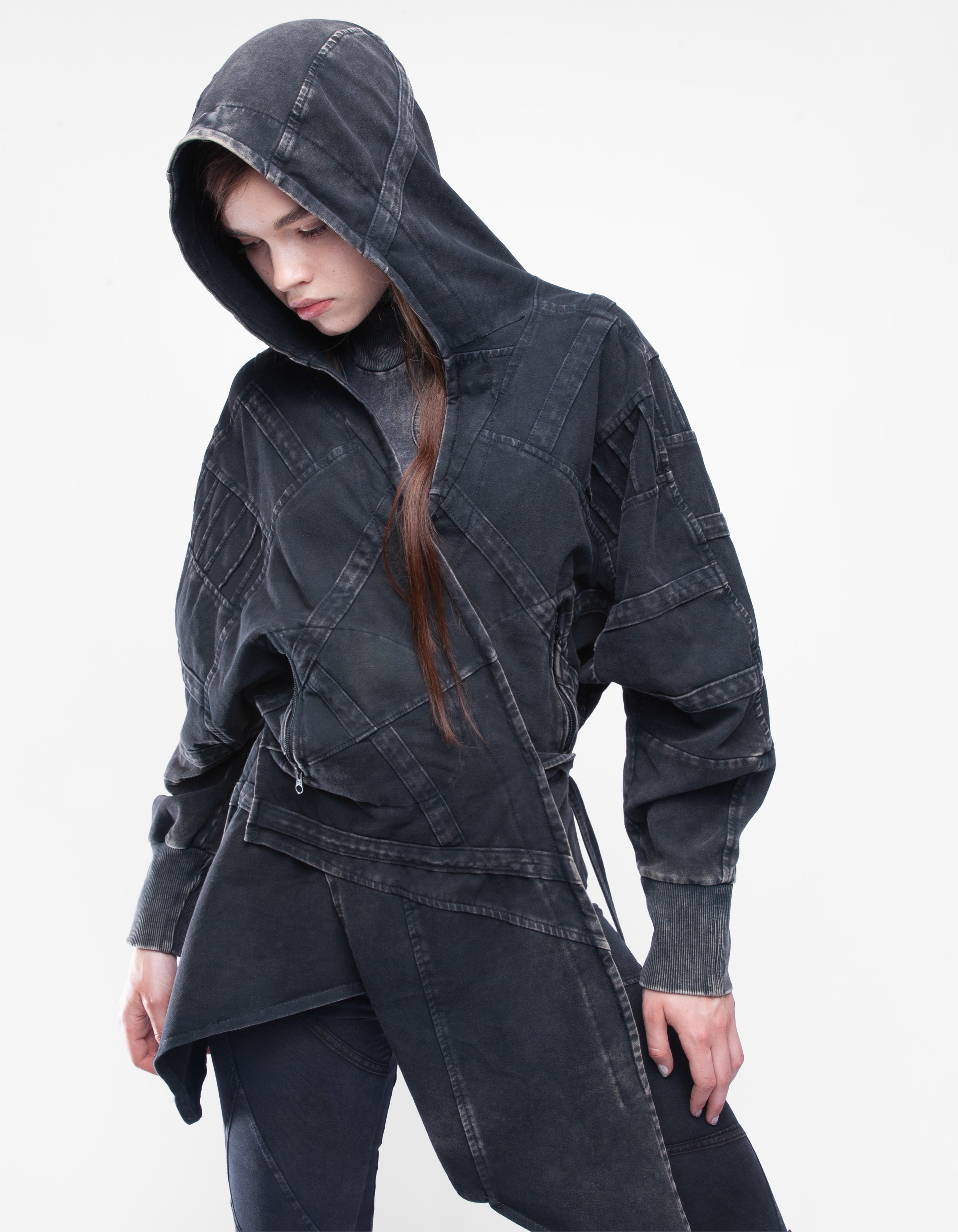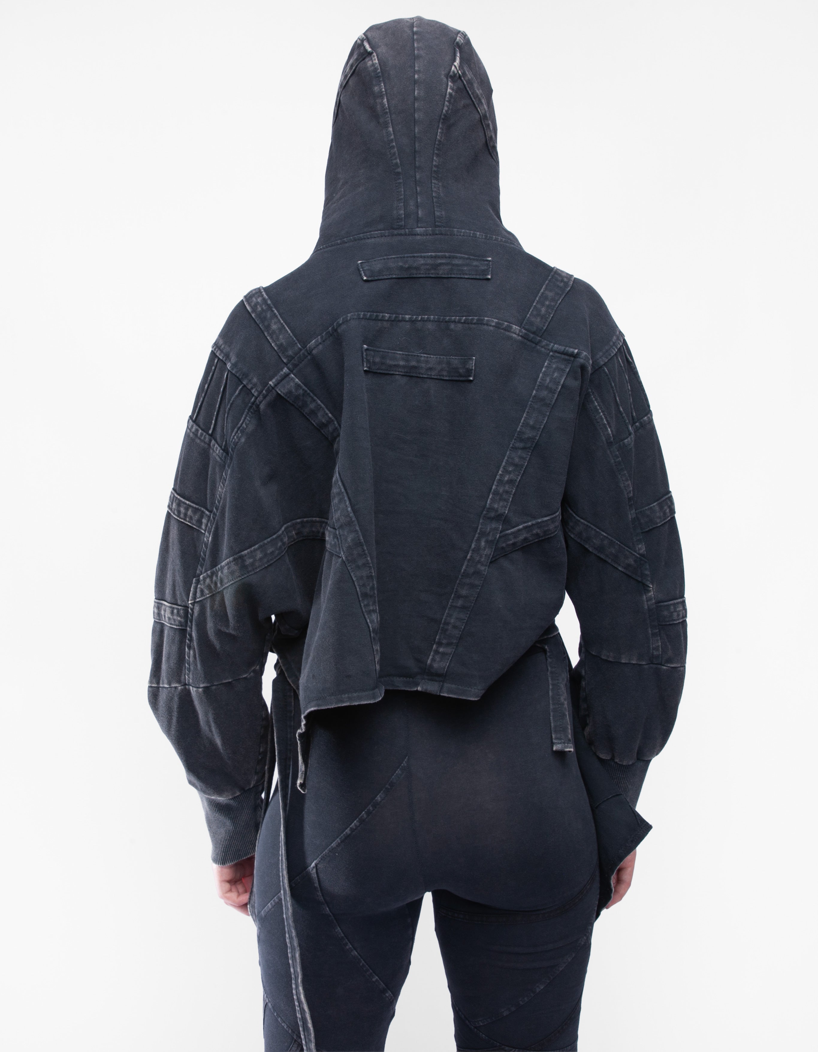 detailed cotton asymmetric short V-neck wrap hooded cardigan