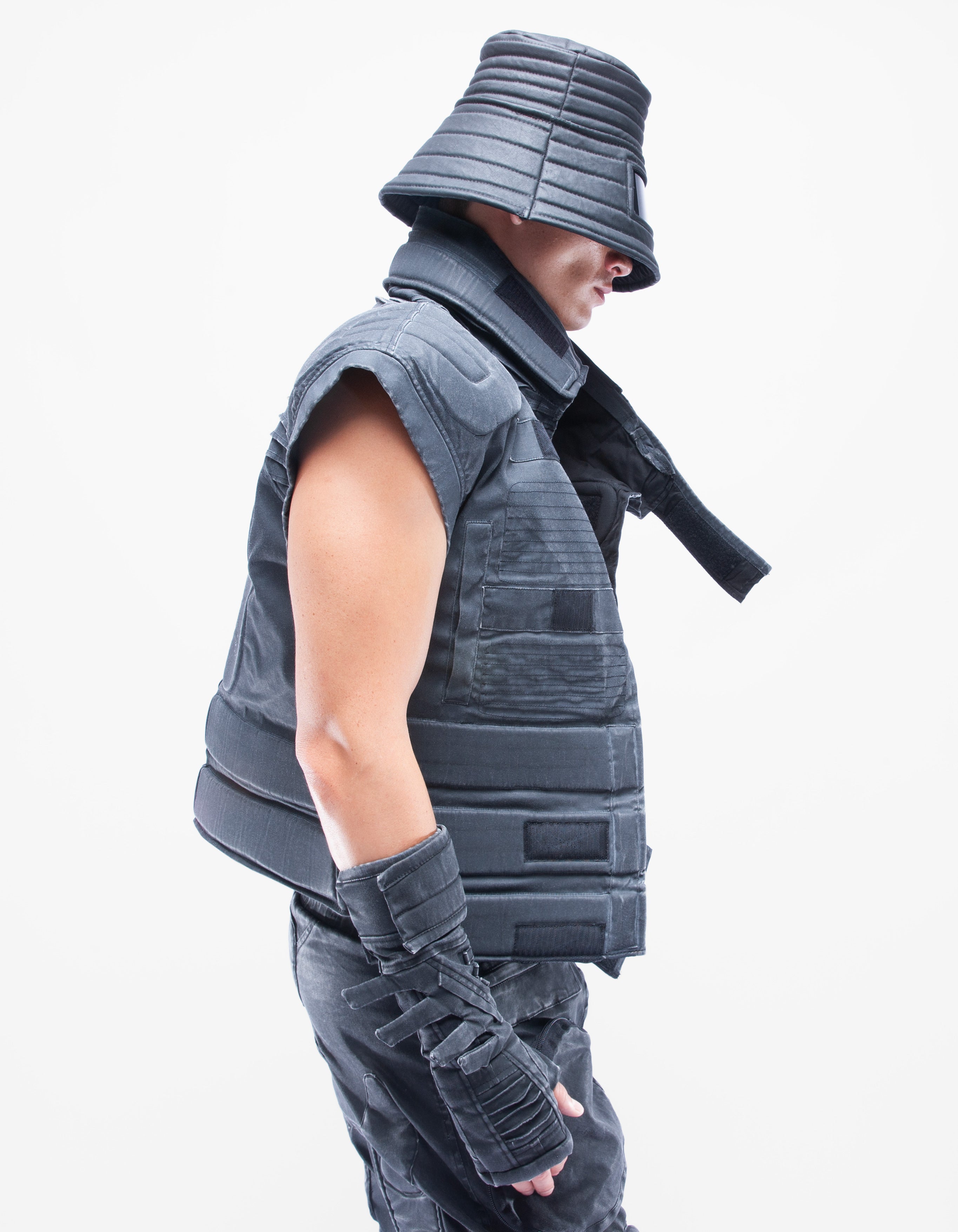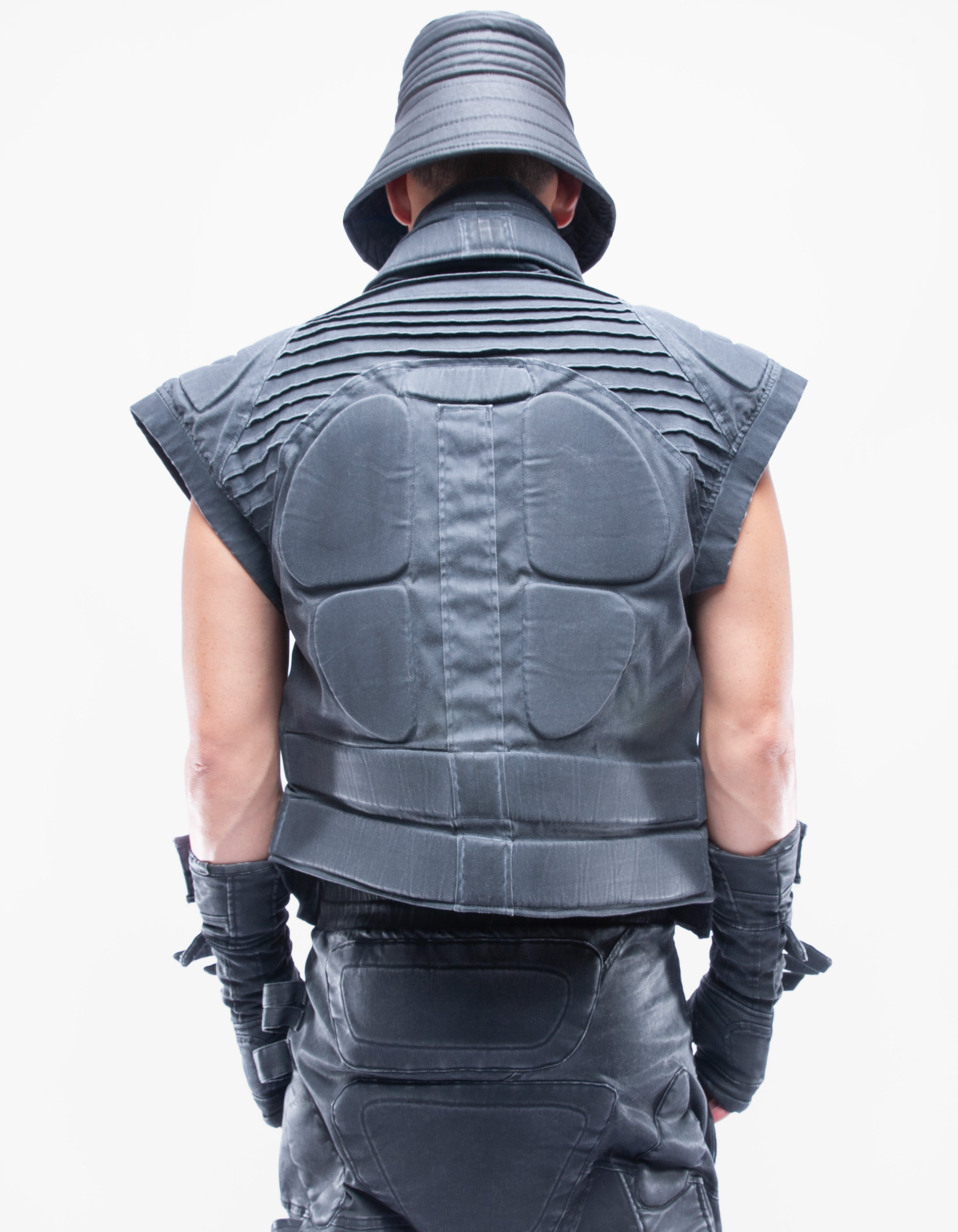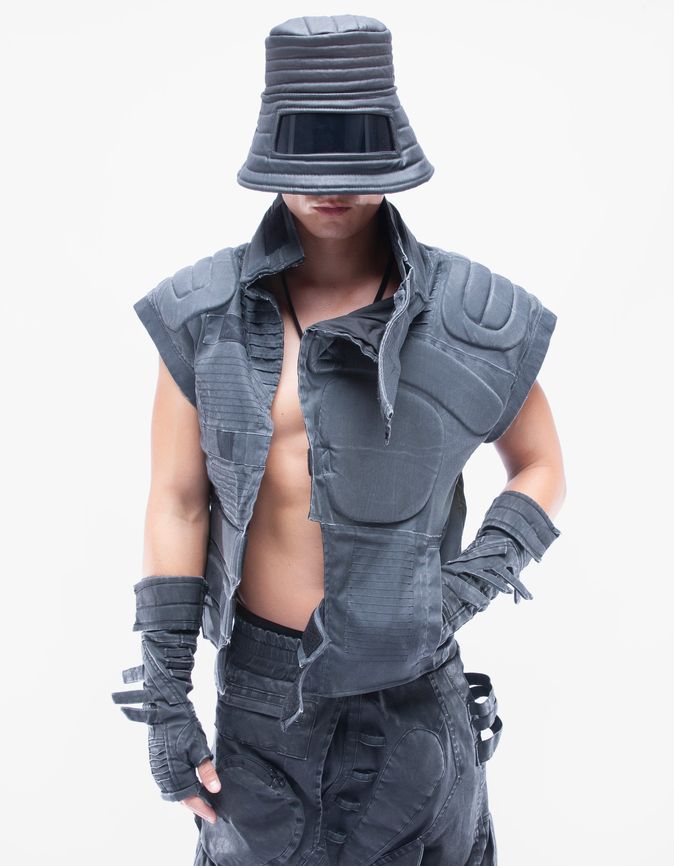 super detailed asymmetric slightly coated elastic denim no sleeve jacket with neoprene pads