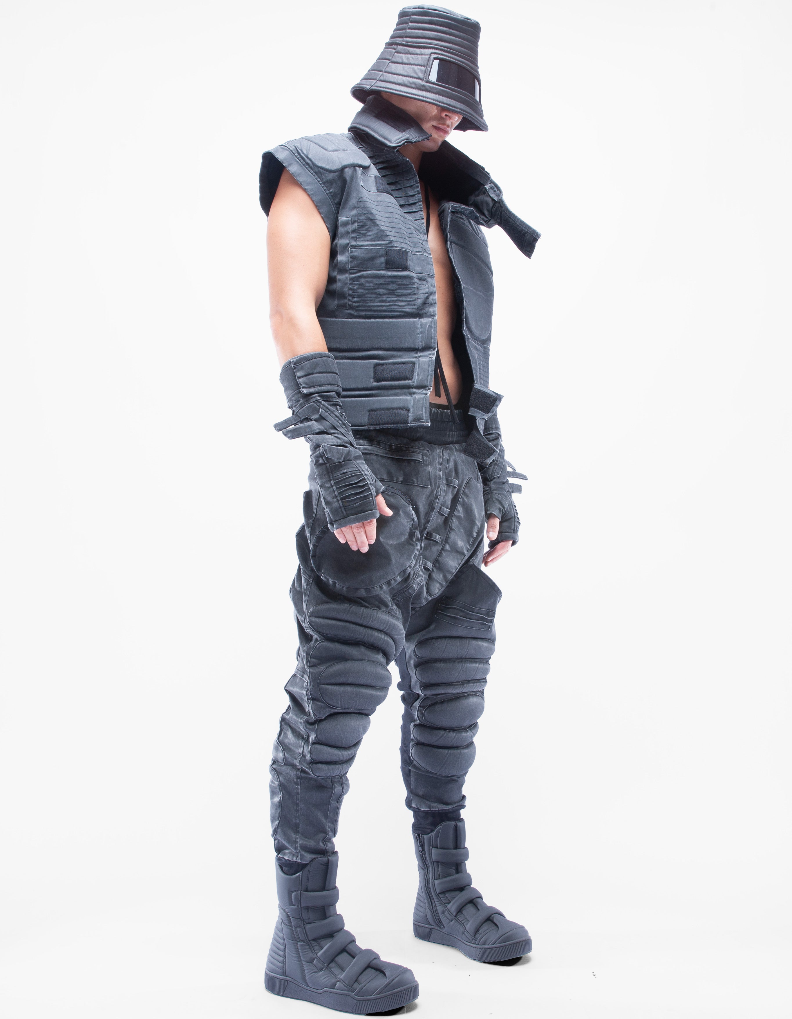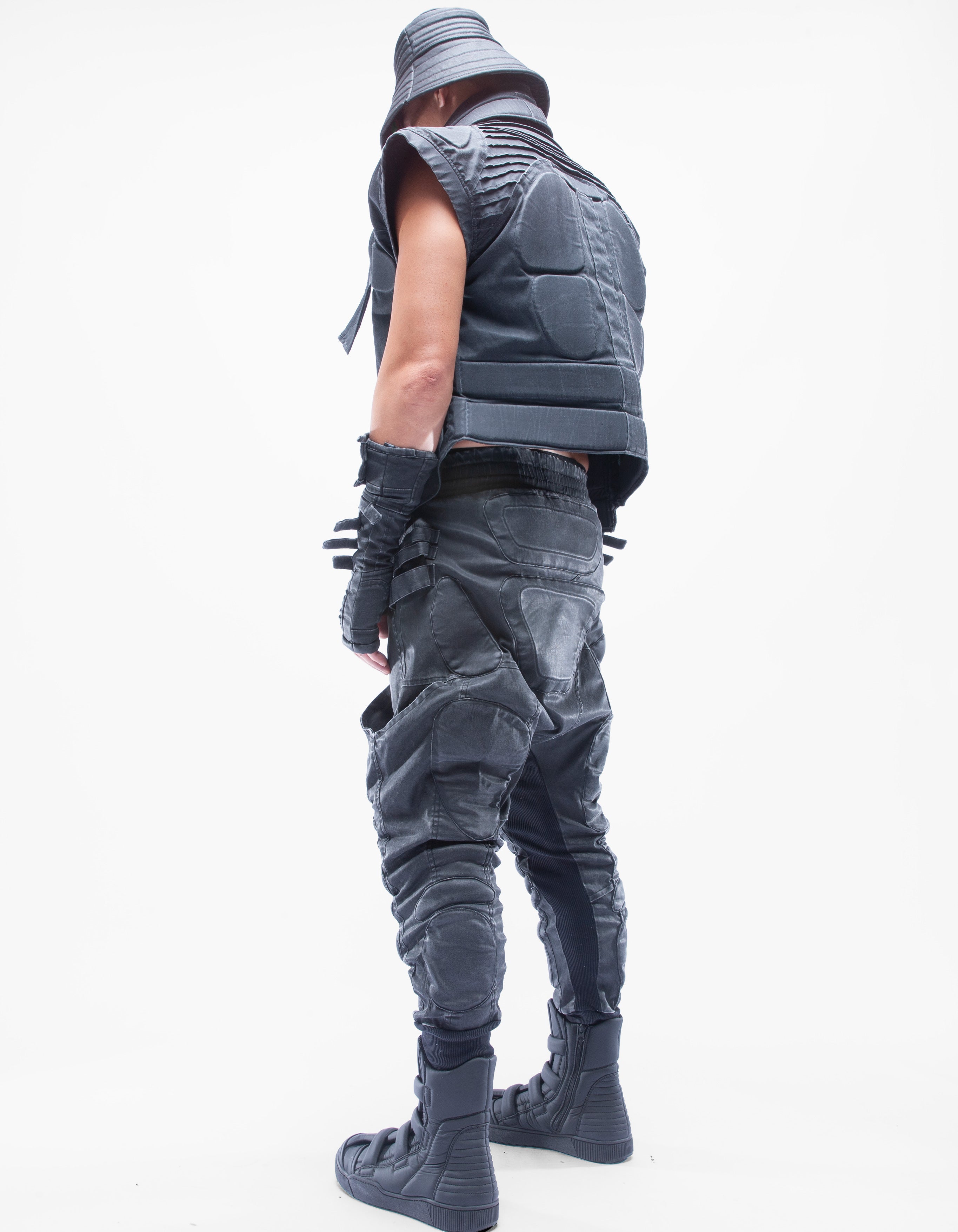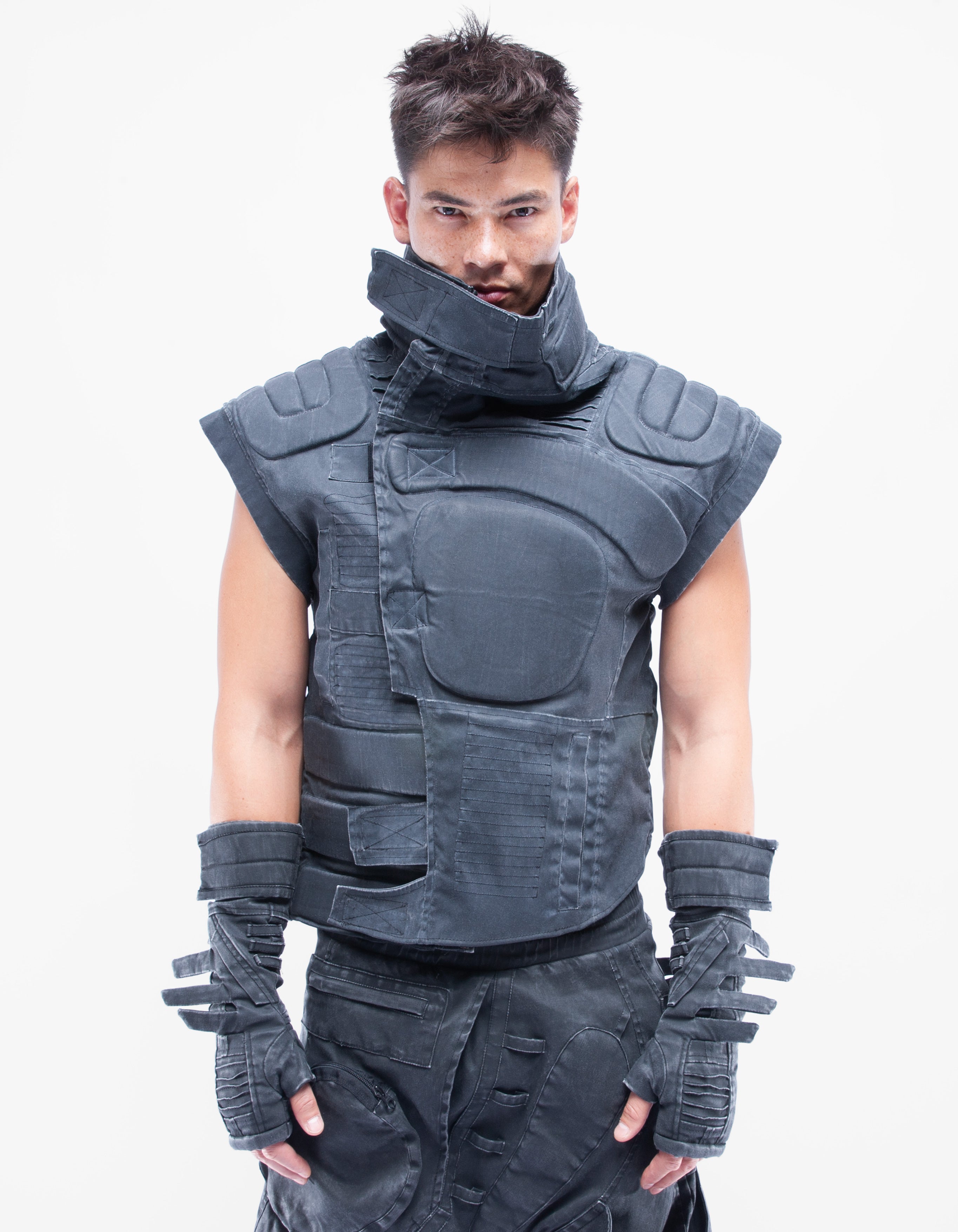 super detailed asymmetric slightly coated elastic denim no sleeve jacket with neoprene pads