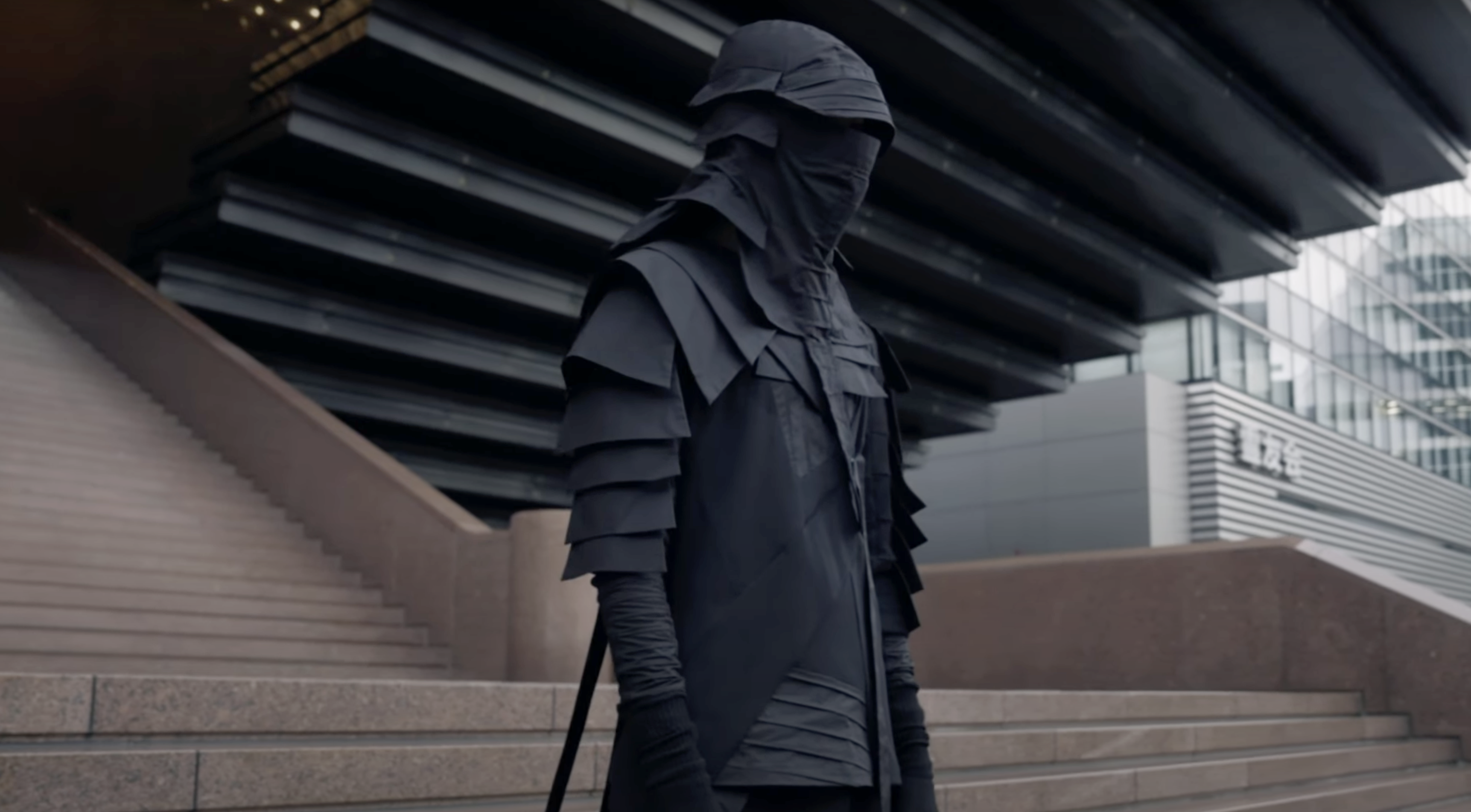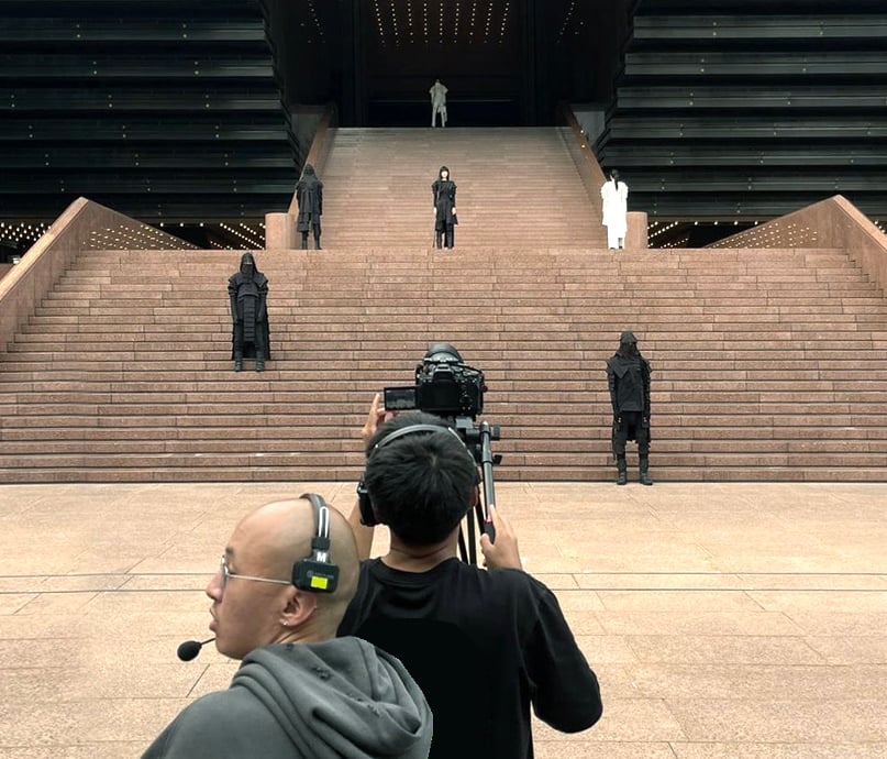 KANNAGARA is a transmission, a portal, a coded language of motion and form. It is about the endless loop—the wheel of time, life, and death, turning over and over in an infinite procession. On the temple’s stairs, figures dressed in black and white flow like a mechanical tide, their movements deliberate, precise. In this controlled symmetry, the inevitable unfolds—the journey toward transformation.